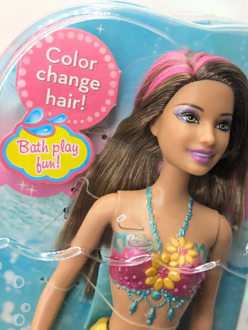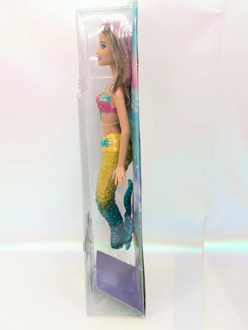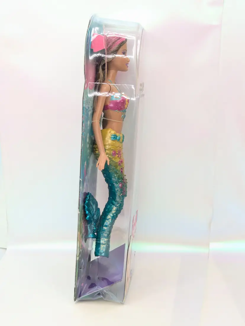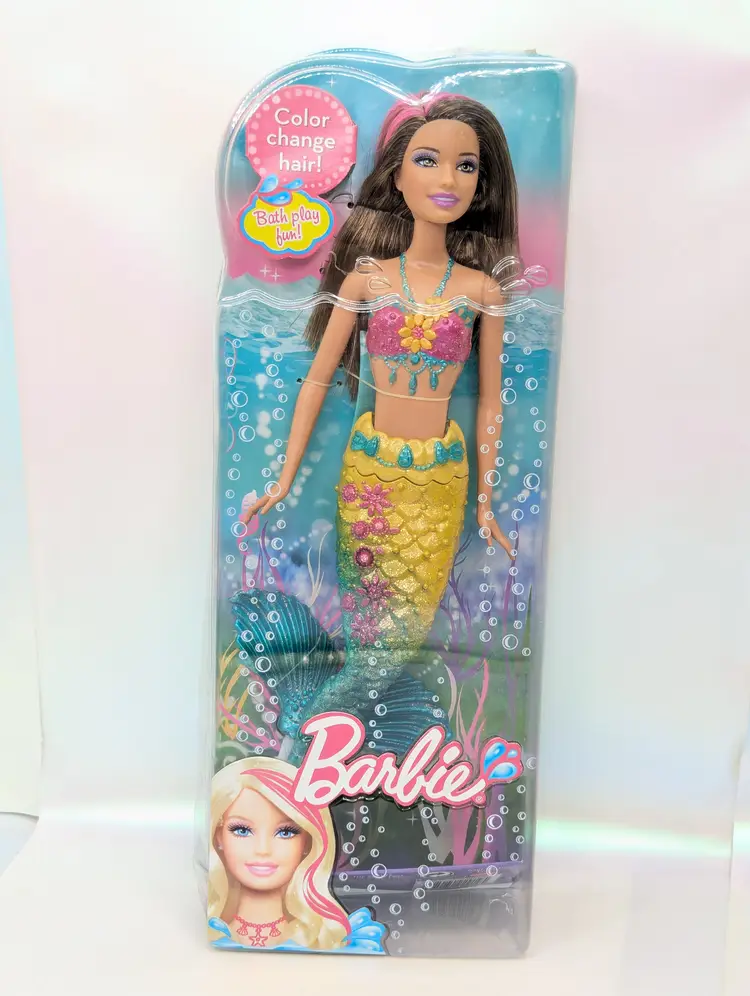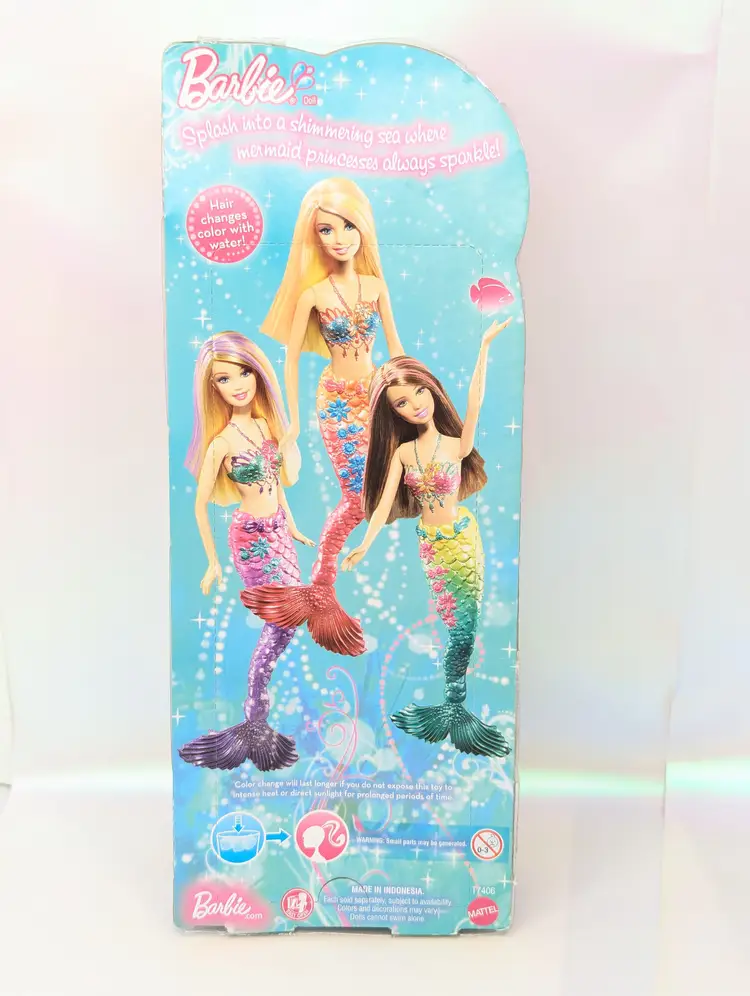Mattel Barbie Turquoise Blue Mermaid Princess doll with Color Change Hair 12" Doll T7406 Brunette In Box - Damaged Box - Unopened. Box has been crushed at the bottom. doesn't show much from the front, you mostly notice when looking at the sides. Doll is in great condition inside, crush did not effect the doll. Item would still be great for display or play. May have some scratches on the plastic or marks from storage. See all photos. Comes from a smoke free, pet friendly home.