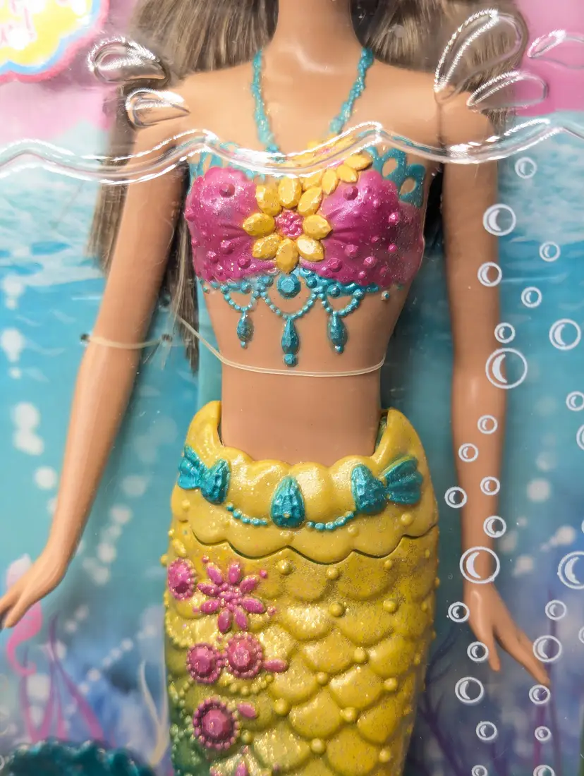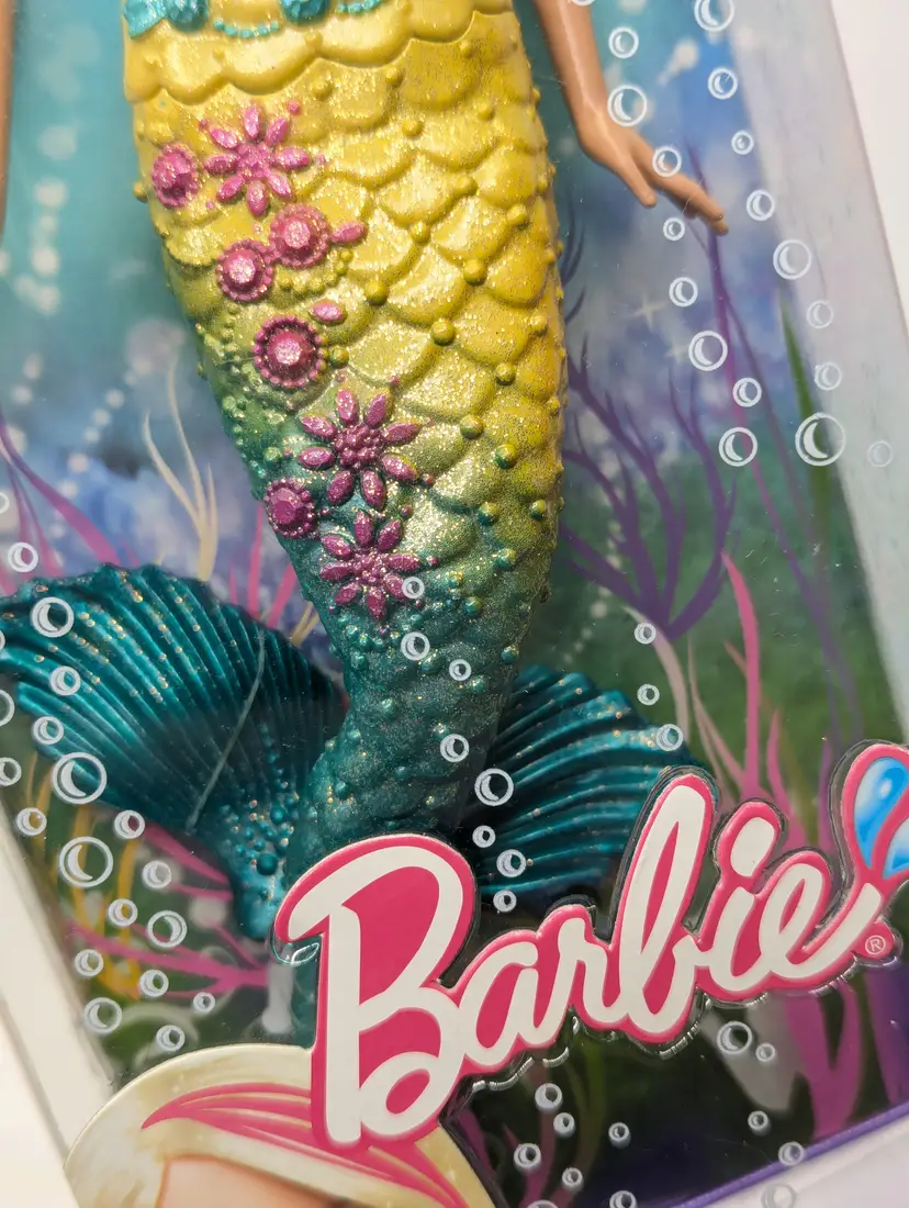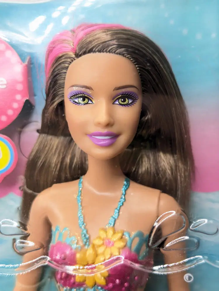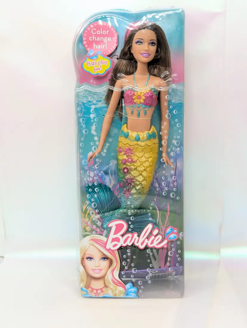 Mattel Barbie Turquoise Blue Mermaid Princess doll with Color Change Hair 12" Doll T7406 Brunette In Box - Damaged Box - Unopened. Box has been crushed at the bottom. doesn't show much from the front, you mostly notice when looking at the sides. Doll is in great condition inside, crush did not effect the doll. Item would still be great for display or play. May have some scratches on the plastic or marks from storage. See all photos. Comes from a smoke free, pet friendly home.