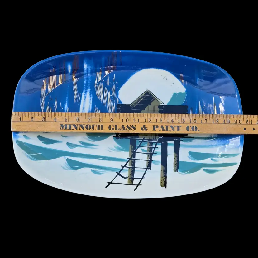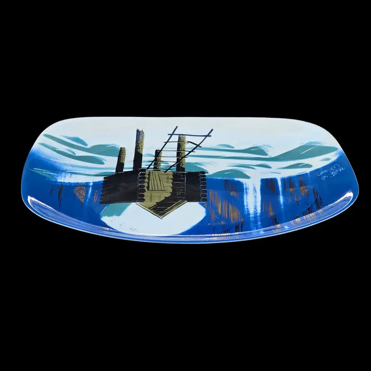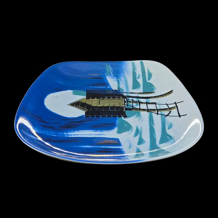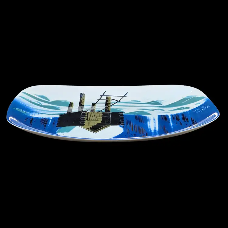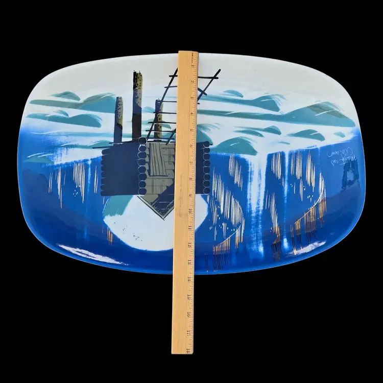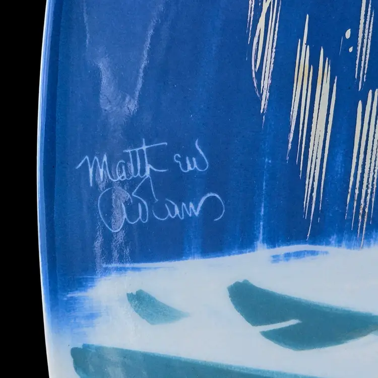 Matthew Adams Pottery Platter Alaska Signed Numbered Hand Painted Log Food Cache. Used condition with fleabite along rim, scratches, sticker residue, paint splash, etc. Please view all the photos and please ask any questions prior to purchase when possible.