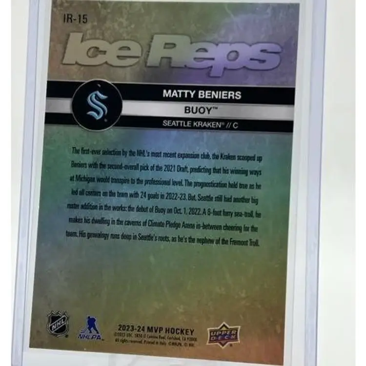 Matty Beniers Buoy 2023-2024 Upper Deck MVP Hockey Ice Reps Seattle Kraken. Shipping is $1 for the first card, +$0.50 for additional cards, and ships PWE within 1-2 days.