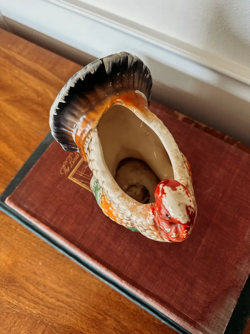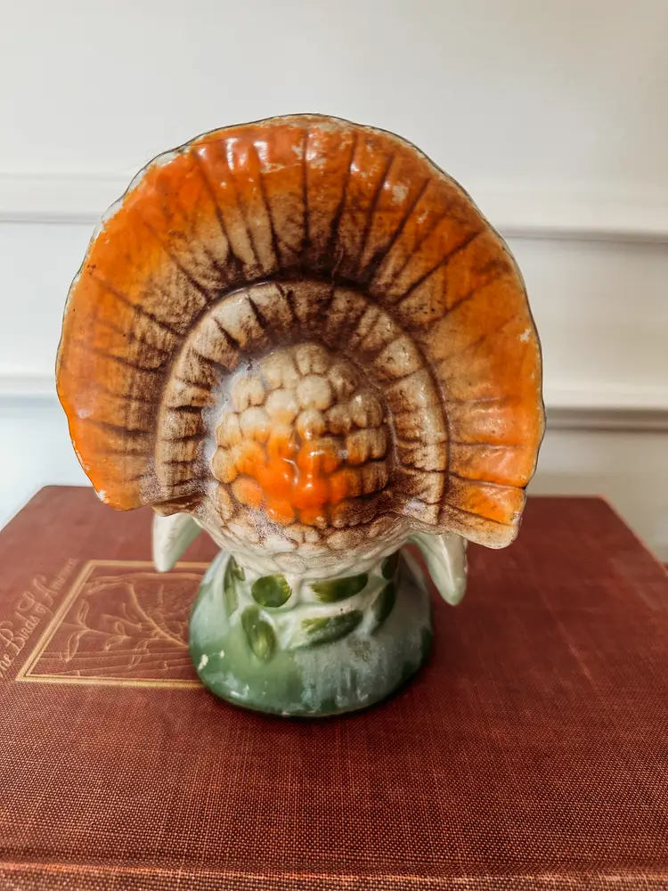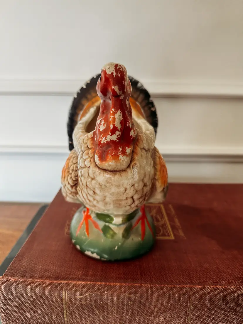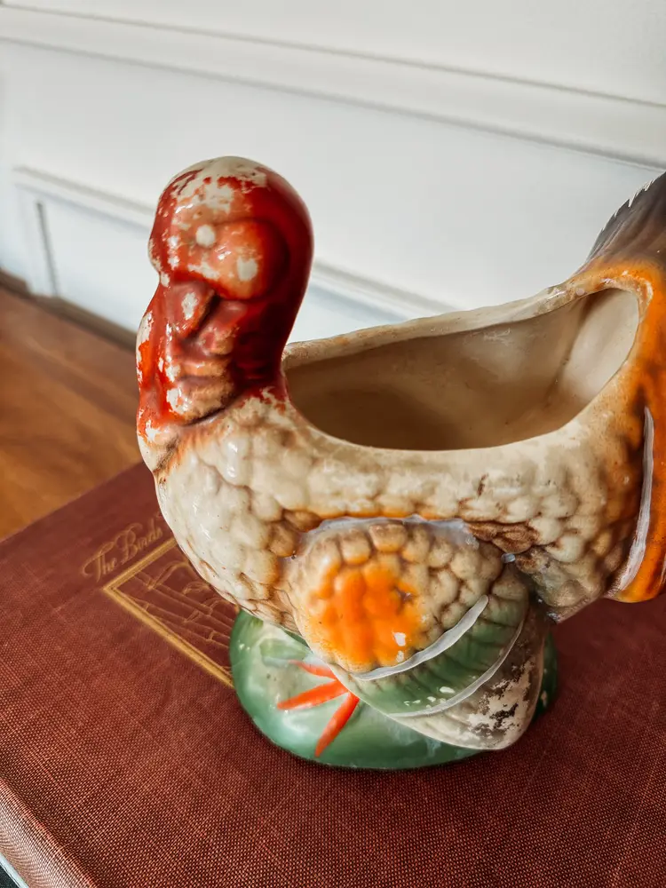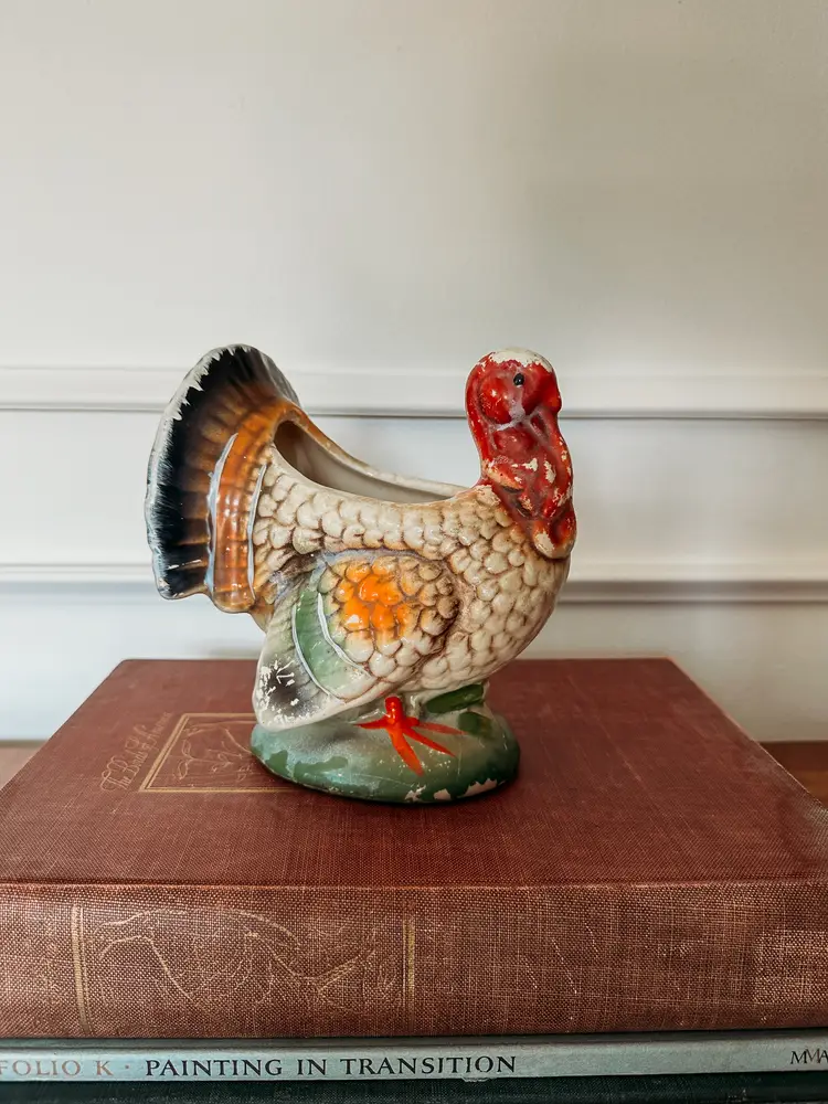 Someone needs to buy this quickly before I decide I need to keep it in my own Fall collection! As shown in the images, there is a lot of worn off color on this 1970s planter, but I believe it adds to the charm of this Fall decoration! He's just so cute and the colors are stunning! Add a plant like a mum or a floral arrangement, use for cranberry sauce or turn into a DIY candle! I also like to display my vintage silverware in a similar one on my dining room buffet during the Fall season! So many opportunities for this charming turkey!