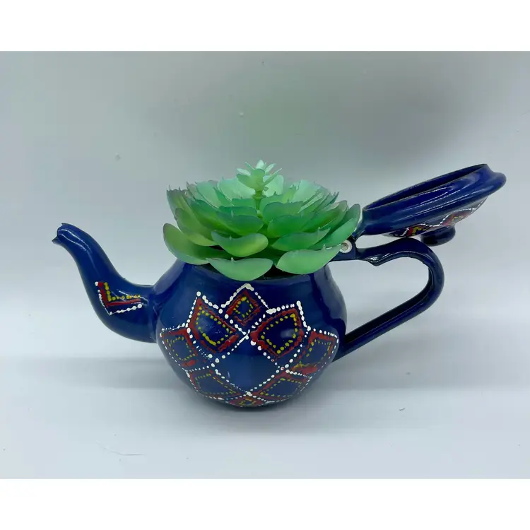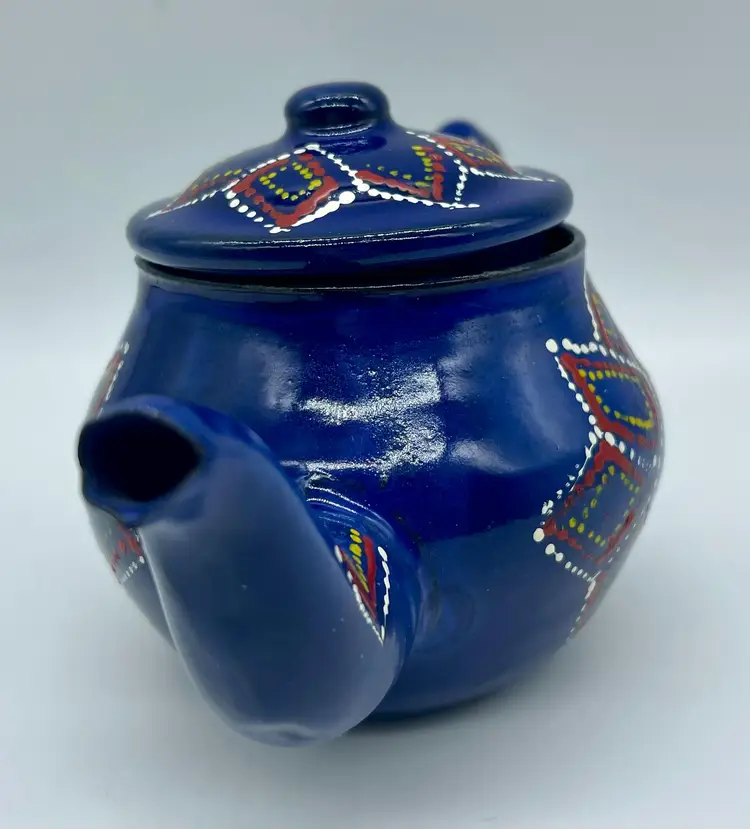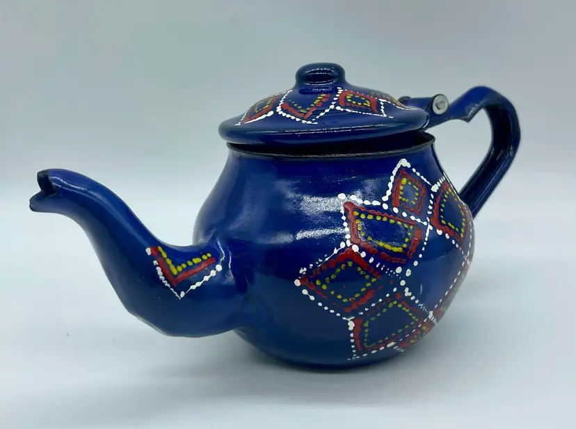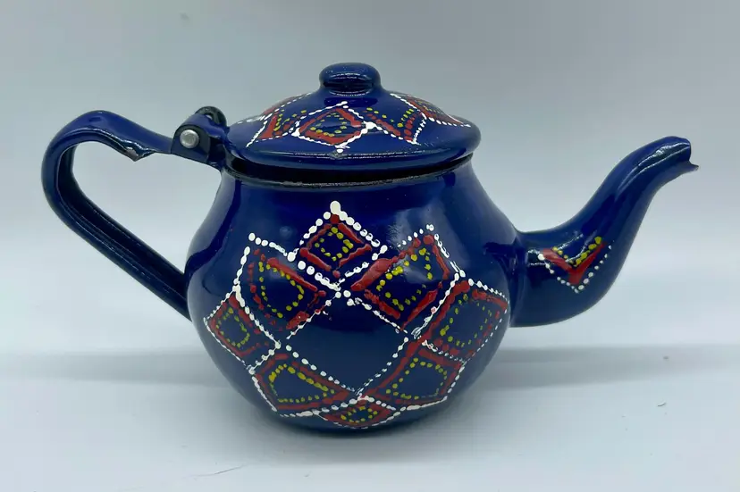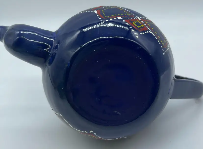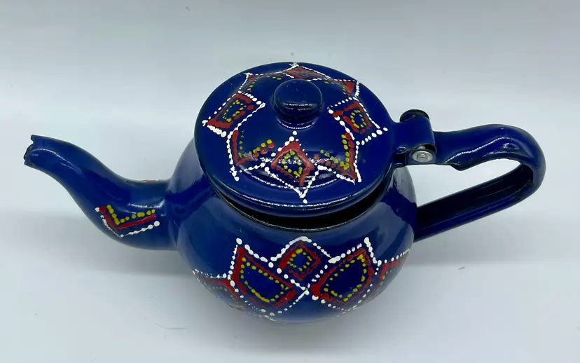 Each teapot has a unique design. They are pieces that require great dedication and delicacy since they are painted point by point. Good pre-owned condition. Some wear on the handle. No signature or markings. Dimensions: 7.5" w x 4"tall