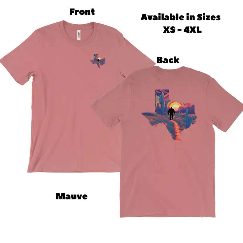 🌵 On the front, a minimalist Texas outline is filled with vibrant desert hues, a cactus bloom, and our signature Bigfoot vibe. 🌞 On the back, Bigfoot wanders through a psychedelic Texas sunset, framed by surreal saguaro and a painted sky – a visual ode to the beauty and mystery of the Lone Star state.