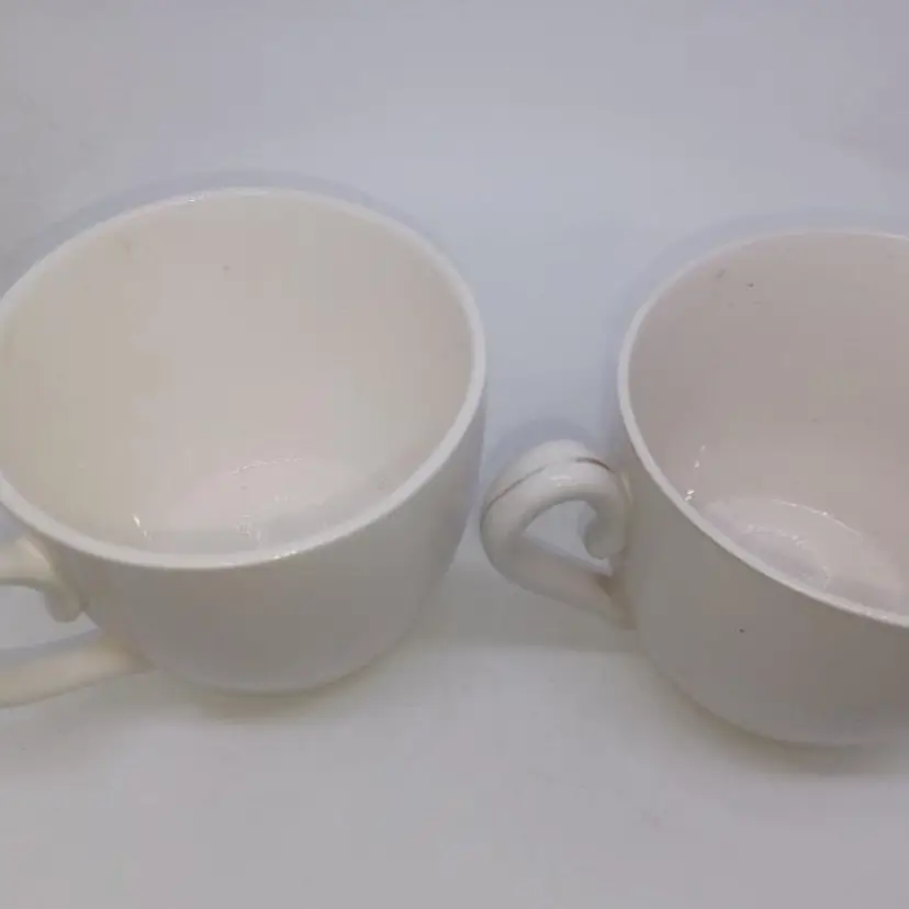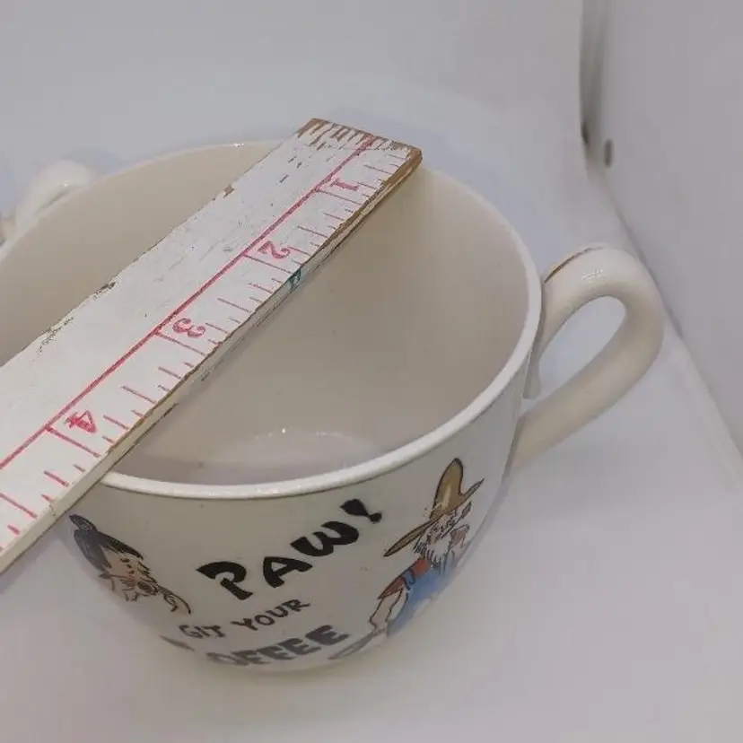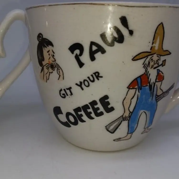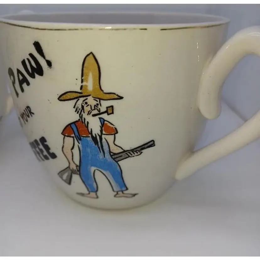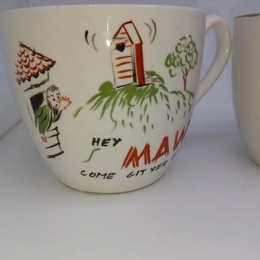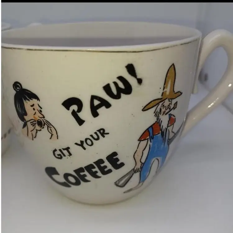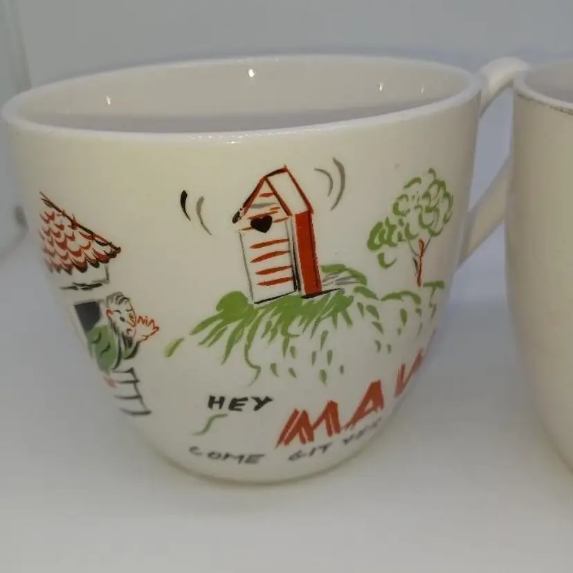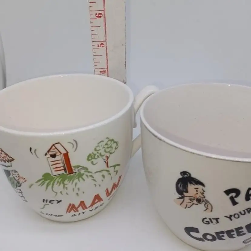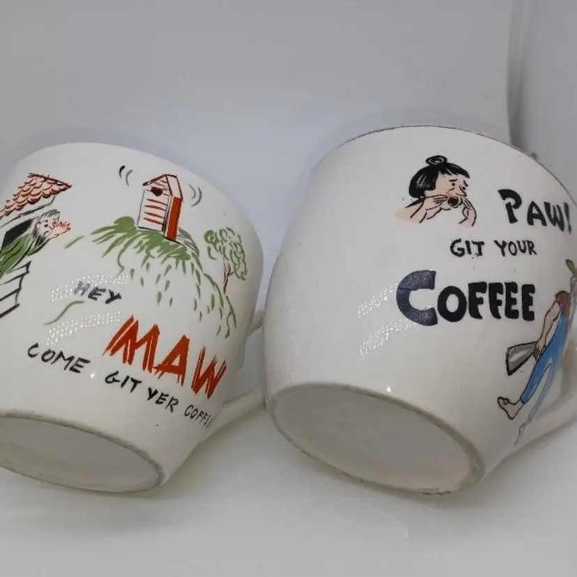 These post-war Japan pottery mugs are quite large (16oz ea) and have a beautiful patina of finely-crazed glaze. Most of these had a hillbilly theme as evidenced by the spelling 'Maw' and 'Paw' and the letters appearing as wood sticks. These have a beatnik spin to them which makes them quite unusual. Please see all pictures is there the best description these mugs are in good vintage condition they do show their wear the Palma definitely is has somewhere to the 24 Karat highlights on it doesn't seem the ma mug ever had the 24K highlights.