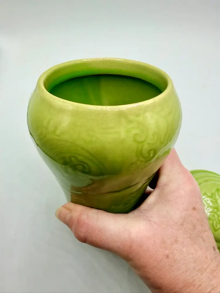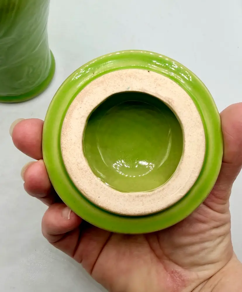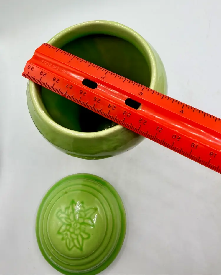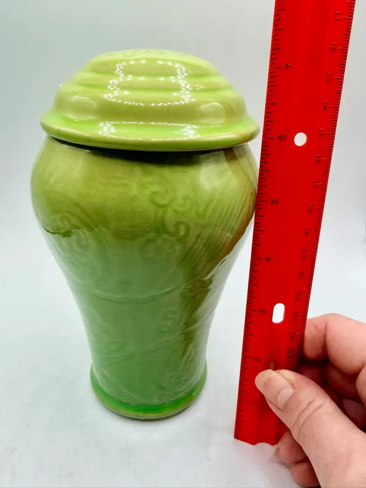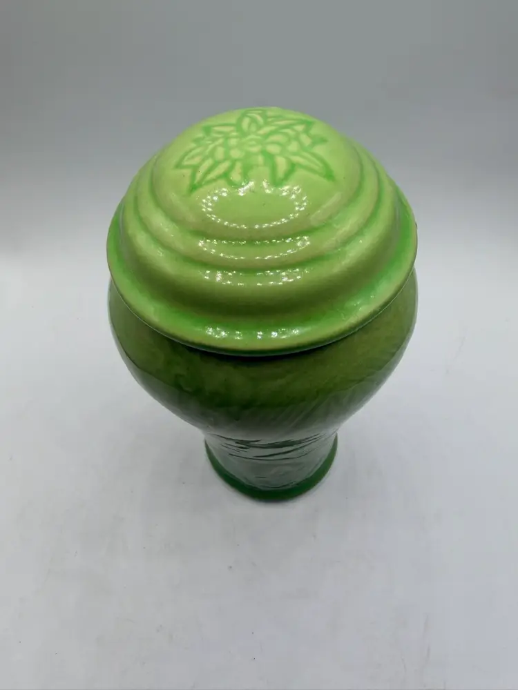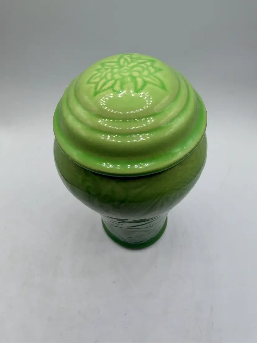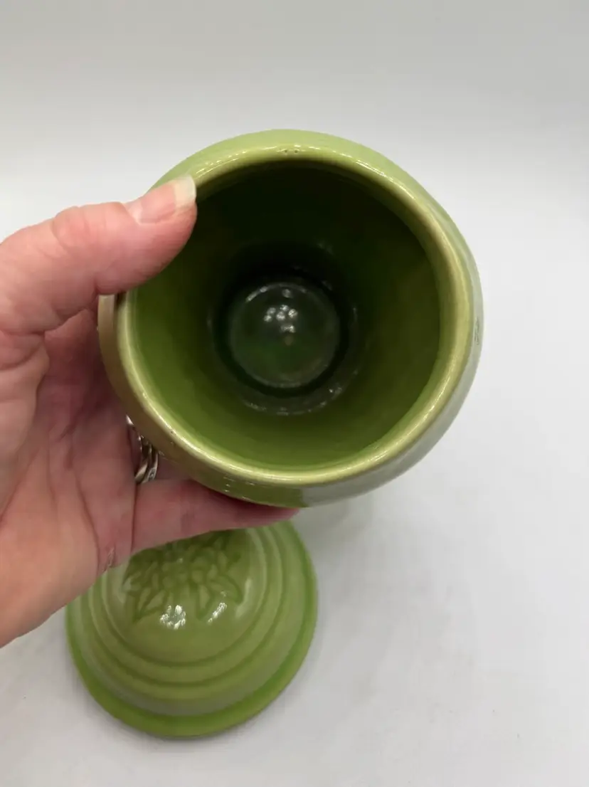 The Max Factor 1970s Covered Ceramic Container Jar for Khara Fantasy Milk Bath in green is a unique decorative collectible item that reflects the style and aesthetic of the late 20th century. Standing at 7.5 inches tall, this vase features a fantasy theme, making it a whimsical and eye-catching piece to add to any collection. Made of ceramic, this vintage item captures the essence of the 1970s era with its vibrant green color and retro design. Perfect for those who appreciate collectibles from this time period, this Max Factor container jar is a nostalgic and charming addition to any home decor.
