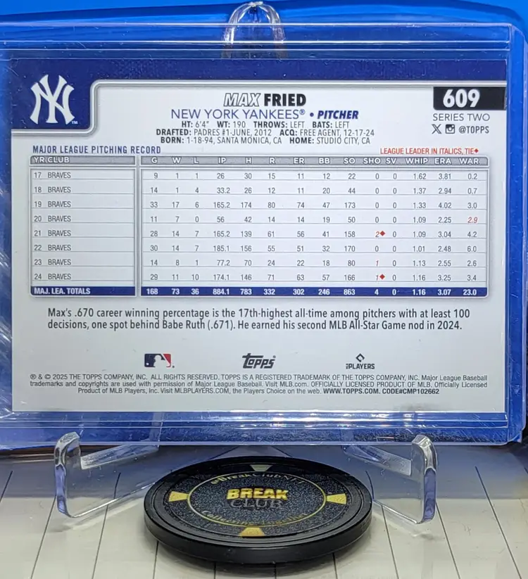Max Fried 2025 Topps Series 2 Pink Sand Glitter Variation #609 New York Yankees