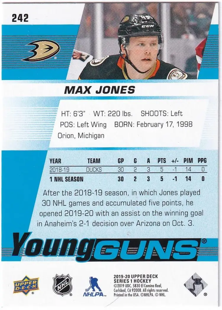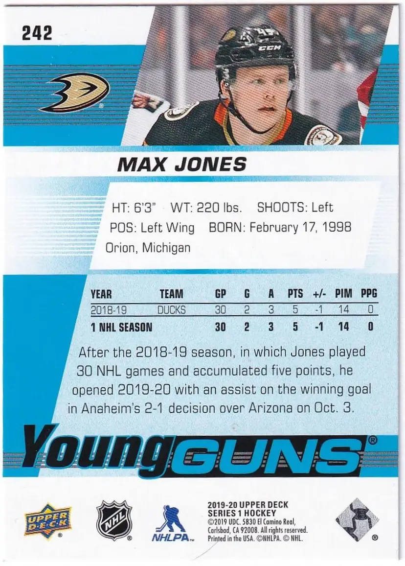 2019-20 Upper Deck #242 Max Jones YG RC Anaheim Ducks Young Guns