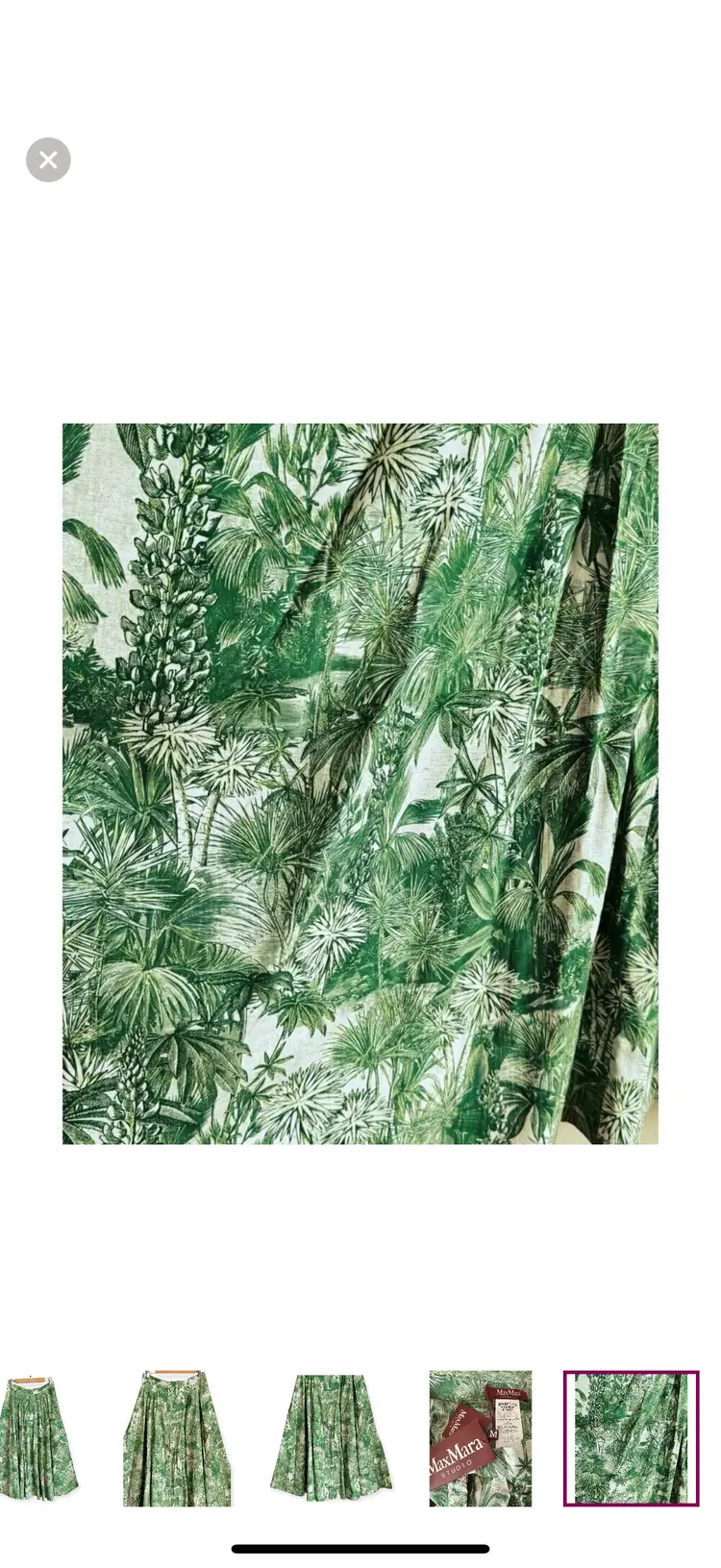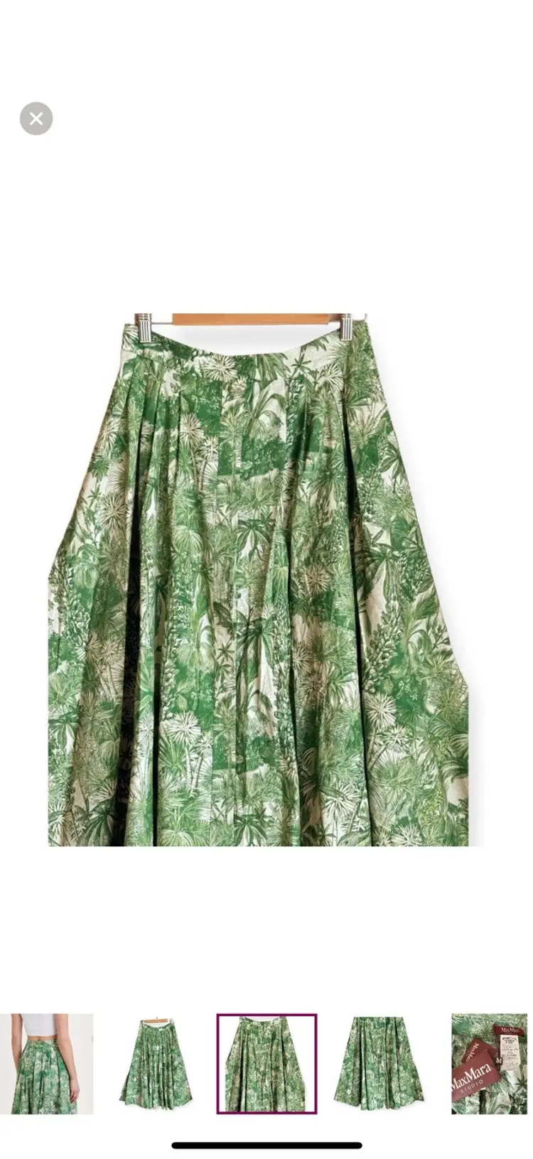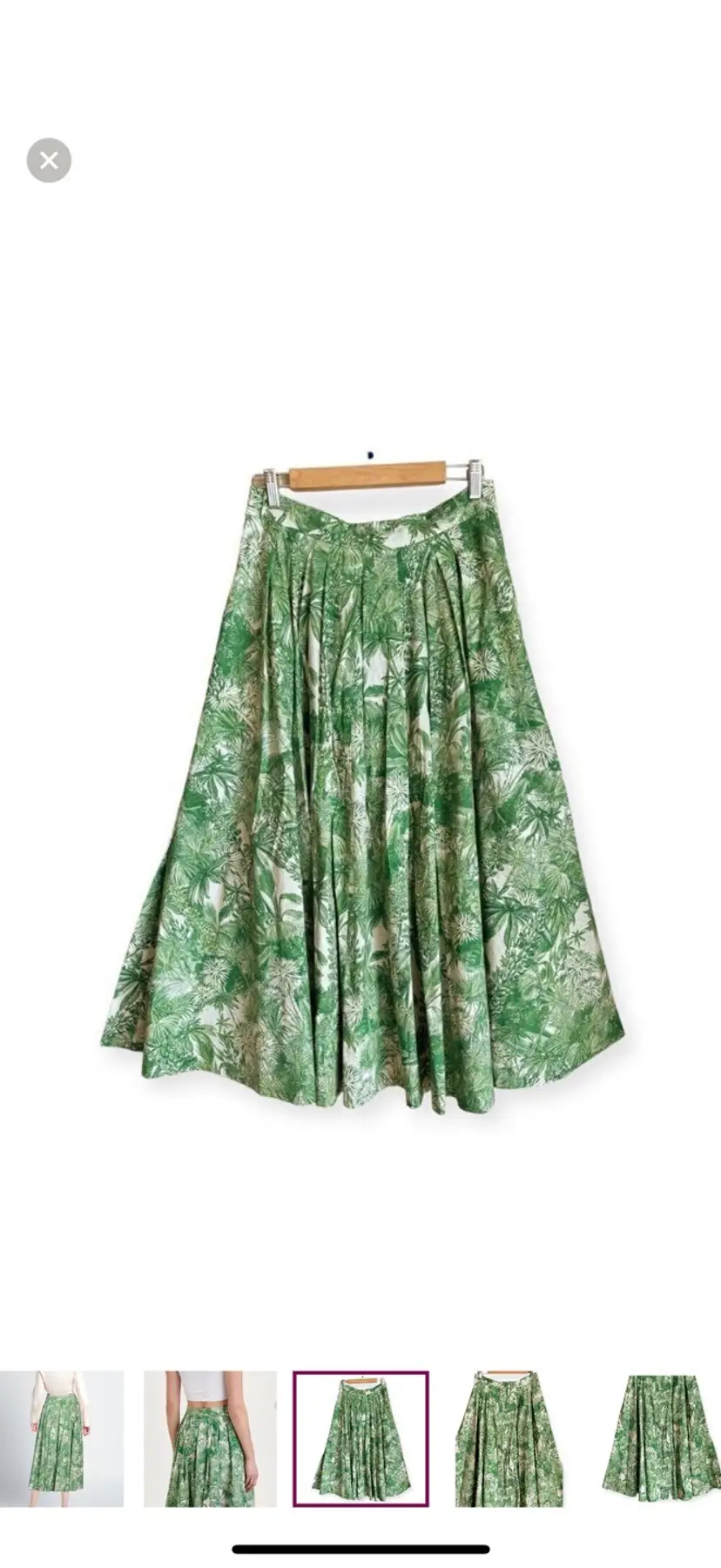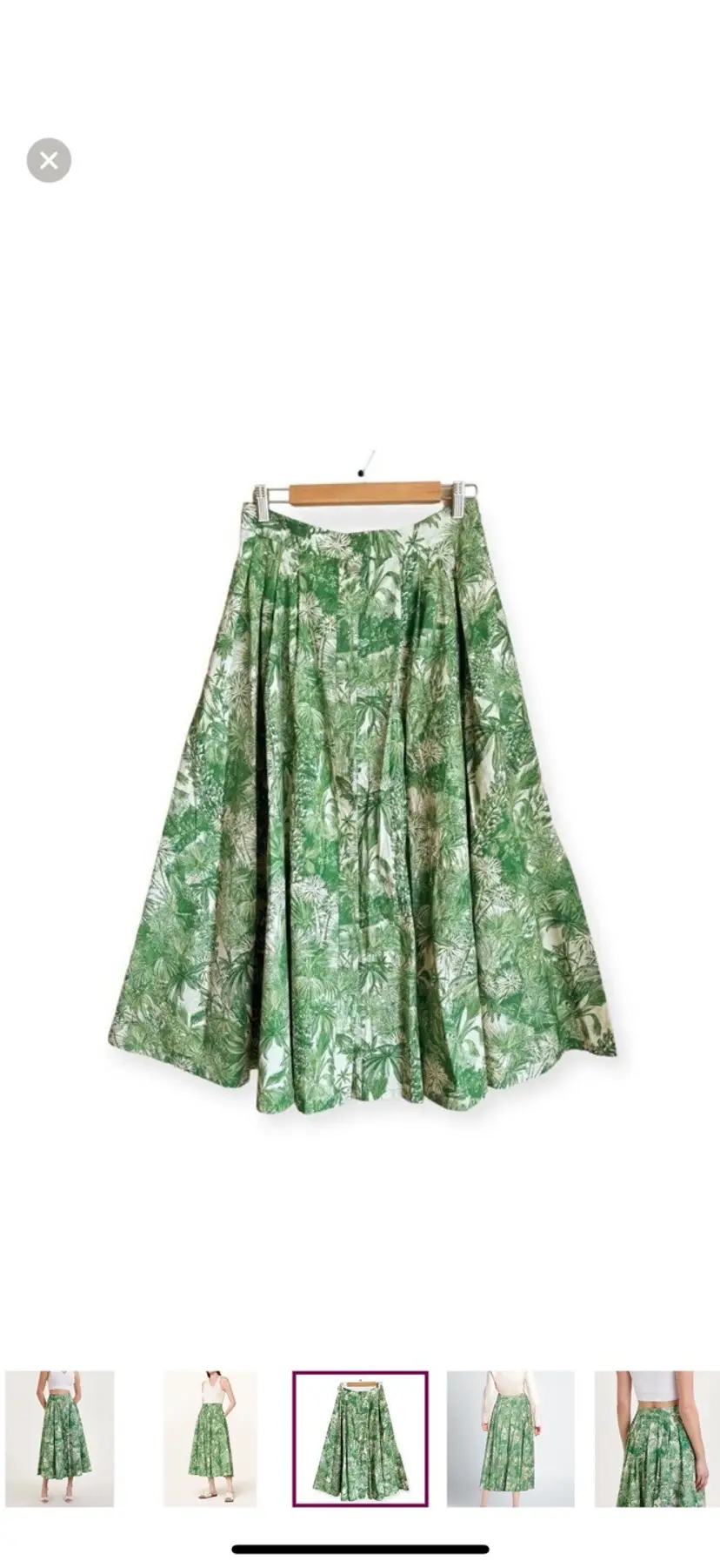 -Midi skirt -Button down front -Pleated -Side pockets -Unlined -Gorgeous tropical print -Greens & ivory -NEW WITH TAGS $625 -Size 10 -ALL MEASUREMENTS APPROXIMATE Waist 14.5” Length 36”
