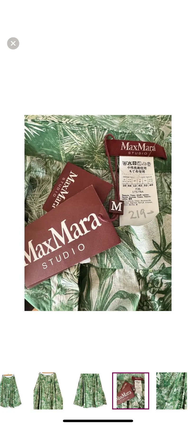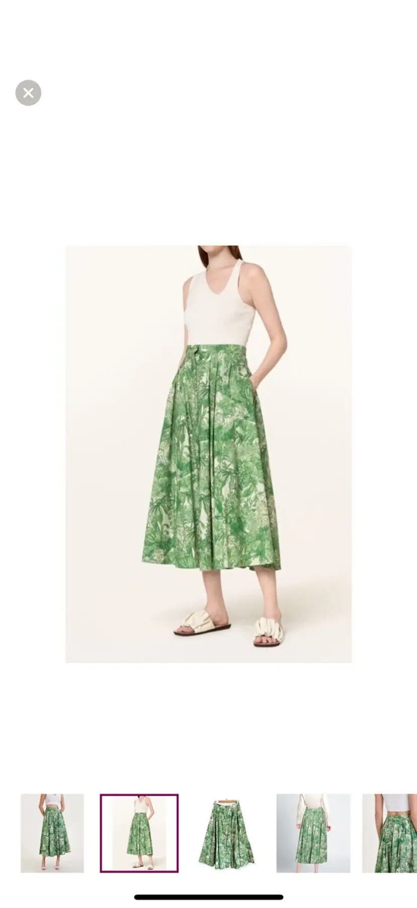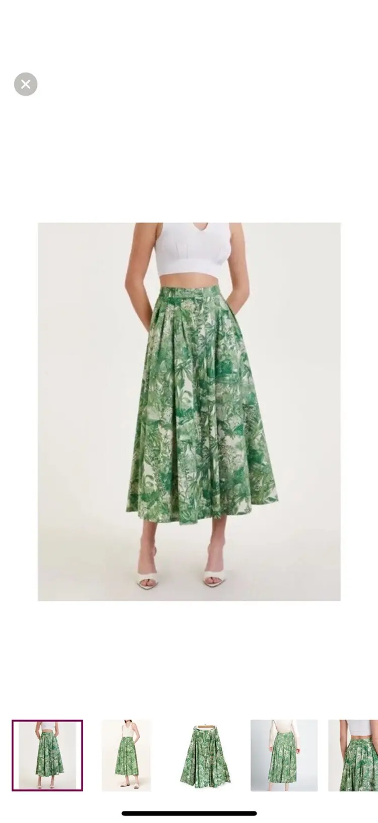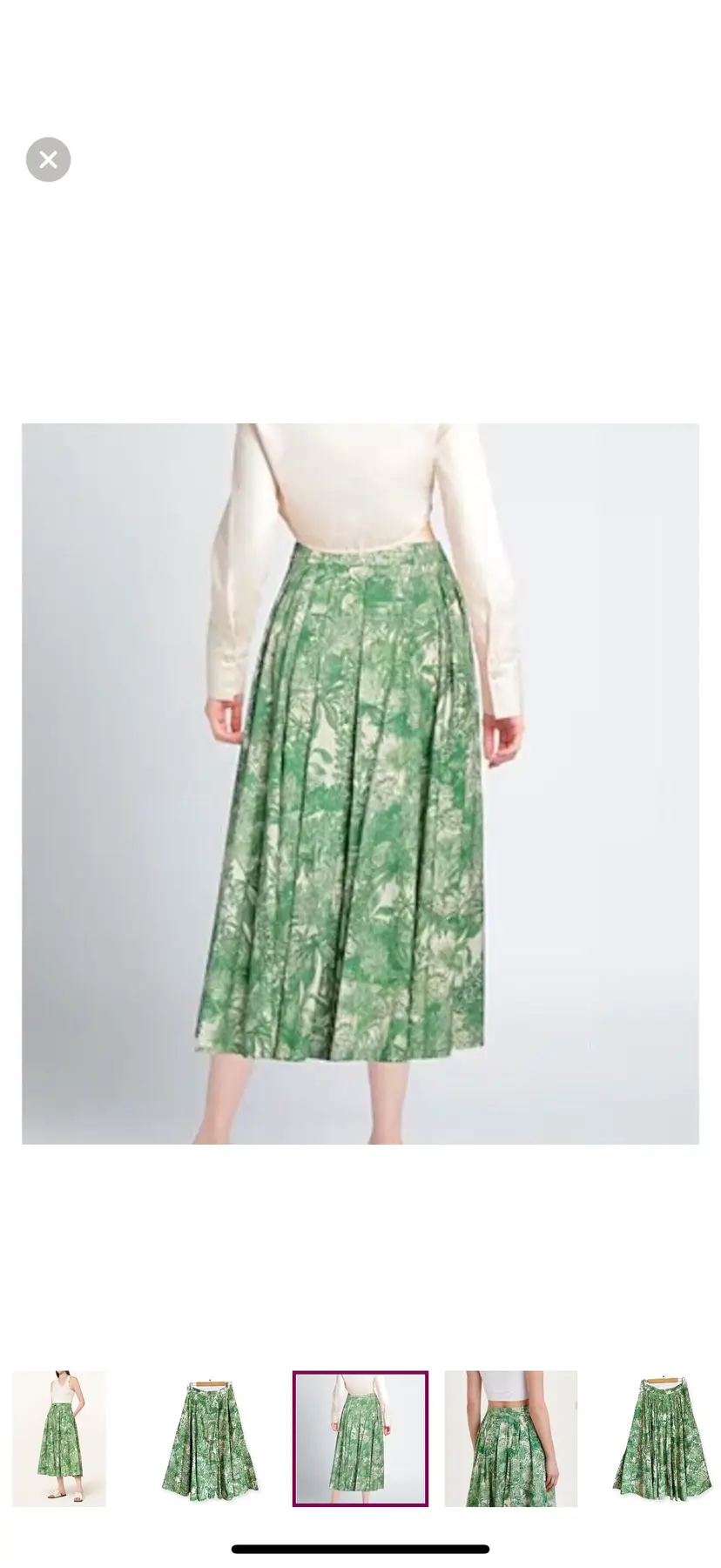 -Midi skirt -Button down front -Pleated -Side pockets -Unlined -Gorgeous tropical print -Greens & ivory -NEW WITH TAGS $625 -Size 10 -ALL MEASUREMENTS APPROXIMATE Waist 14.5” Length 36”
