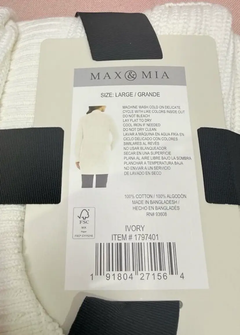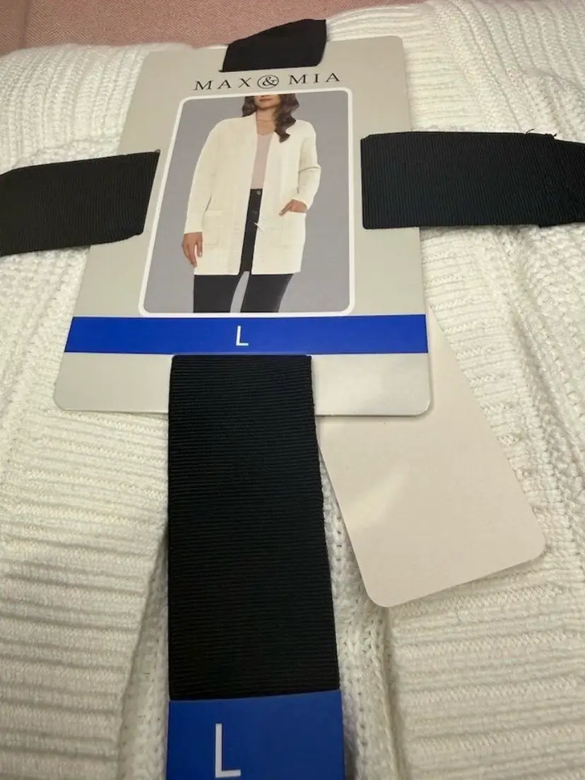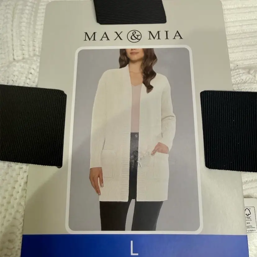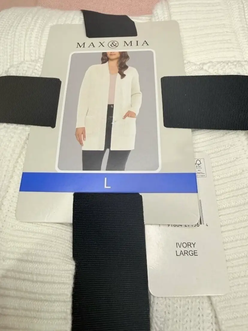 Keywords: Max & Mia, ivory cardigan, cotton sweater, women's cardigan, open front, casual wear, all seasons, machine washable, size large, long sleeve, two pockets, new with tags.