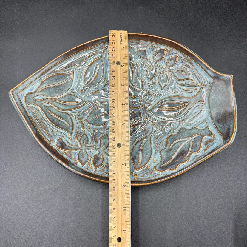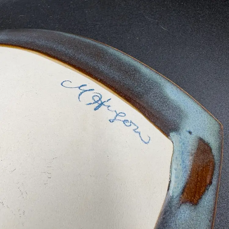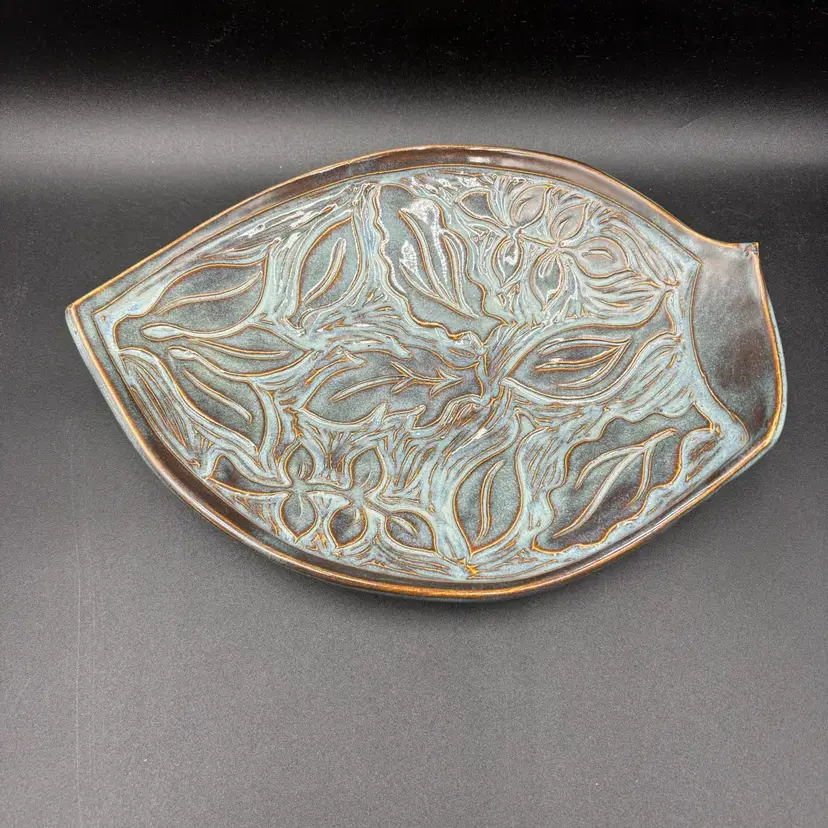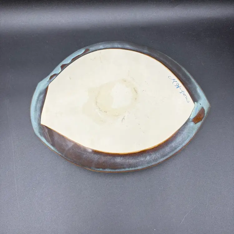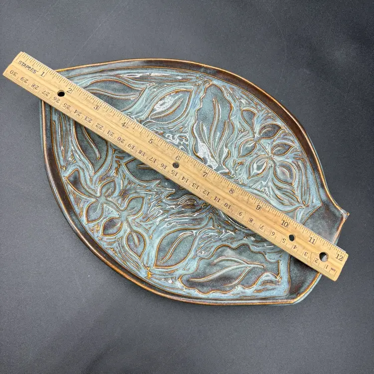 Stunning pottery created by Vermont based artist Maxine Hugon. Leaves within a leaf in beautiful blue hued glaze complimented with brown outlines. 8” W x 10.5”L