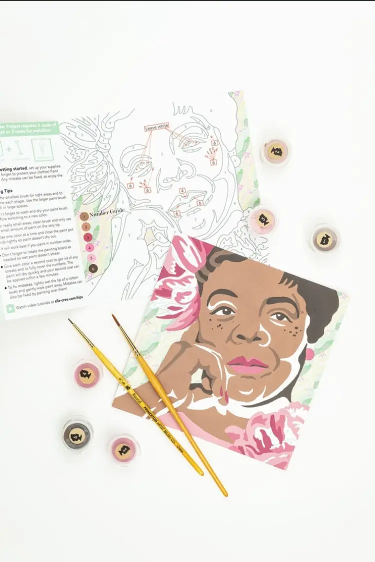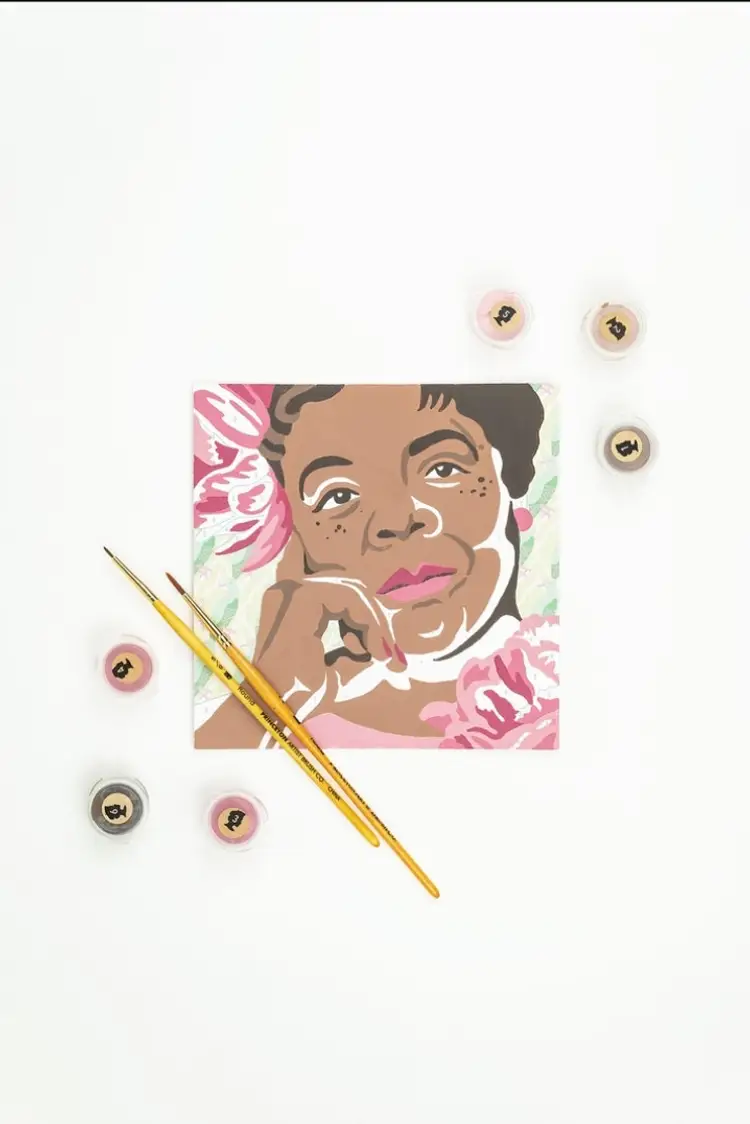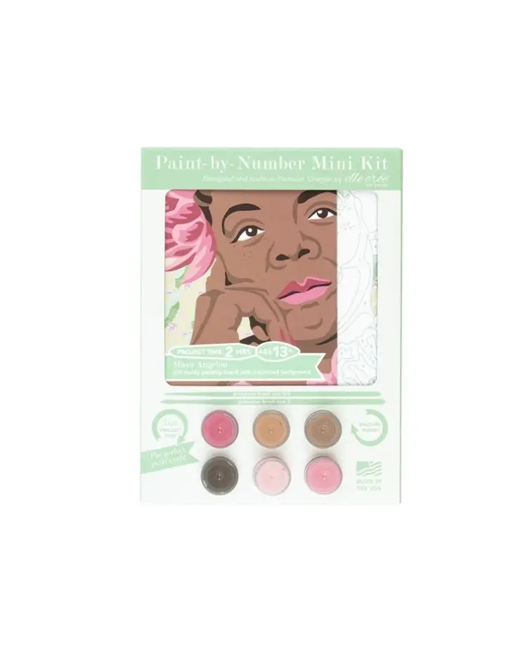 MIA Angelou mini paint-by-number kit (6x6 painting board) depicts this talented author and poet known for her poignant work about the Black experience. The preprinted background sets this icon against vintage wallpaper. This DIY painting kit includes a biography about this inspirational history maker. Completing the acrylic painting can take between 1-2 hours and be displayed alone or in a gallery wall as your new handmade home decor. These craft kits are recommended for adults or children aged 13 and older. History Maker paint-by-number kits make the perfect educational and empowerment activity, or great gifts for educators! Paint-by-number mini kits have our shortest project time (only 2 hours), which makes them the perfect craft project for a child’s birthday party, an event, or a group activity! The mini kit painting surface is made from sturdy and smooth 100% paper board so it's easy to paint wherever you are. Each DIY kit is comprised of locally sourced, USA- 2/28/25 #hl clst tp