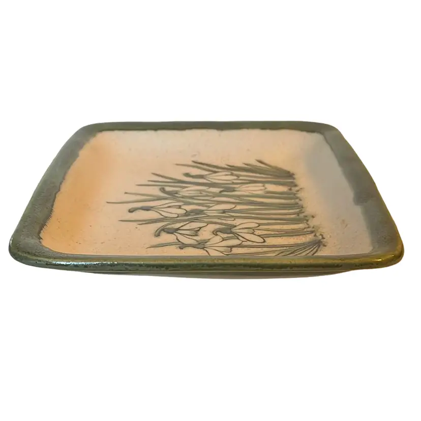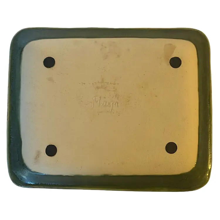 Lovely nature inspired tray by Roanoke VA pottery artist MAYA BOHLER. Measures 9.25” x 8.5” x 1”. Speckled cream and green glaze. Very good vintage piece- no chips or cracks, a little staining to the unglazed back.