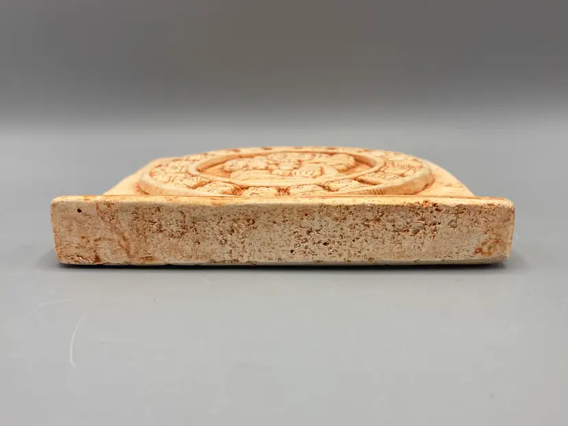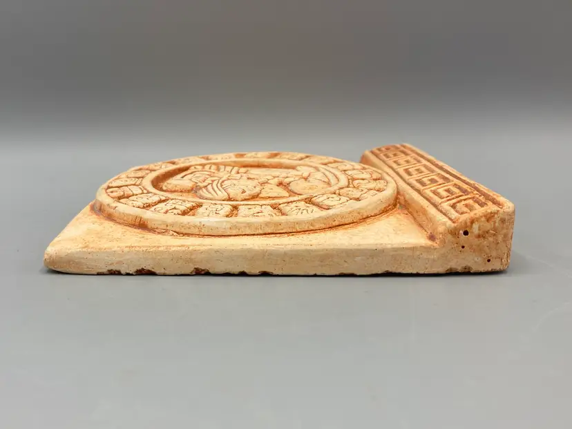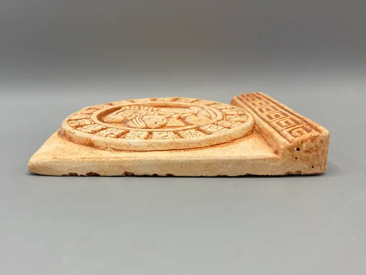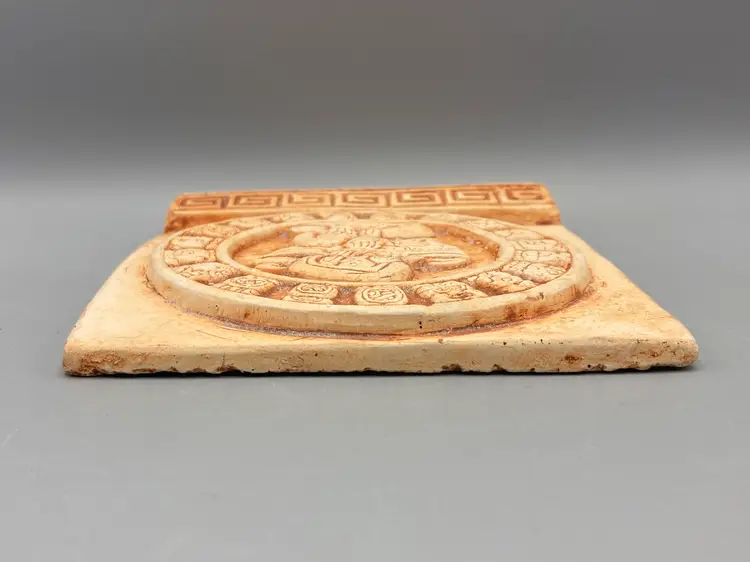 This tile is in good condition. It measures approximately 5 1/4" x 5 1/4" x 3/4" deep at the deepest point.