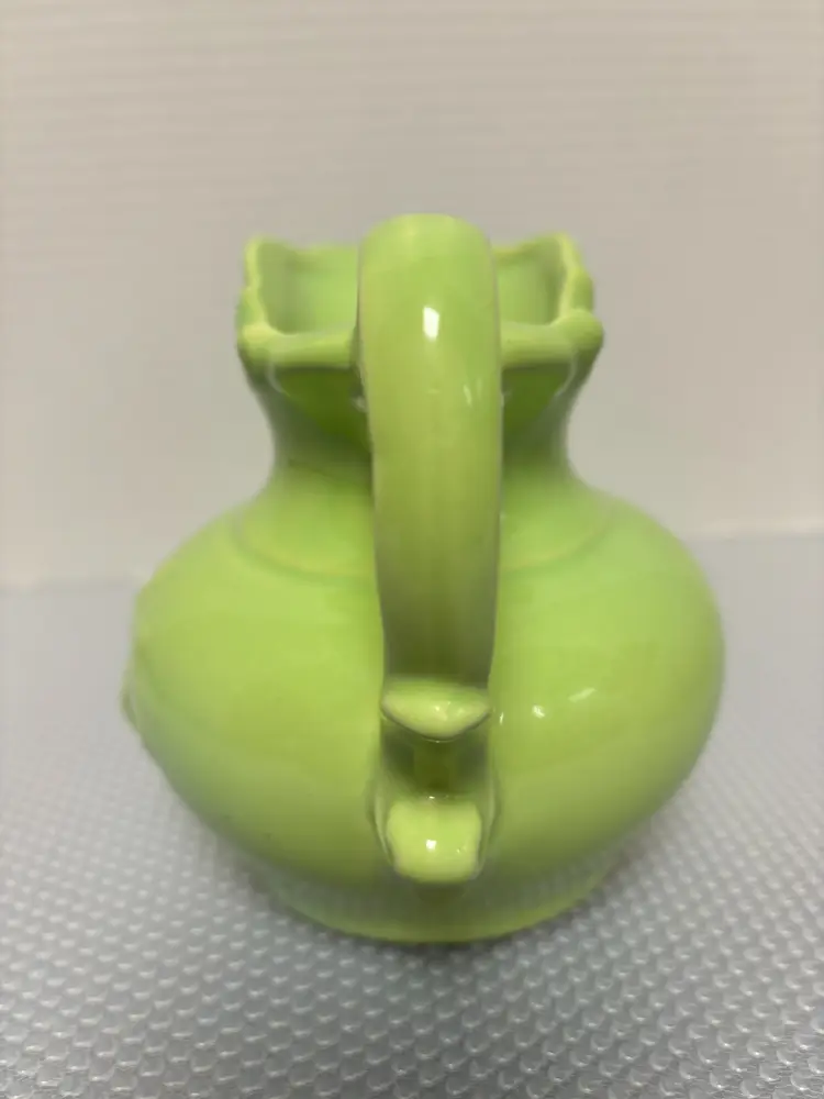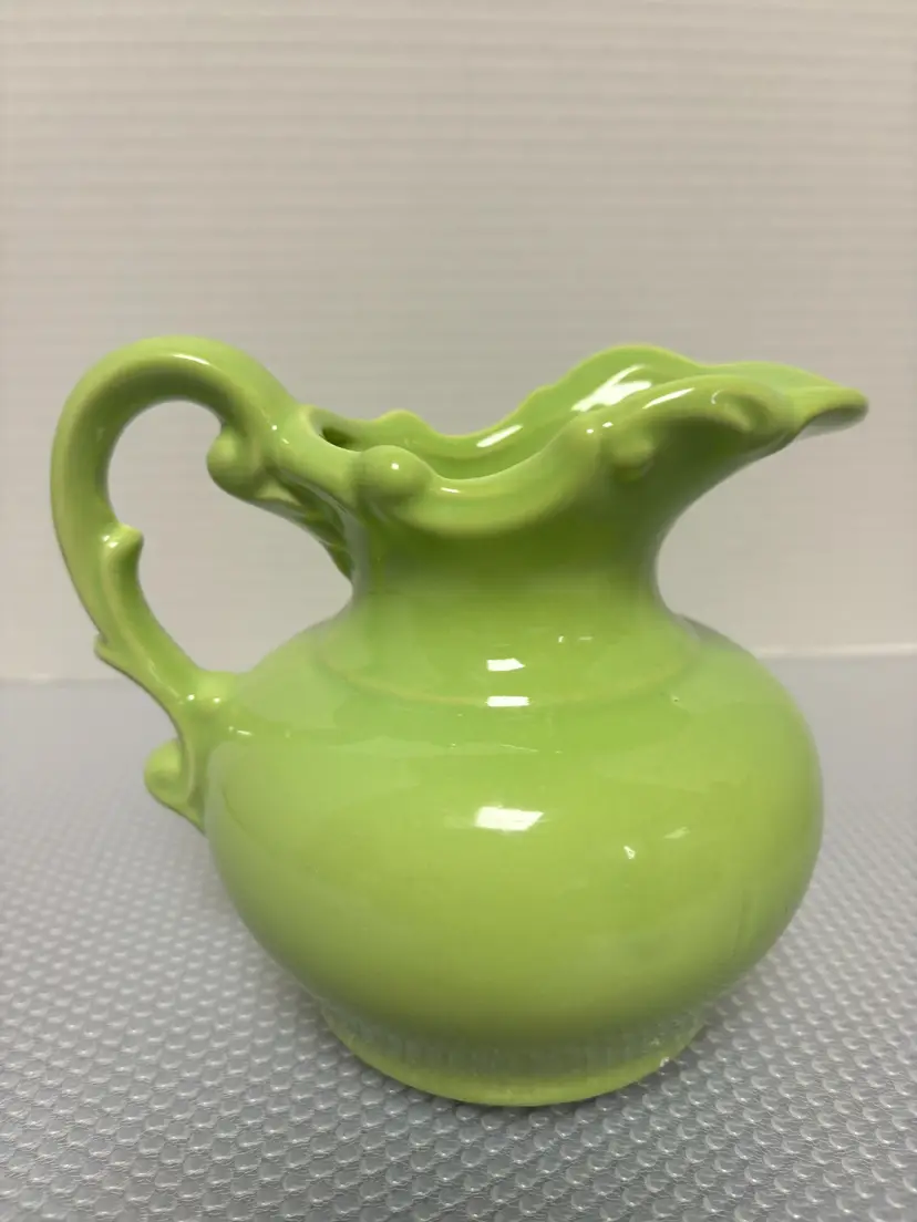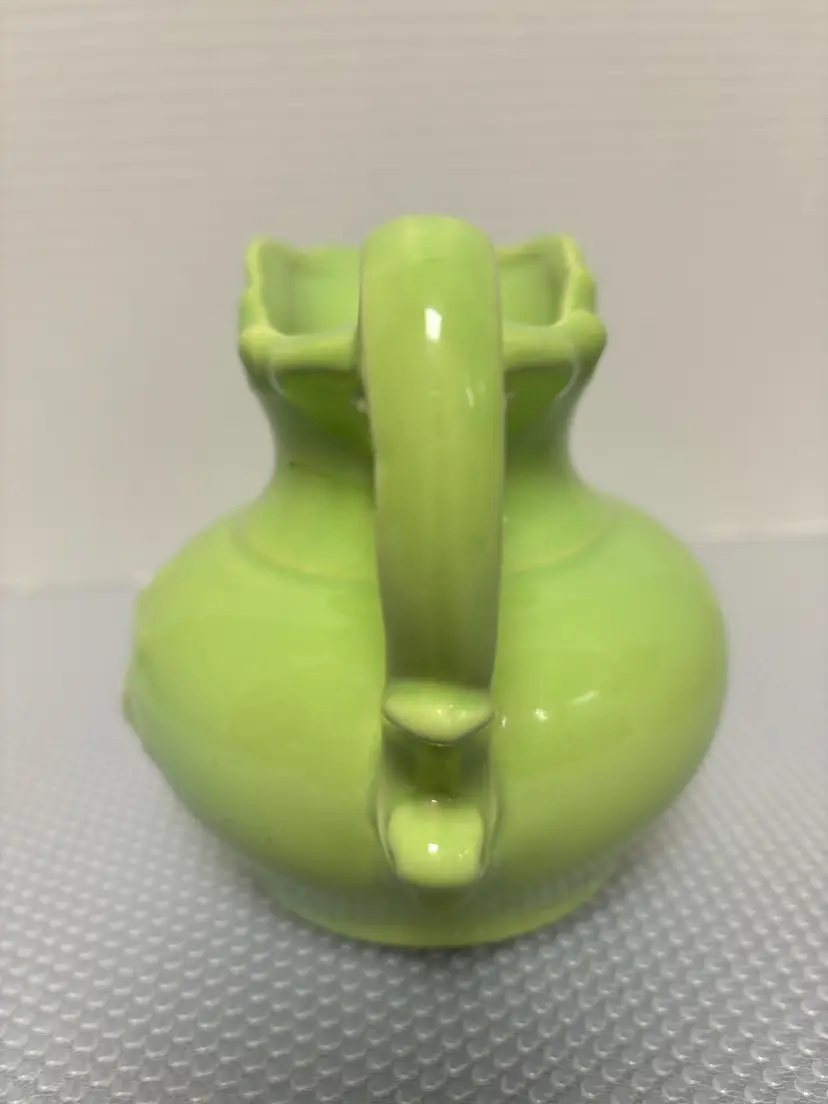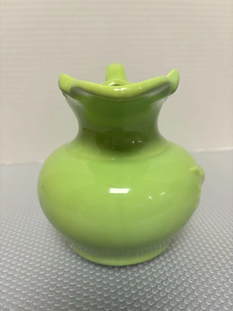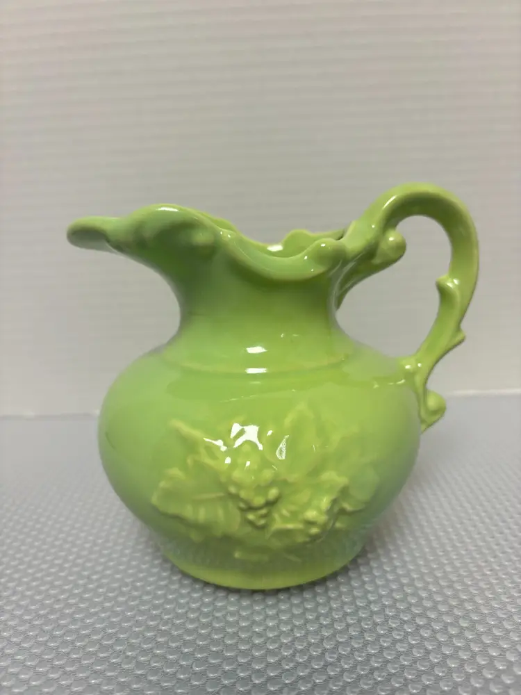 Vintage McCoy lime green pitcher featuring a charming grape leaf design. Standing 5.5 inches tall, this piece is in mint condition and made in the USA.