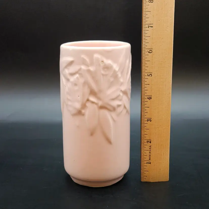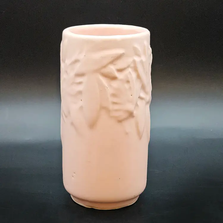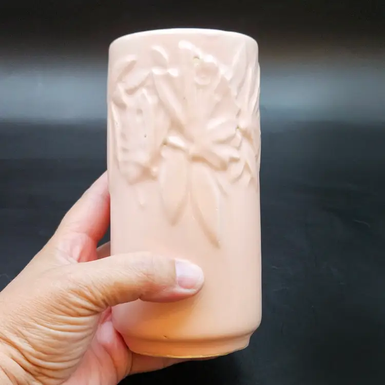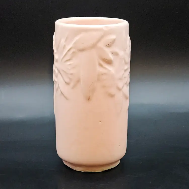 Beautiful vintage McCoy Pottery cylinder vase from the early 1940s, featuring the Butterfly design. This piece showcases an elegant raised relief of butterflies and leaves, finished in a soft matte pink tone often described as coral or mauve. The clean cylindrical shape highlights the delicate embossed pattern, making it a charming display piece for any vintage décor collection.