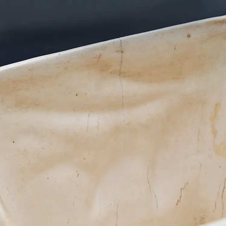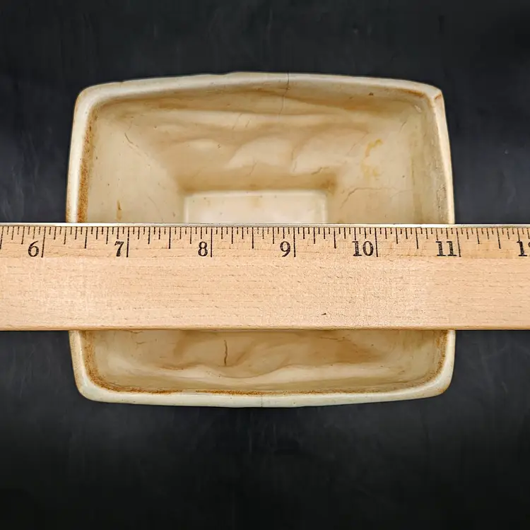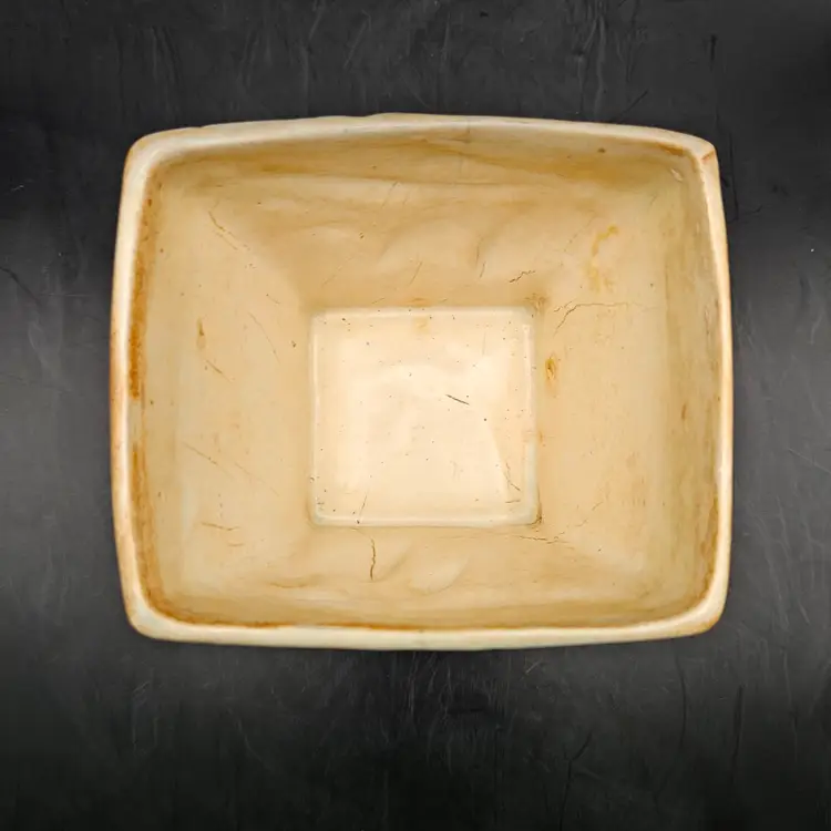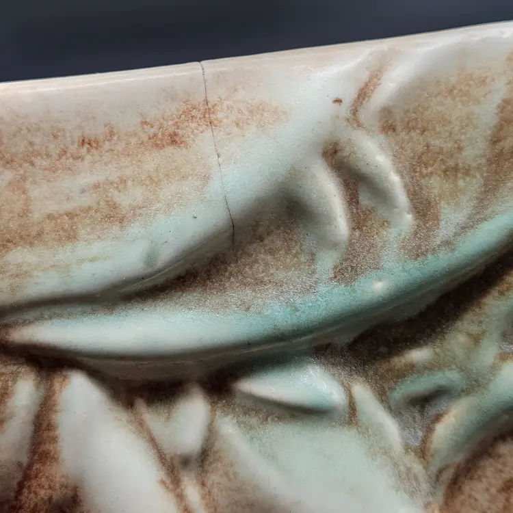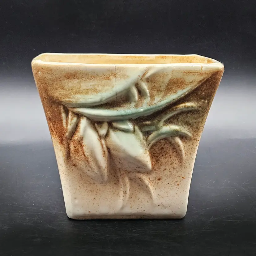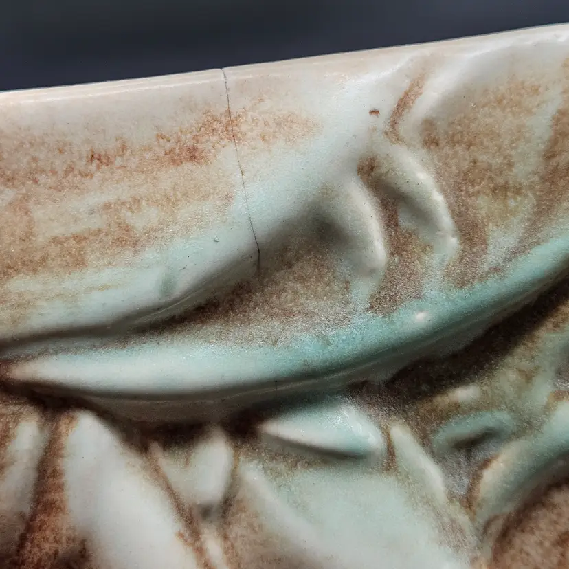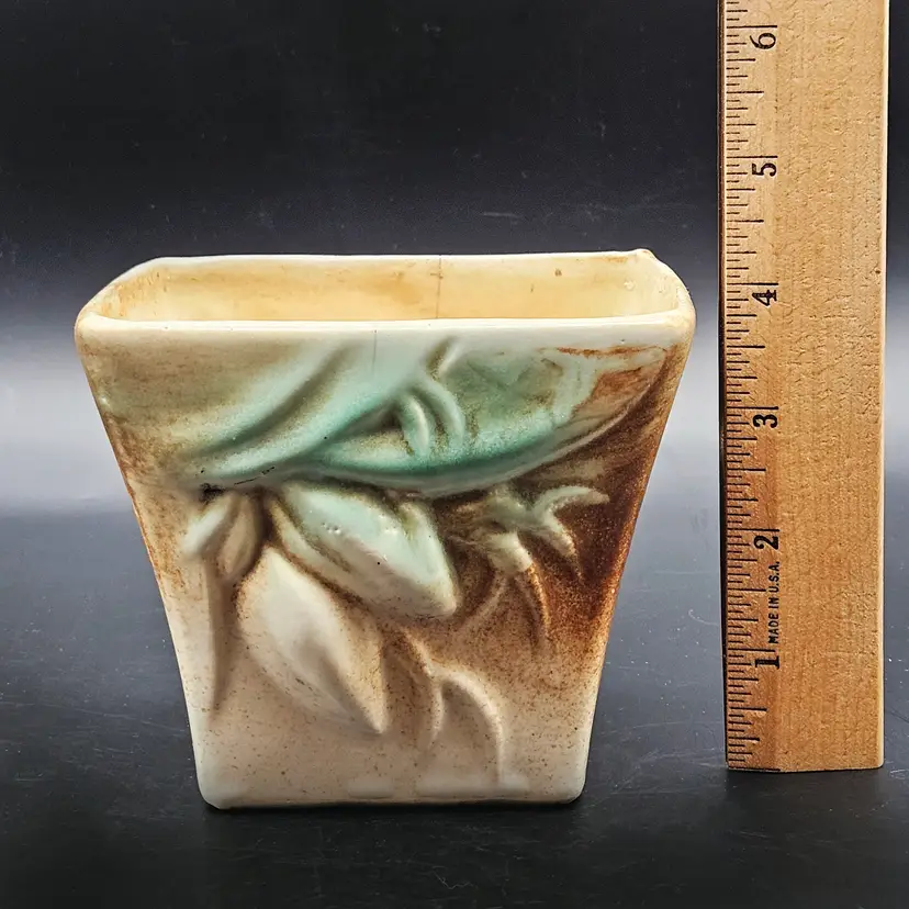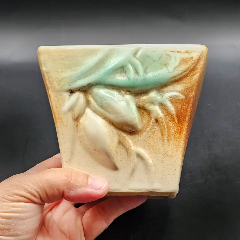 Era: 1930s–1940s Material: Glazed ceramic Design: Raised lily bud motif Color: Tan with turquoise and brown accents