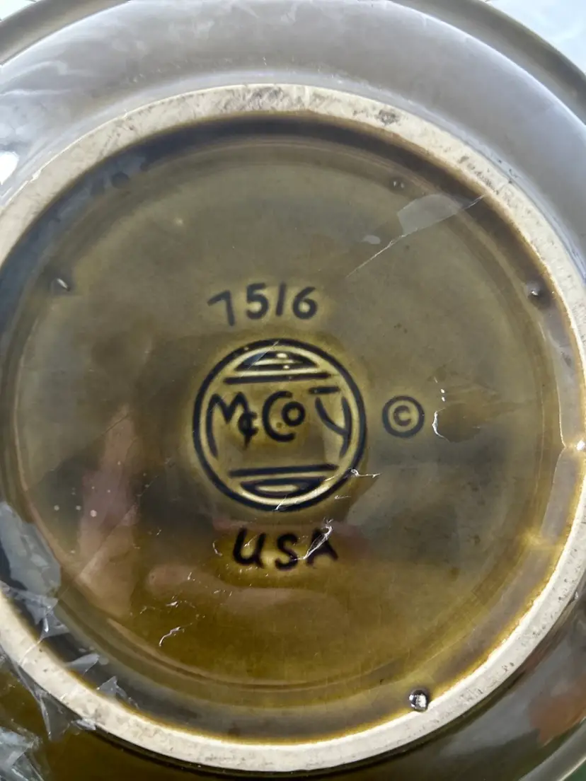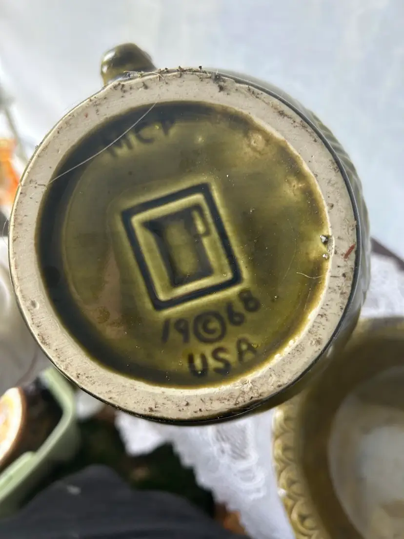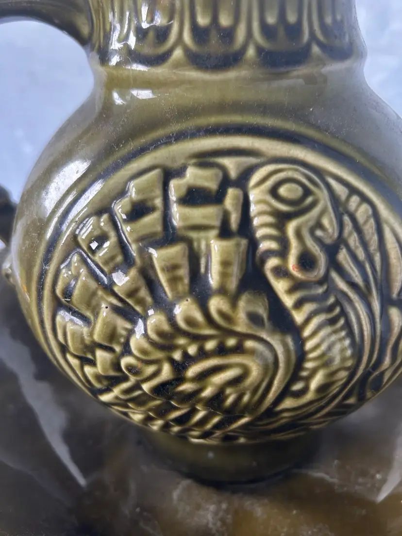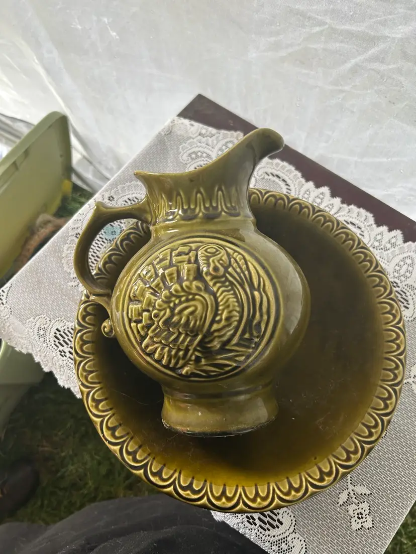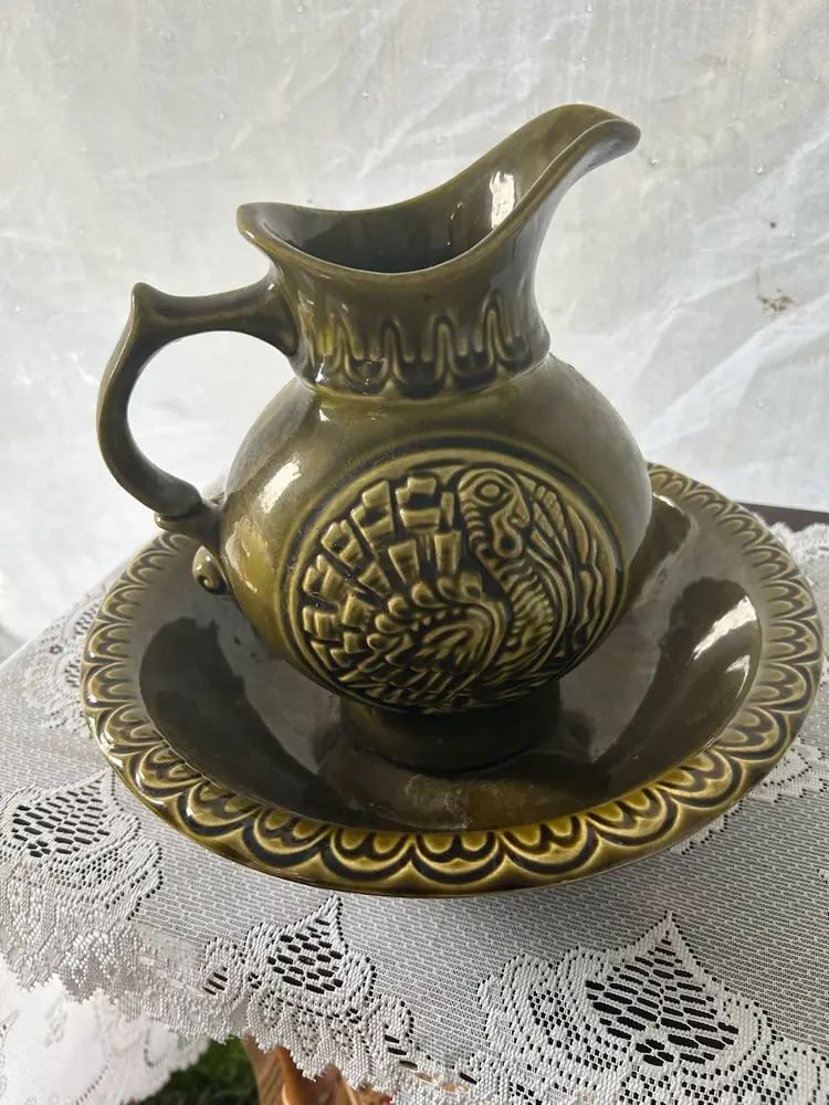 vintage McCoy Pottery Thanksgiving Turkey pitcher and wash basin set. The set is made of ceramic and features an avocado or olive green glaze. The pitcher has an embossed turkey design on both sides. The pitcher and basin were produced by McCoy Pottery, with some sets dating back to 1968.