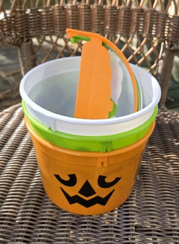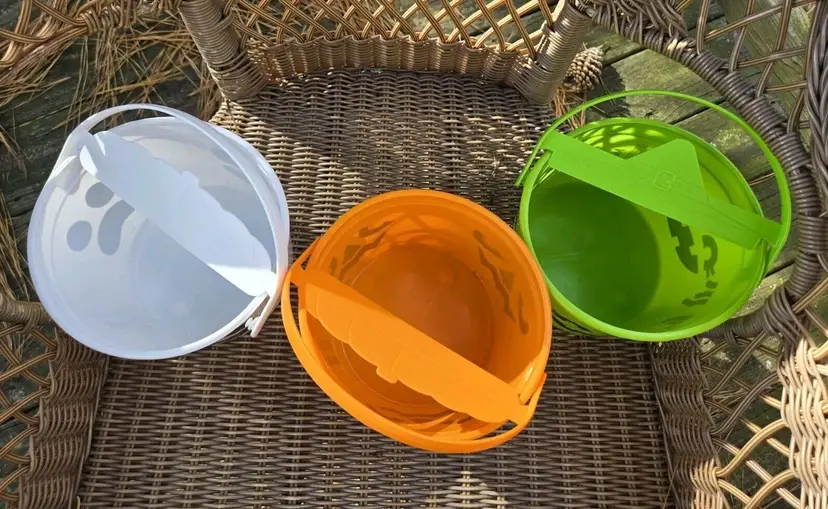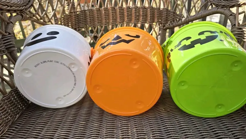 Lot of 3 includes the orange, green and white buckets. NO STICKERS are included. Just the 3 buckets. They will be shipped stacked with handles removed as shown in the last picture. (They snap back on).