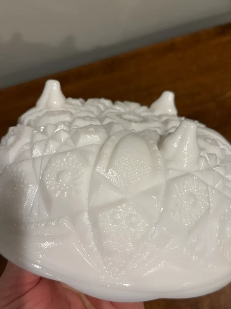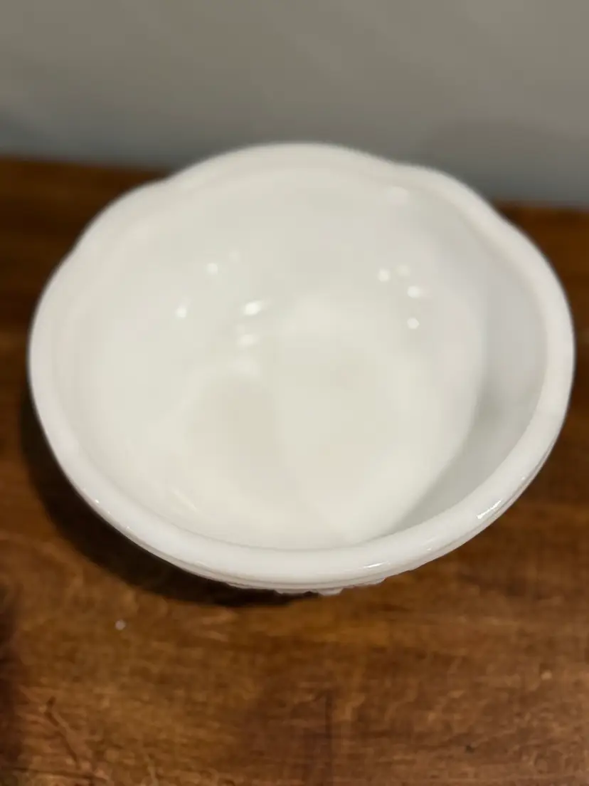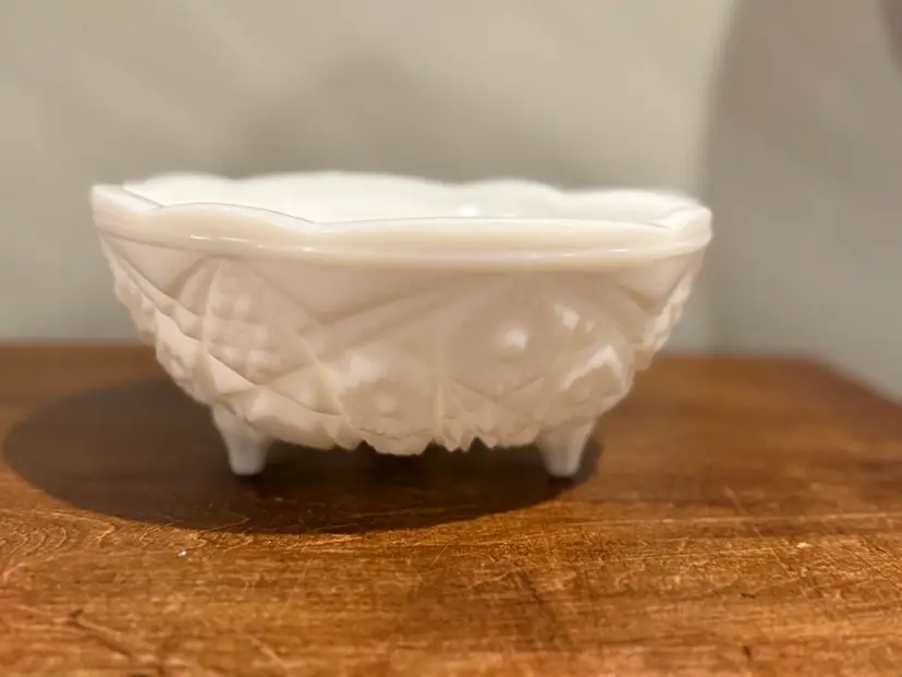 Vintage McKee Toltec Milk Glass 3-Footed Bowl, featuring a distinctive patterned exterior and a smooth interior. This charming piece of milk glass stands on three small feet, adding a touch of elegance to its design. It's perfect for use as a decorative bowl, serving small snacks, or holding jewelry. Excellent pre-owned condition, with no chips, cracks, or significant wear. A timeless collectible for any milk glass enthusiast or vintage decor lover.