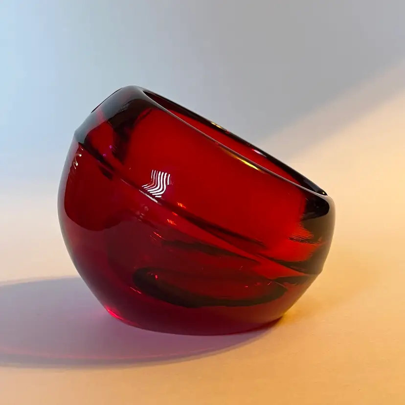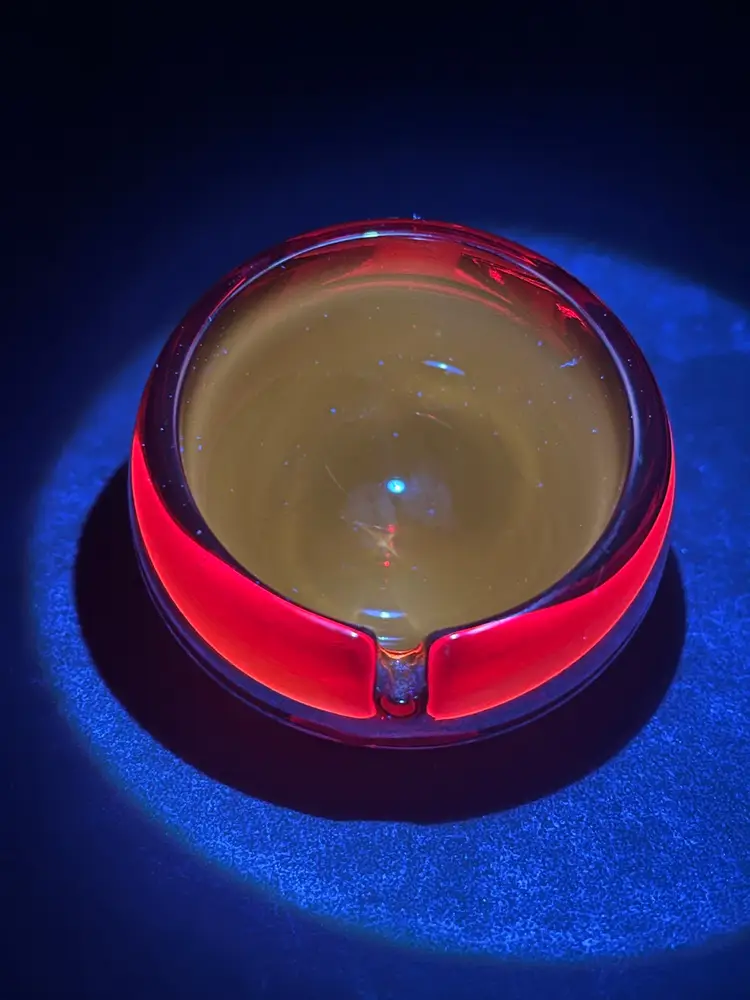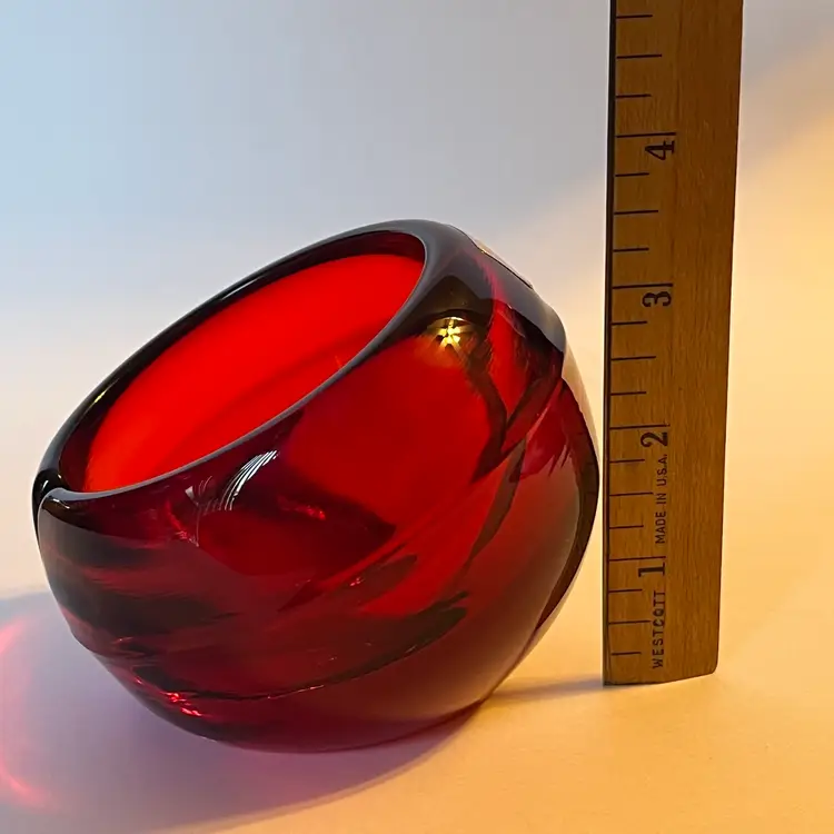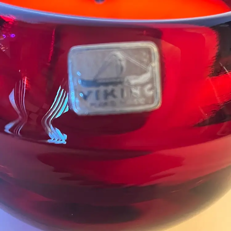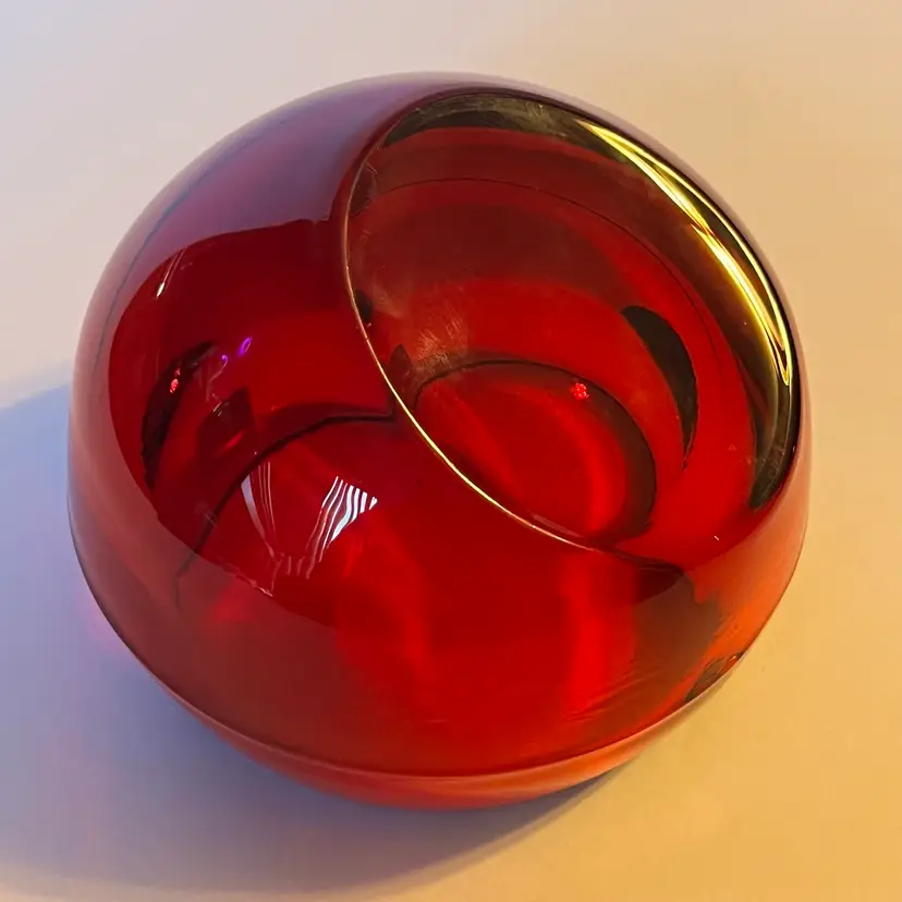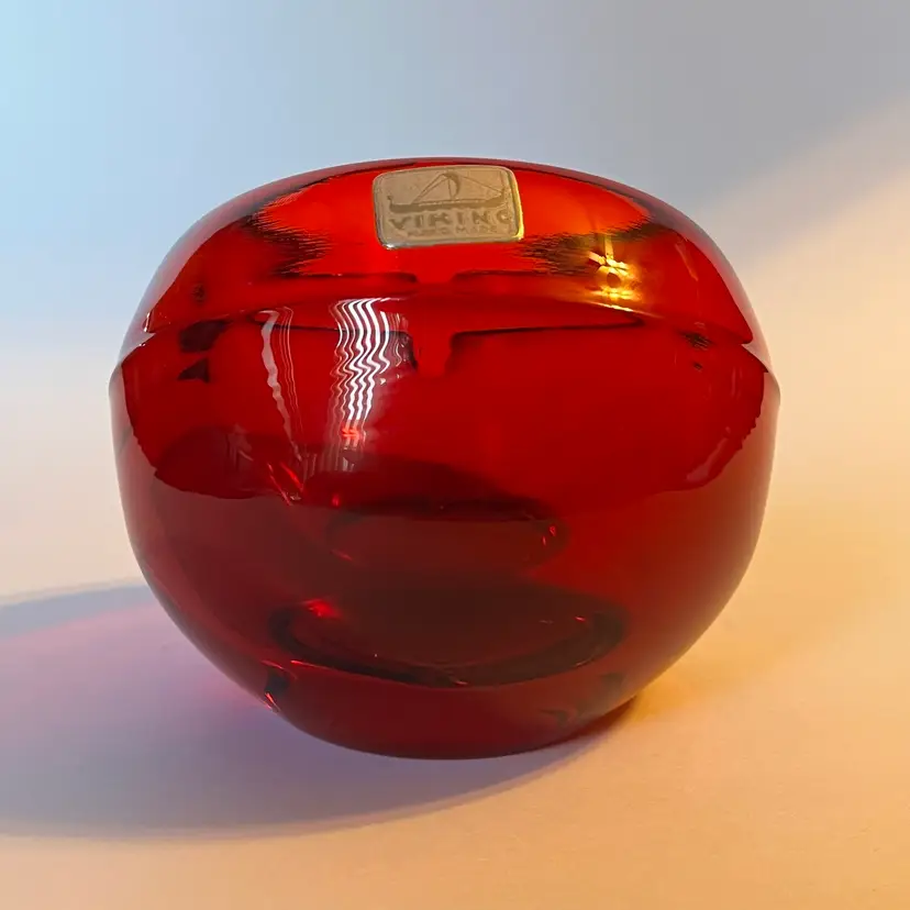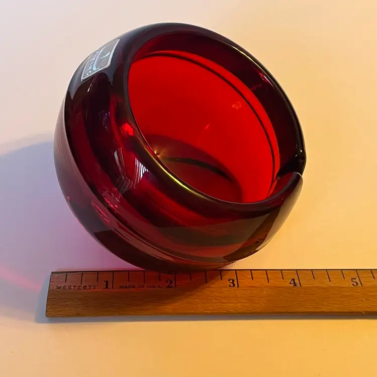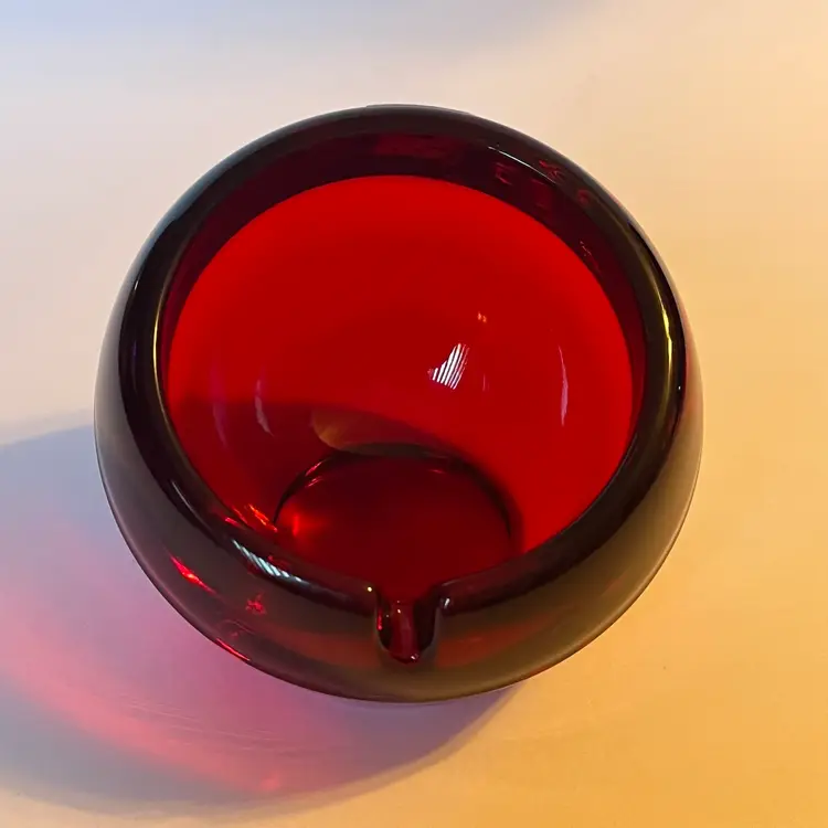 This is a striking Mid-Century Modern Viking Glass orb ashtray in rich ruby red, measuring approximately 4 inches across and 3.5 inches in height. The piece features a single slot design and retains its original Viking sticker, confirming authenticity. Under black light, the interior glows a vivid yellow—an unmistakable sign of cadmium content, typical of Viking’s vibrant color palette from the 1960s. The glass is glossy and well-formed, with smooth curves and a sculptural presence that makes it as much a decorative accent as a functional piece. Whether you're a collector of American art glass or simply drawn to bold vintage design, this ashtray offers both pedigree and visual impact. Excellent pre-owned. No chips or cracks or noted scratches. SEE PHOTOS.