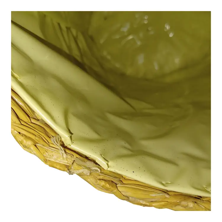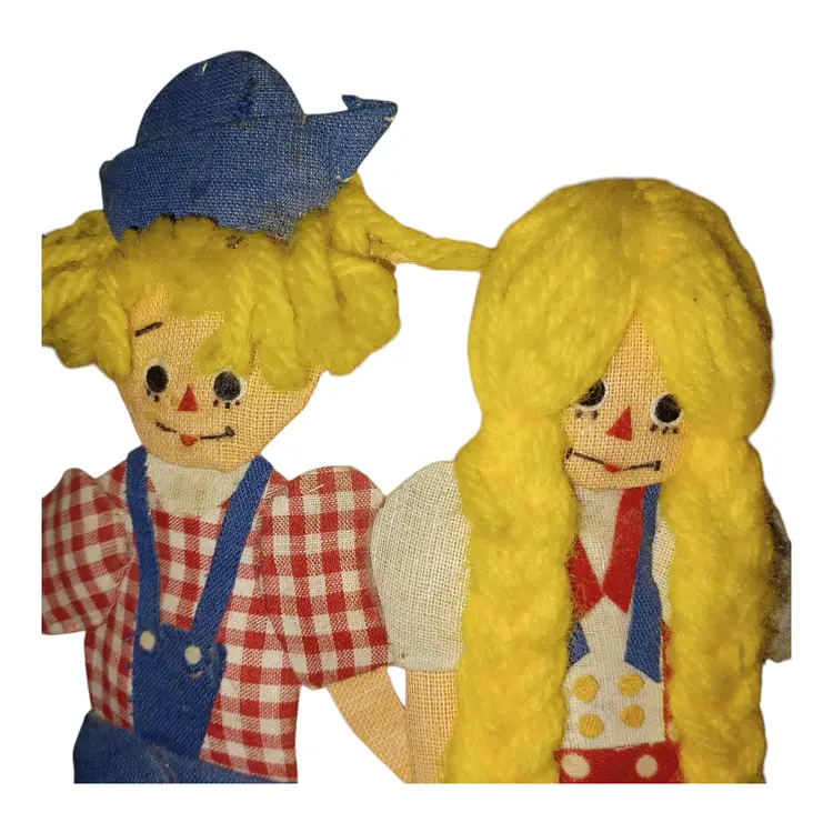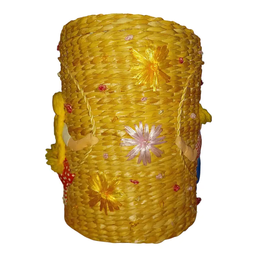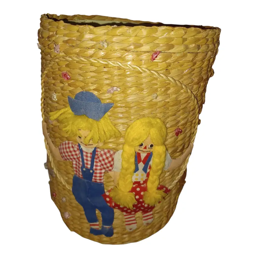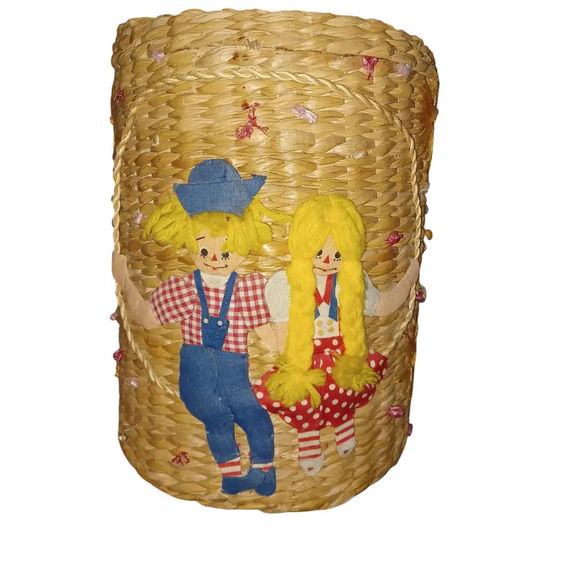 MCM 60’s Child’s Nursery Handcrafted Waste Basket- woven straw Yellow haired Raggedy Ann and Andy on a rope swing on both sides measures 11 in tall In good vintage condition does have a few condition flaws but that's to be expected from something that's almost 60 years old -missing some stitching to the plastic liner on the inside should be an easy repair who'sfor someone who's handy with a needle & thread please see all pictures as they are the best description all items from a smoke-free home with pets experienced shipper
