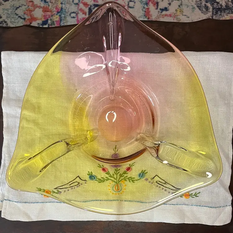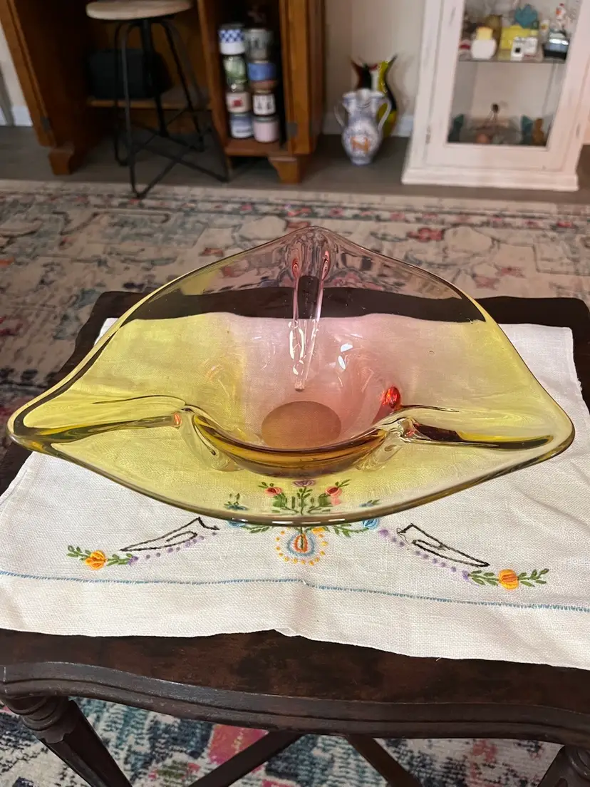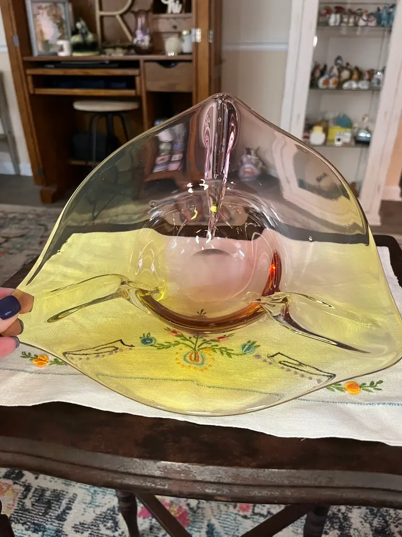 Beautiful hand blown glass bowl with pale amber and mauve coloring.