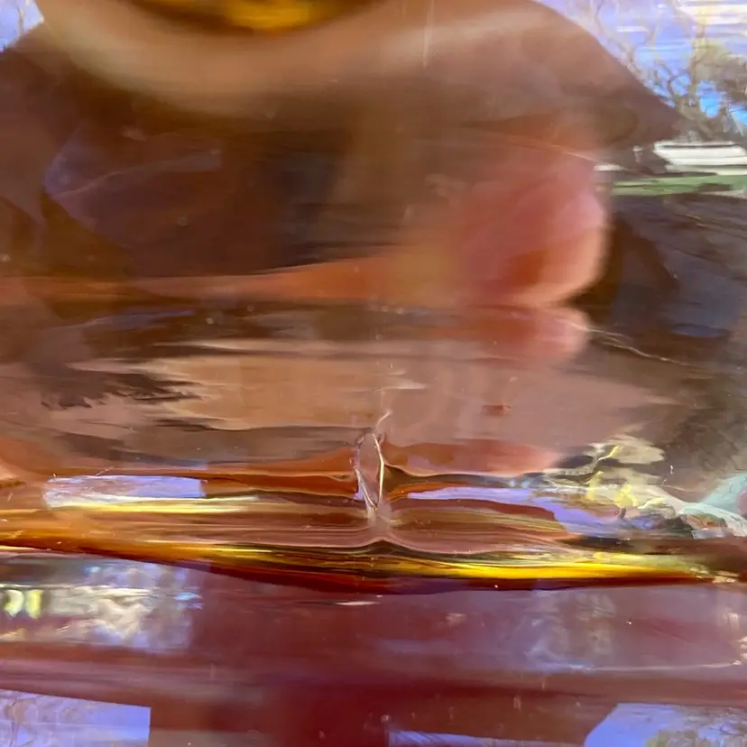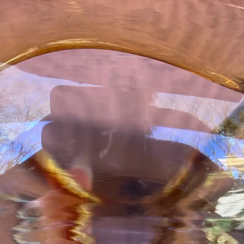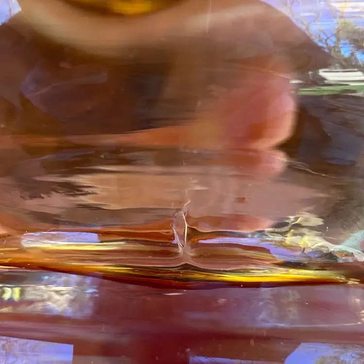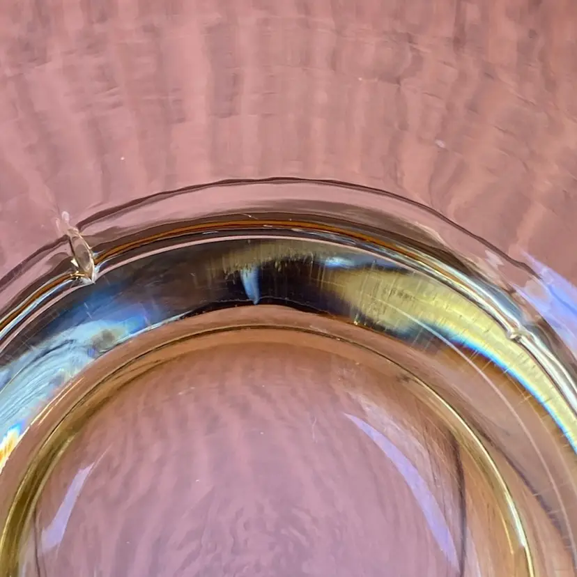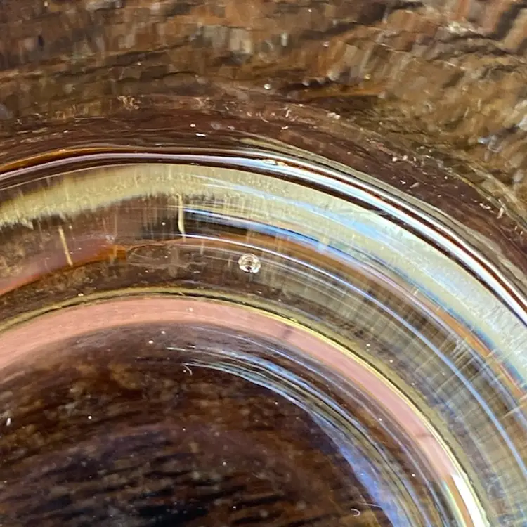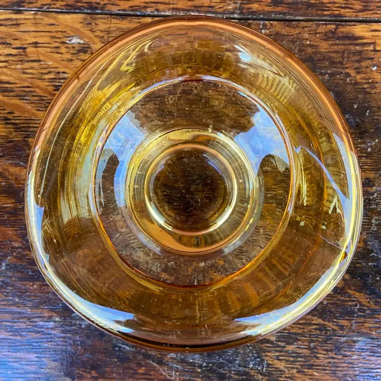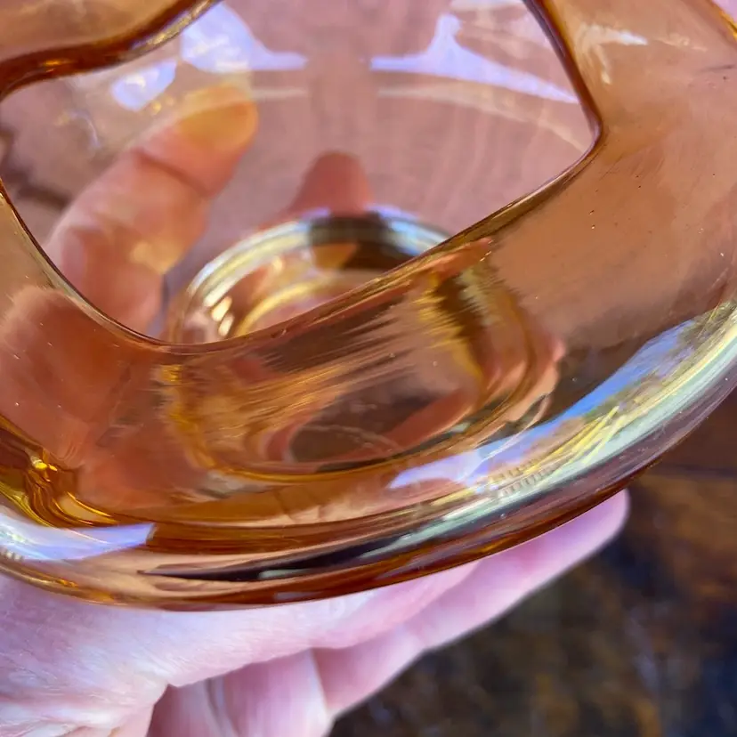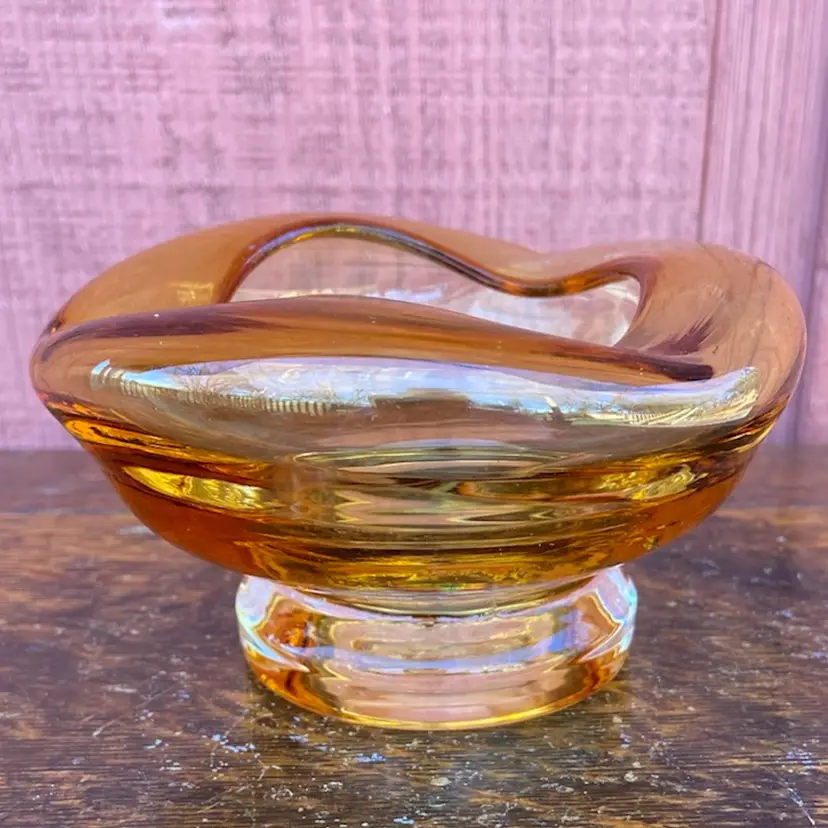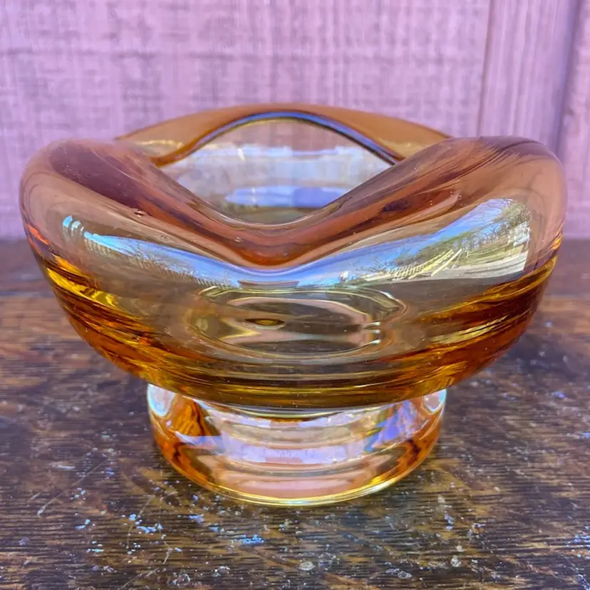 Approx 2.75”h x 4.75”w, weight 1 pound. Pre-owned condition. Some bubbles in glass - one popped / stretched during manufacturing process. Some small scratches / scuffs. See images as part of description.