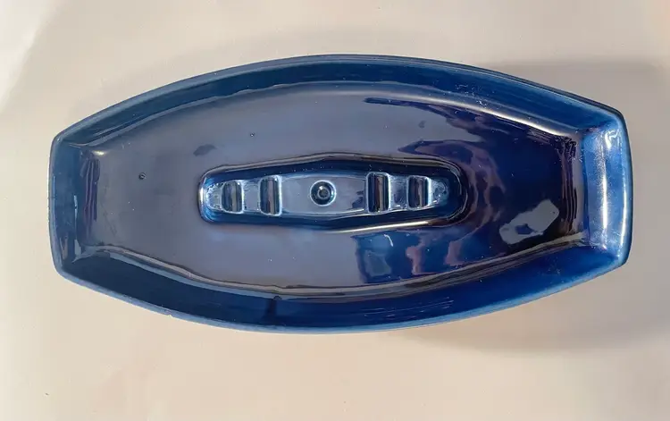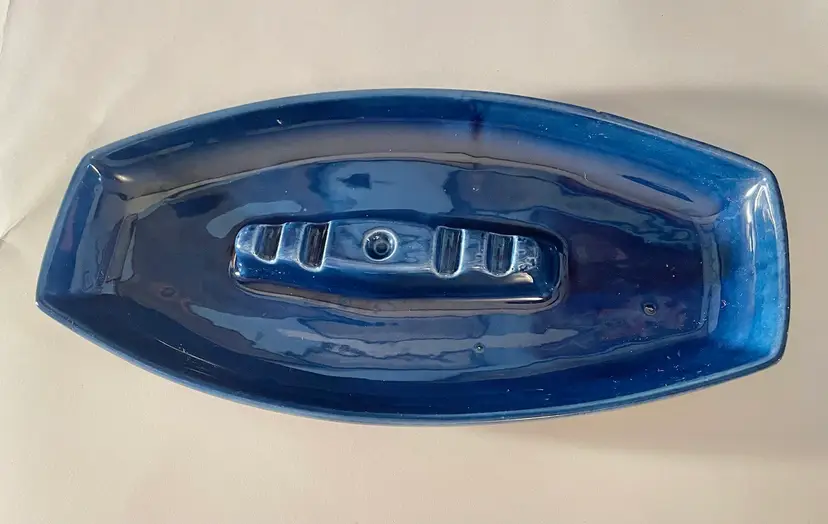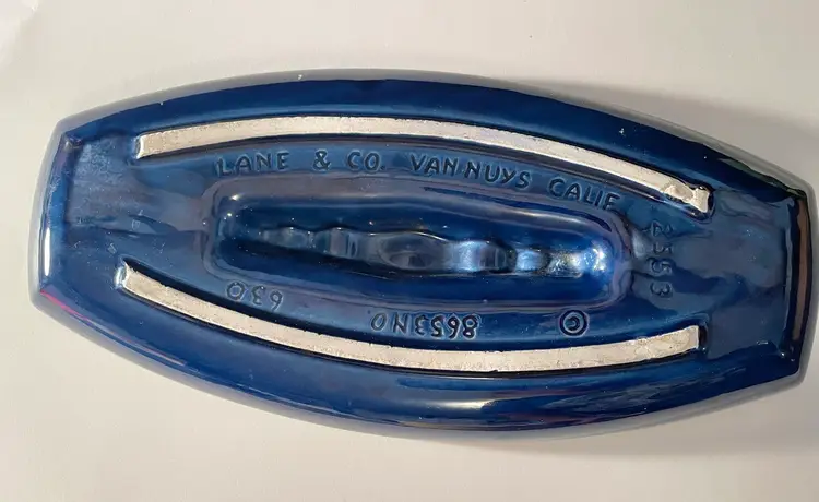 Blue Lane & Co art pottery MCM ashtray, Van Nuys California. Never used. One small chip on the edge, with a tiny pinhead-sized one next to it. 13" long, 6" wide, 1 1/4" deep