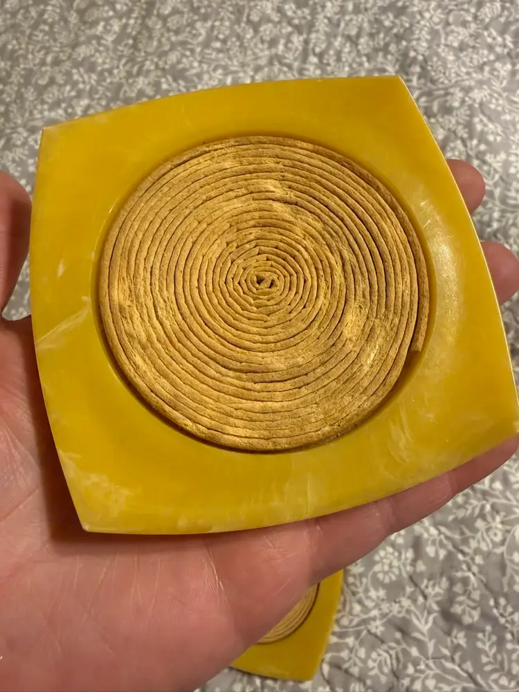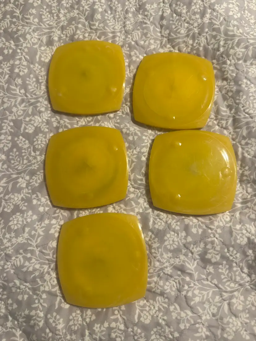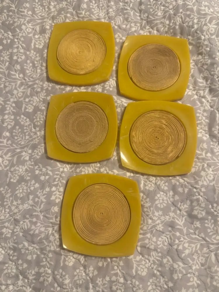 Set of 5 MCM Bakelite coasters in the iconic mid century yellow. GVC no cracks or chips. 4” each