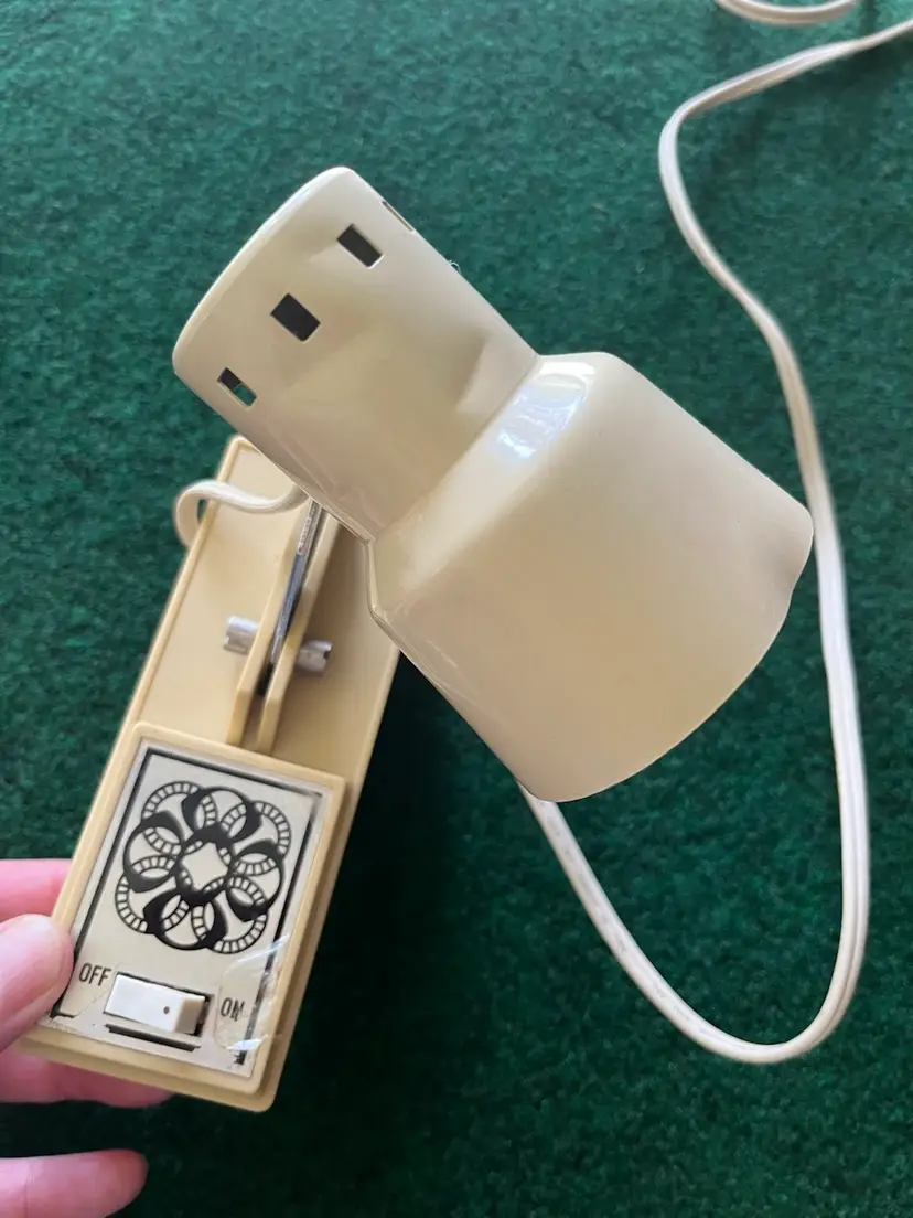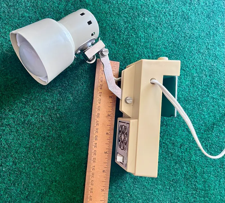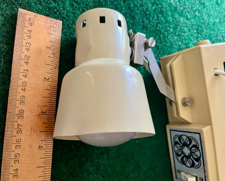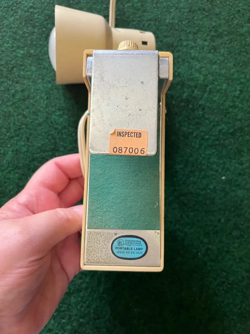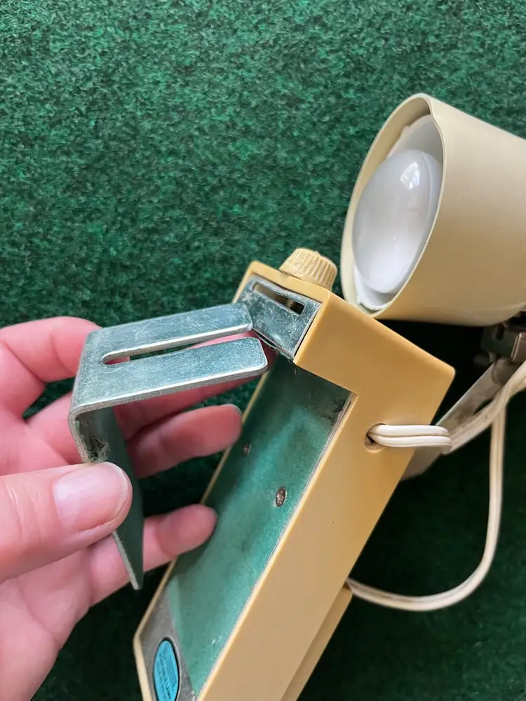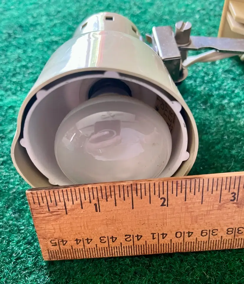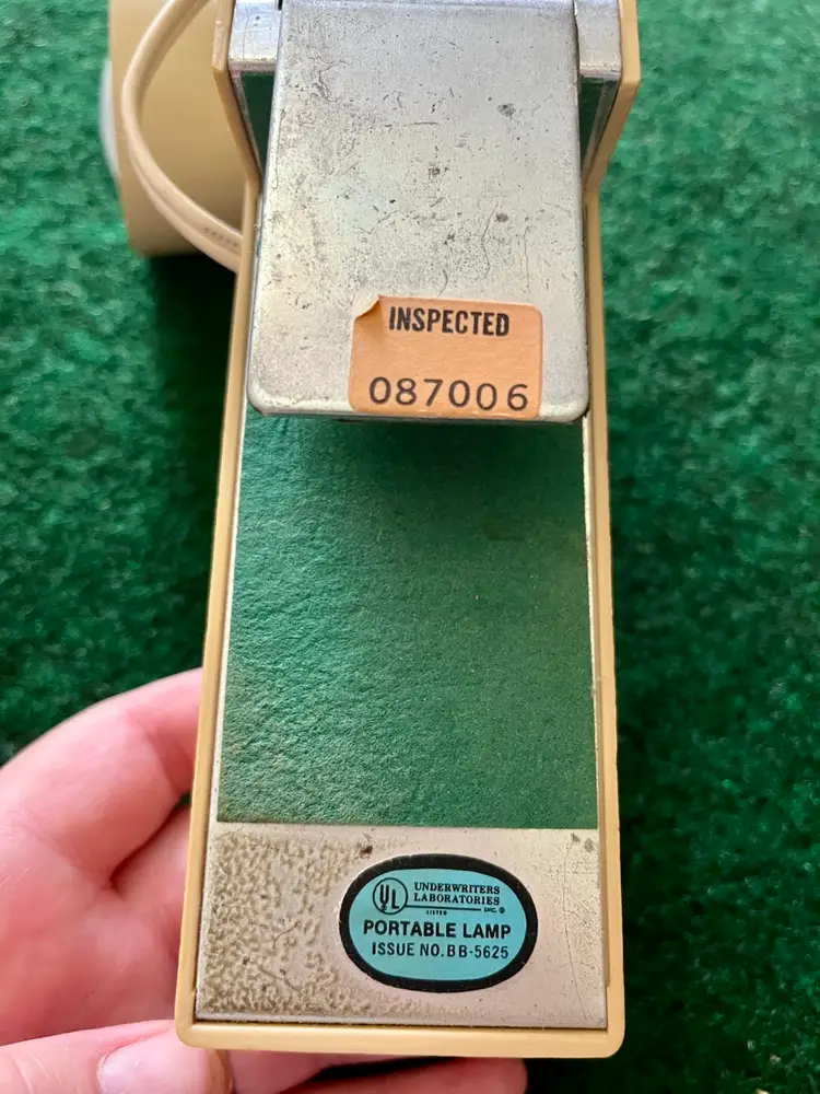 Please look at all the photos prior to deciding to make a purchase. This is a pre-owned item with age “yellowing” to the almond color on the plastic, dents in the lamp head, cover shows some wear indicative to its age, and tarnish on the metal. Buyer is strongly encouraged to review the photos decide for themselves its condition as my interpretation may not align with yours. Prior to a purchase, questions not answered in photos, details, description are welcome.