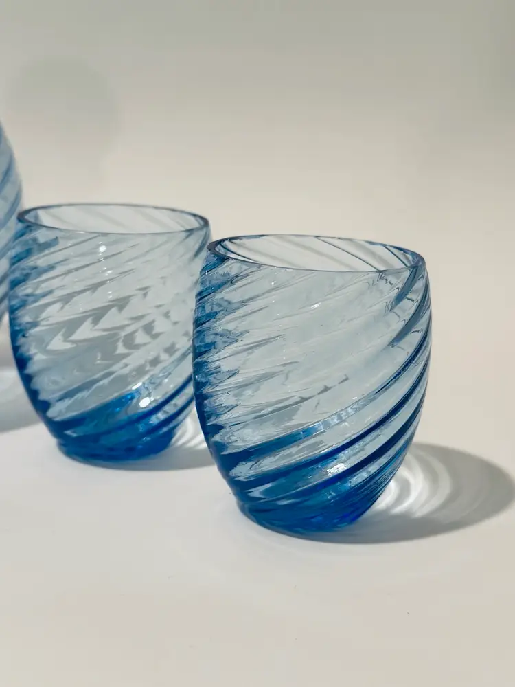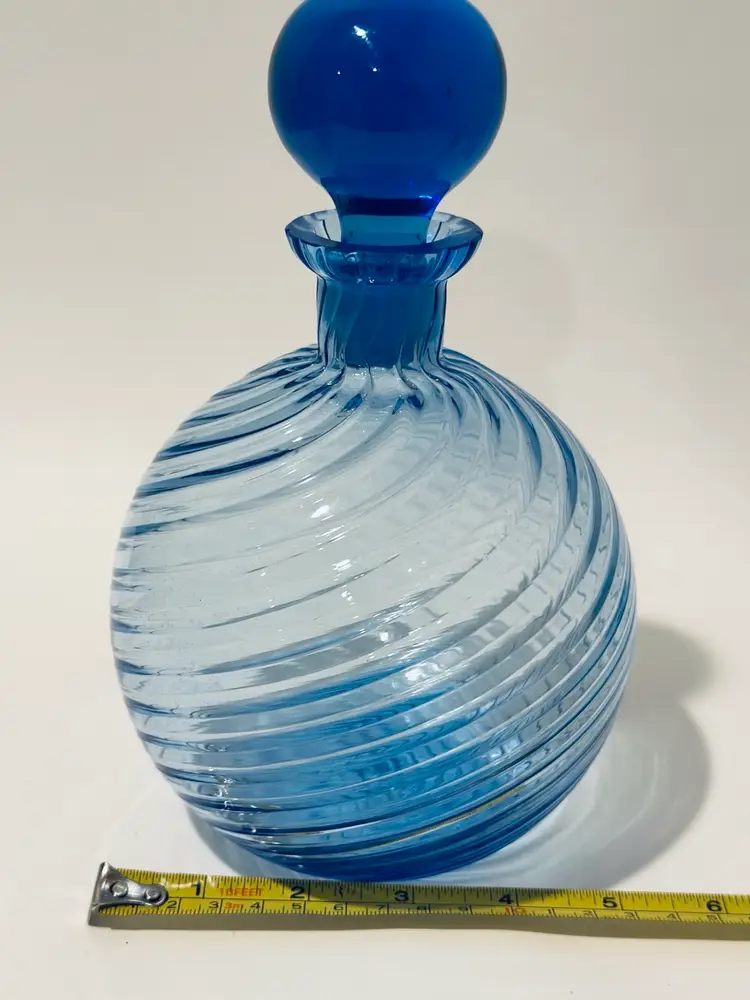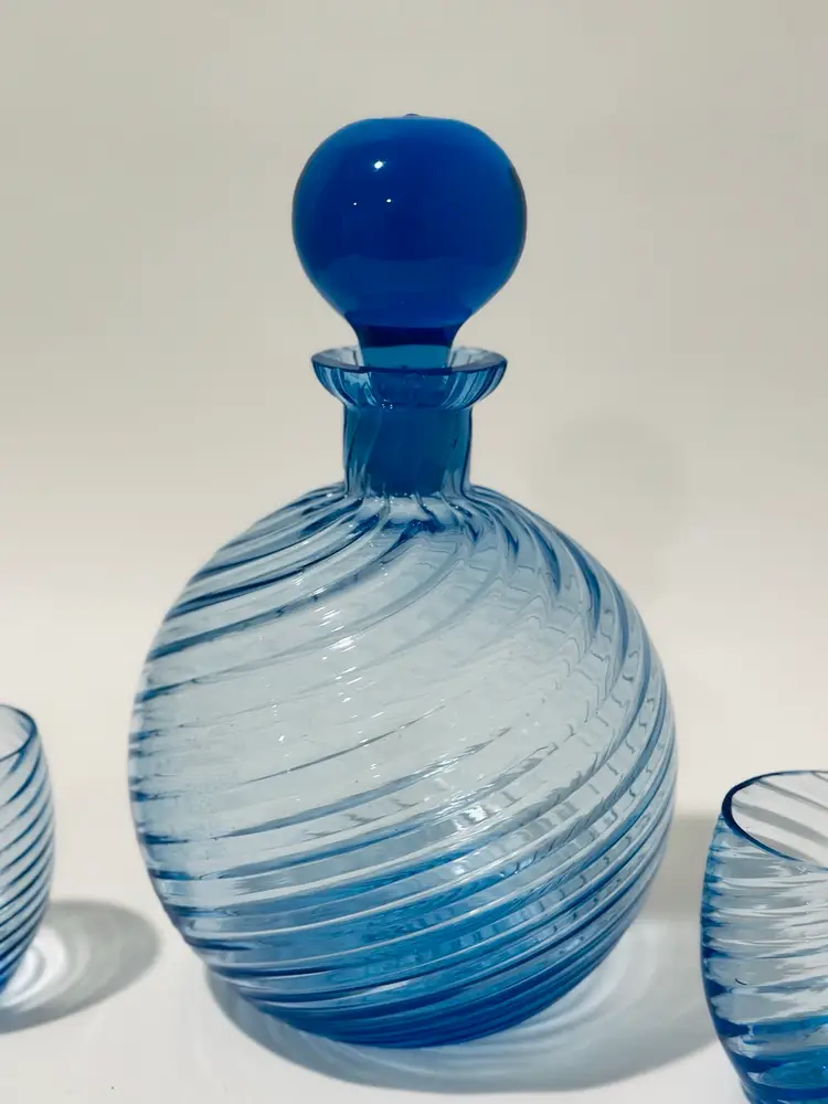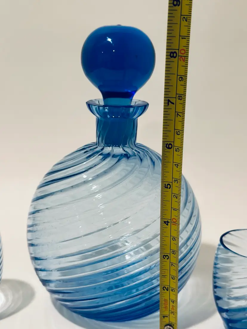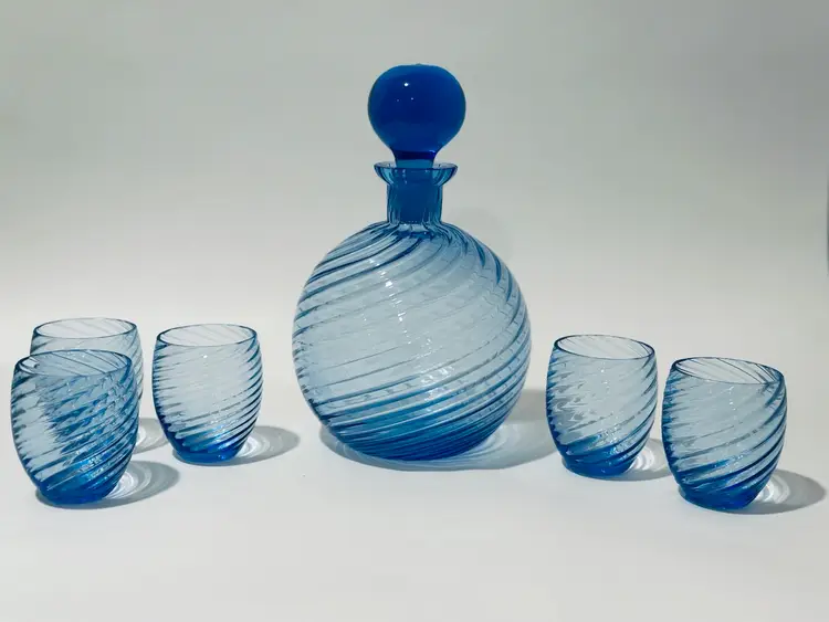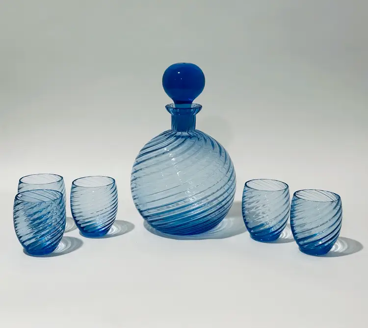 This beautiful set includes a blue handblown swirled decanter and five cordial glasses, all made in Czechoslovakia. The pieces feature a glossy finish, adding to their unique charm. The set is perfect for a mid-century modern style bar and is sure to impress guests.