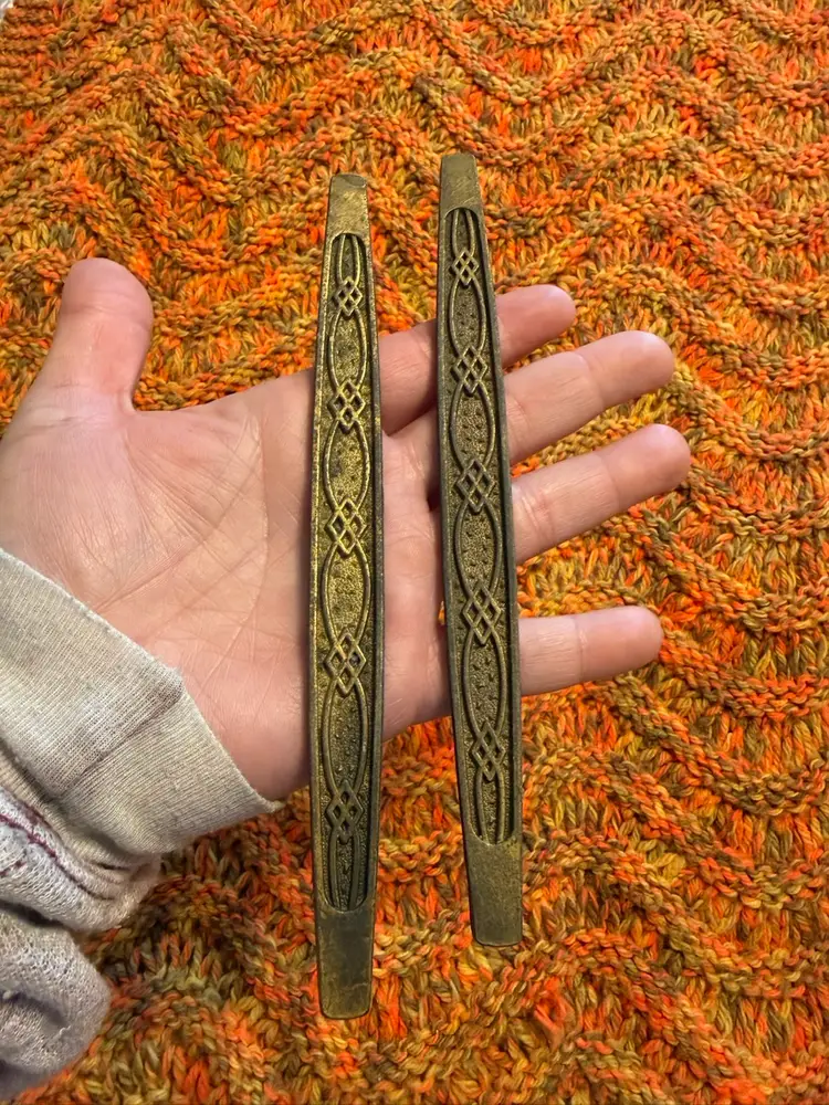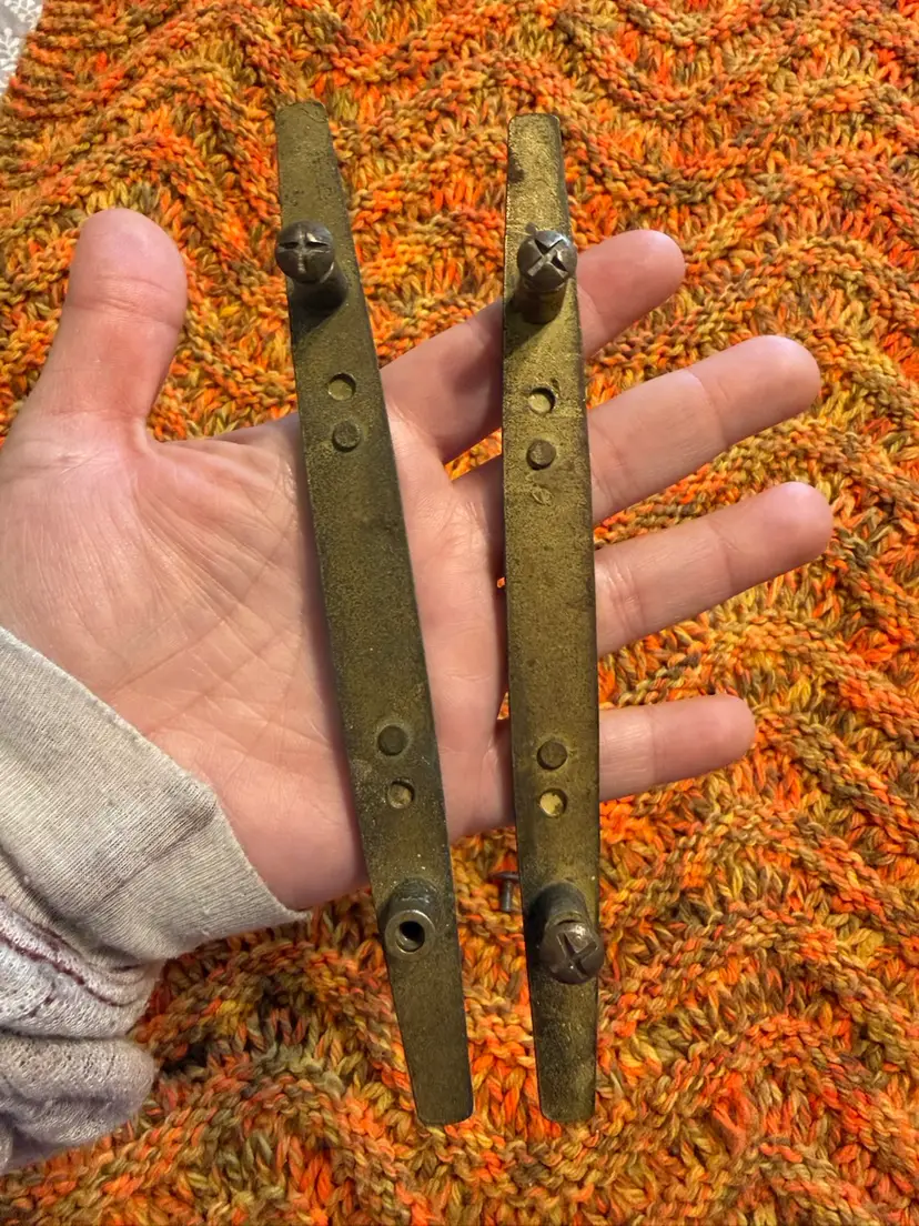 Set of 2 MCM brass drawer pulls. Has all the screws (1 not pictured but I have it) great patina 7” each