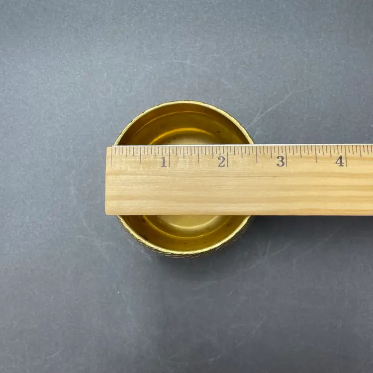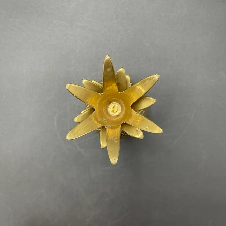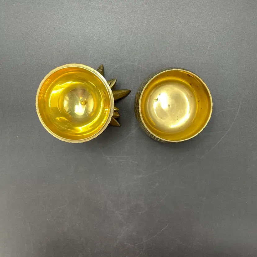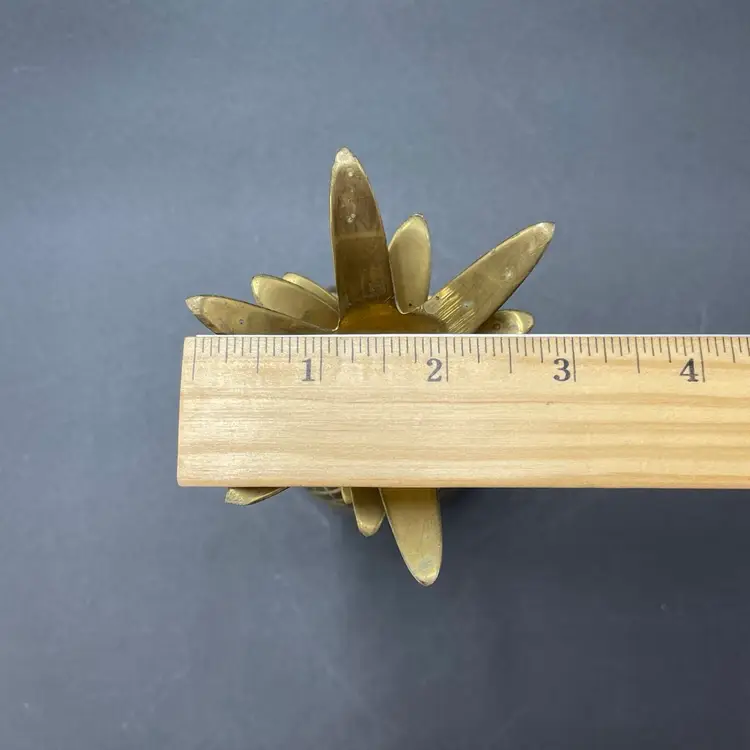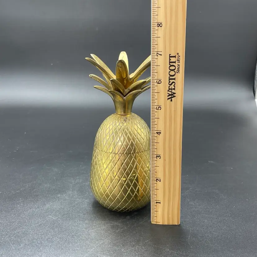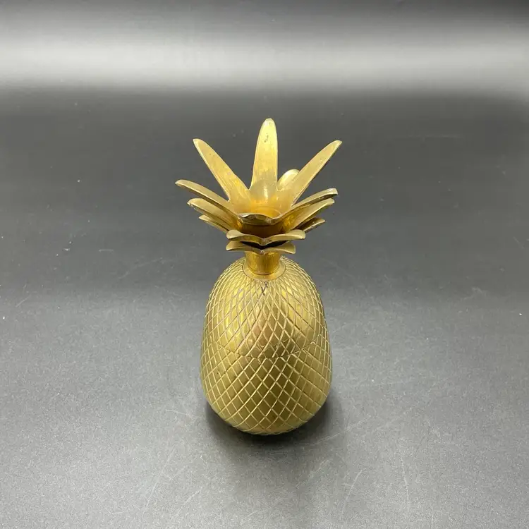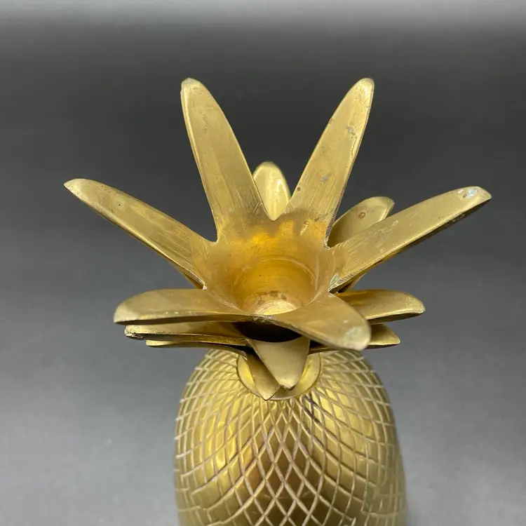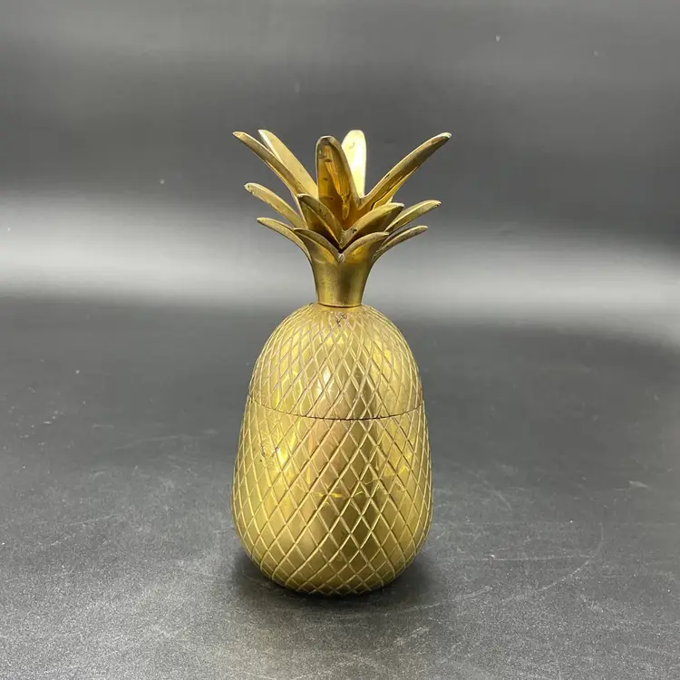 This is a mid century modern brass pineapple trinket box/candle holder/container. Made in India. Measures approximately 7" tall x 2.5" across. No major flaws.