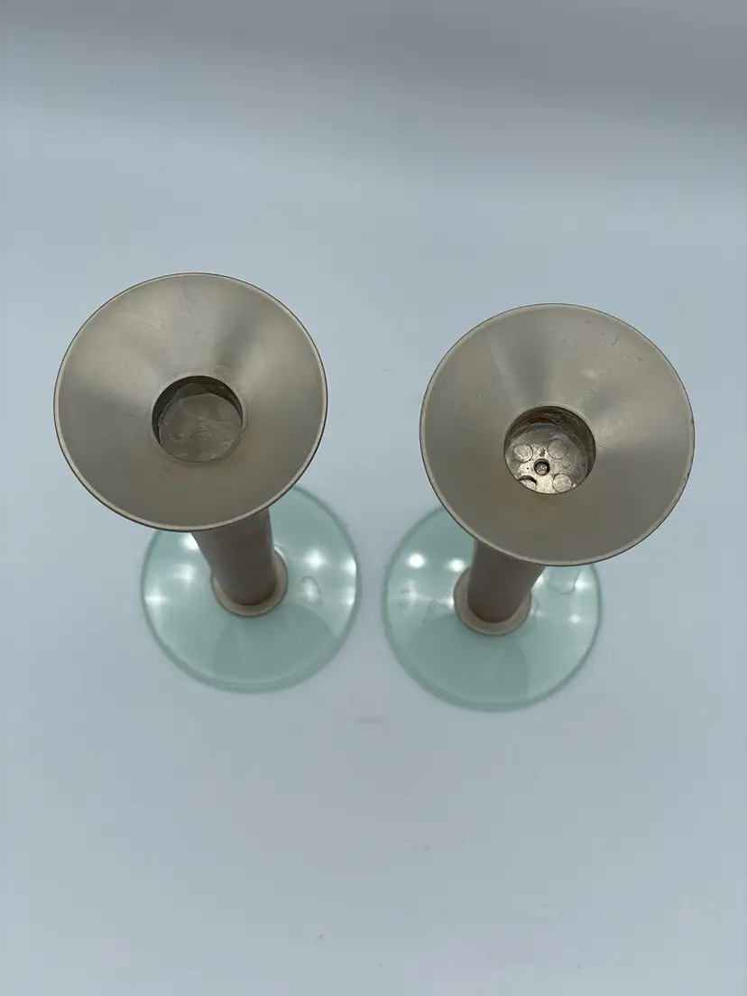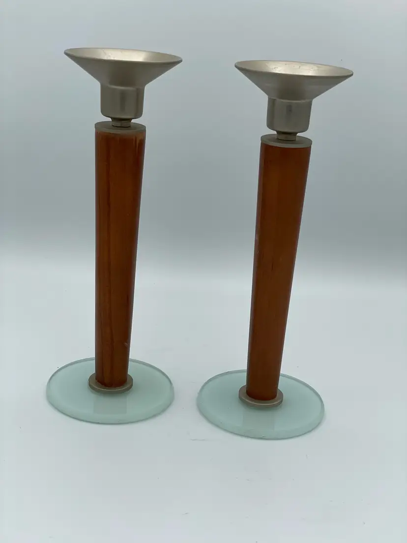Vintage MCM Candlestick Holders. Glass Base & Metal Candle Holder. Slight Wear On Wood. Overall Good Condition. 8 1/2" Tall