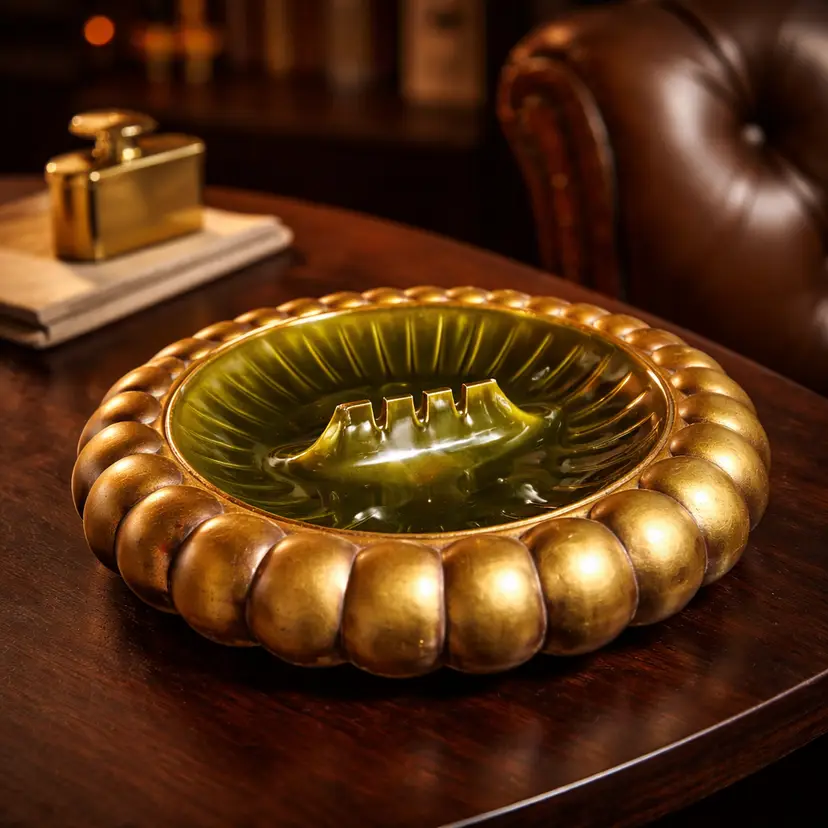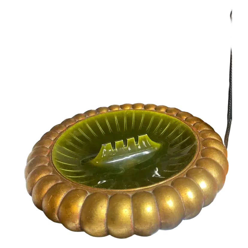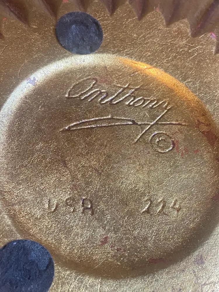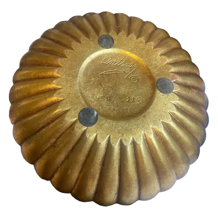 The MCM Ceramic Astray signed "Anthony" USA 224 by Freeman McFarlin is a 13" diameter ashtray made of ceramic in California. This green and gold piece is crafted using pottery production technique, making it a unique and decorative addition to any collection. The signature of Anthony adds a personal touch to this piece, showcasing the quality and craftsmanship of the brand. NOTE: Small Chip at center of ashtray. Please review all photos as they are part of the description.