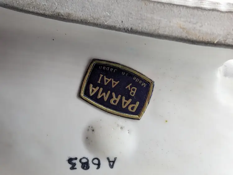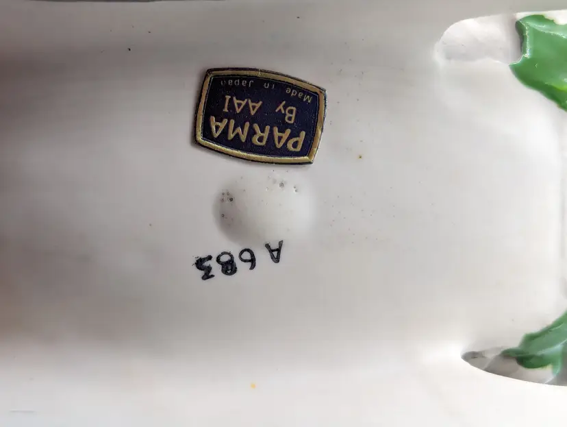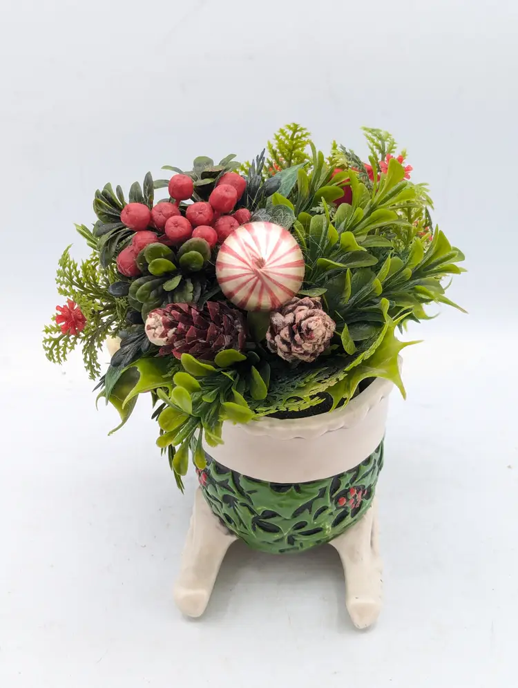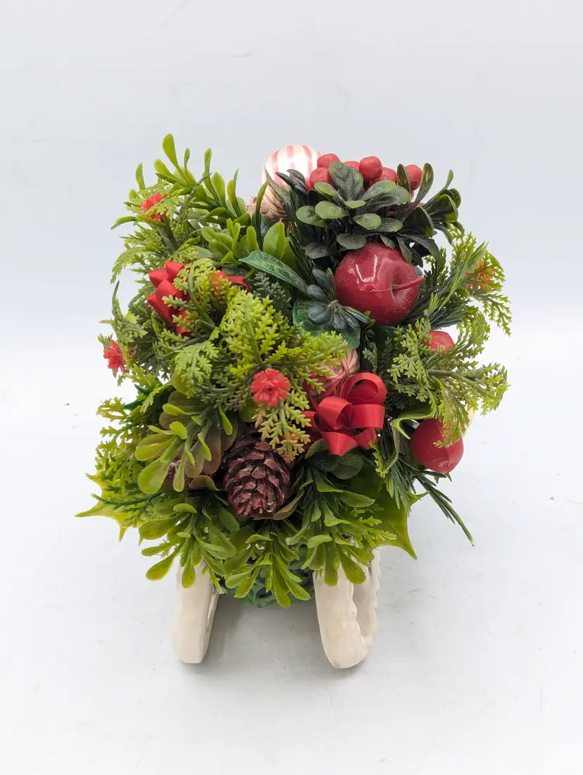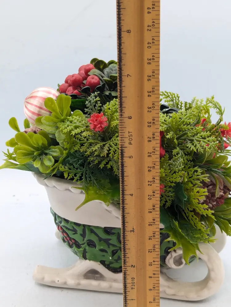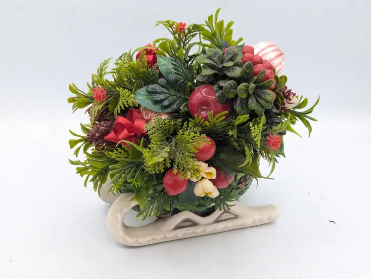 For sale is a beautiful vintage Christmas sleigh centerpiece from Parma by AAI, crafted in Japan. This mid-century piece features a classic white ceramic sleigh base adorned with a hand-painted green holly leaf and red berry motif. Arrangement: The sleigh comes filled with a lush, vintage-style artificial arrangement including faux evergreens, pinecones, red berries, and a festive striped "peppermint" ornament. Condition: Excellent vintage condition. No visible chips or cracks on the ceramic base. The original blue and gold foil "Parma by AAI" sticker is still intact on the bottom, alongside the "A 683" stamp.