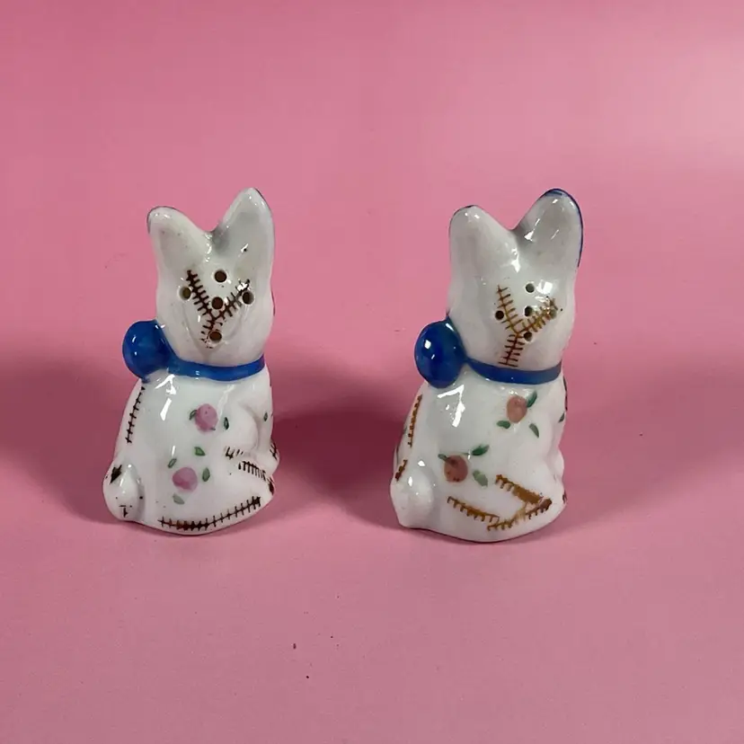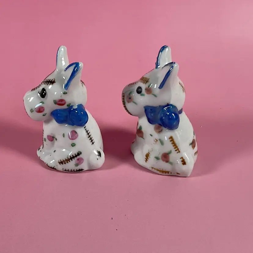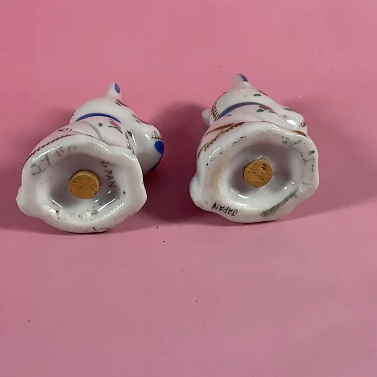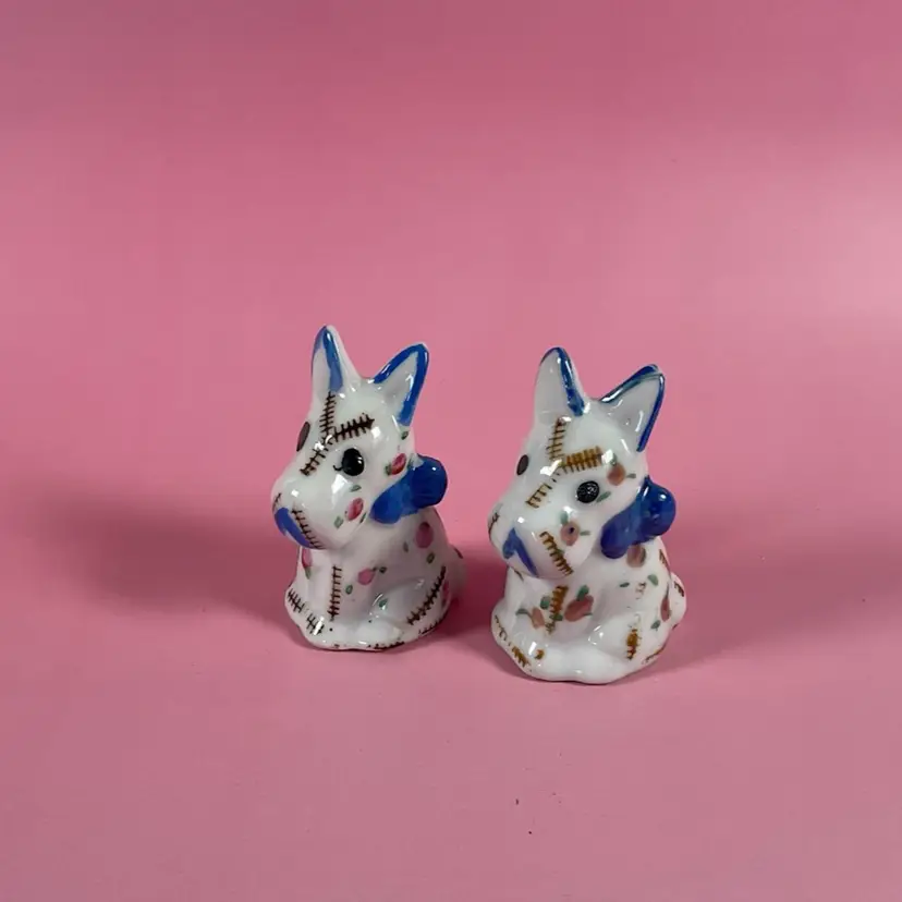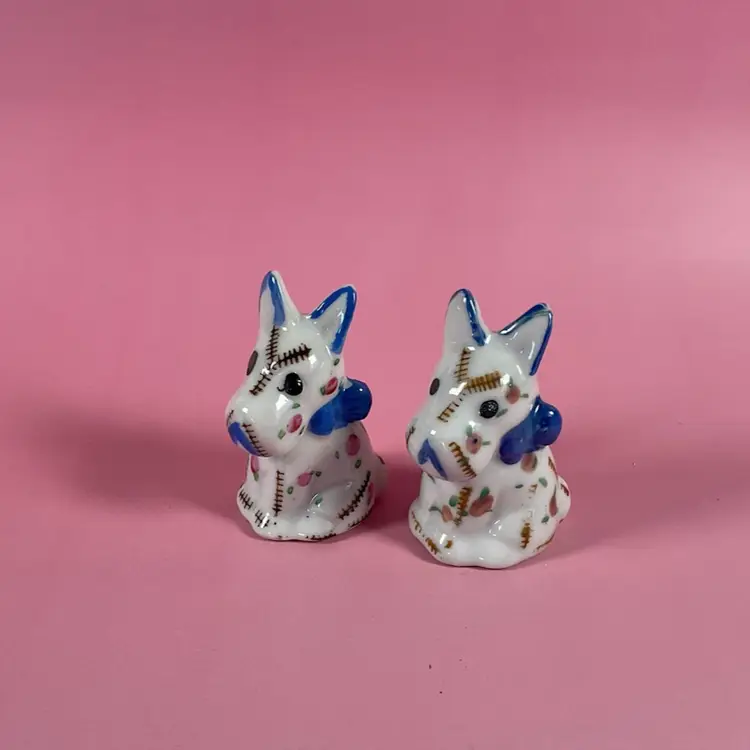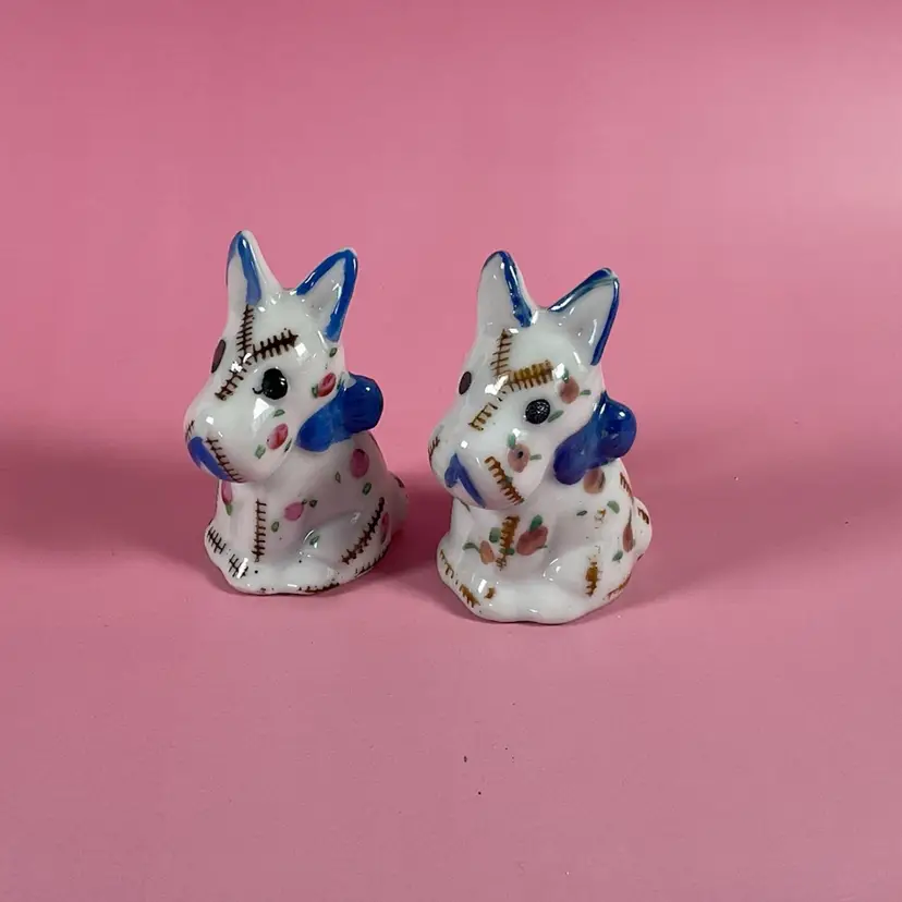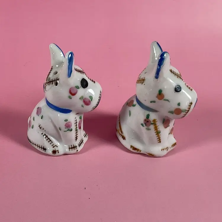 Vintage cute little set of Scottie dog salt and pepper shakers. They are decorated with a stitching and floral design. Very good pre owned condition with original stoppers. Made in Japan. Approximately 2.5” tall.