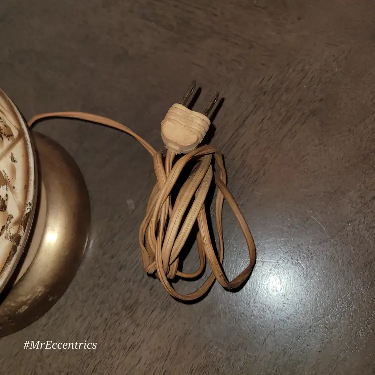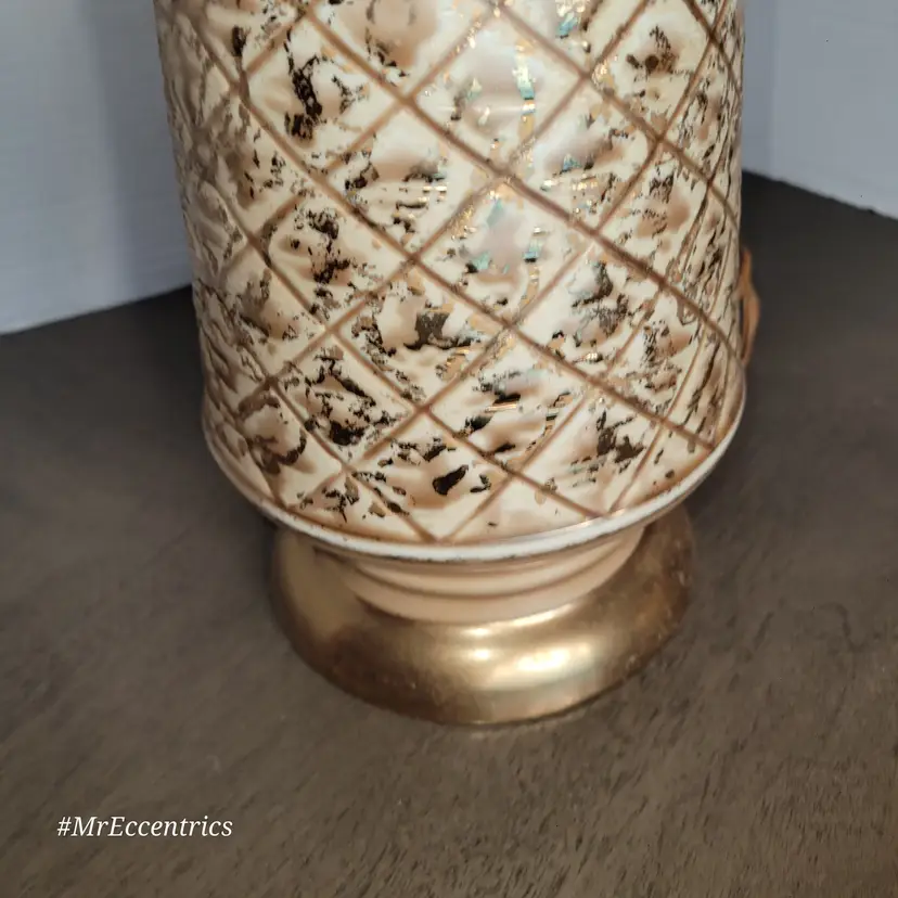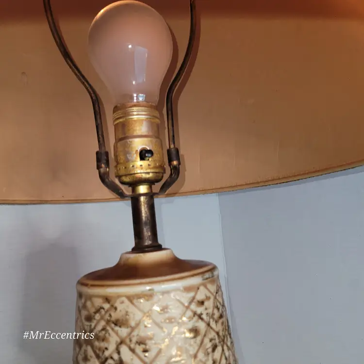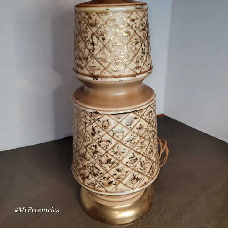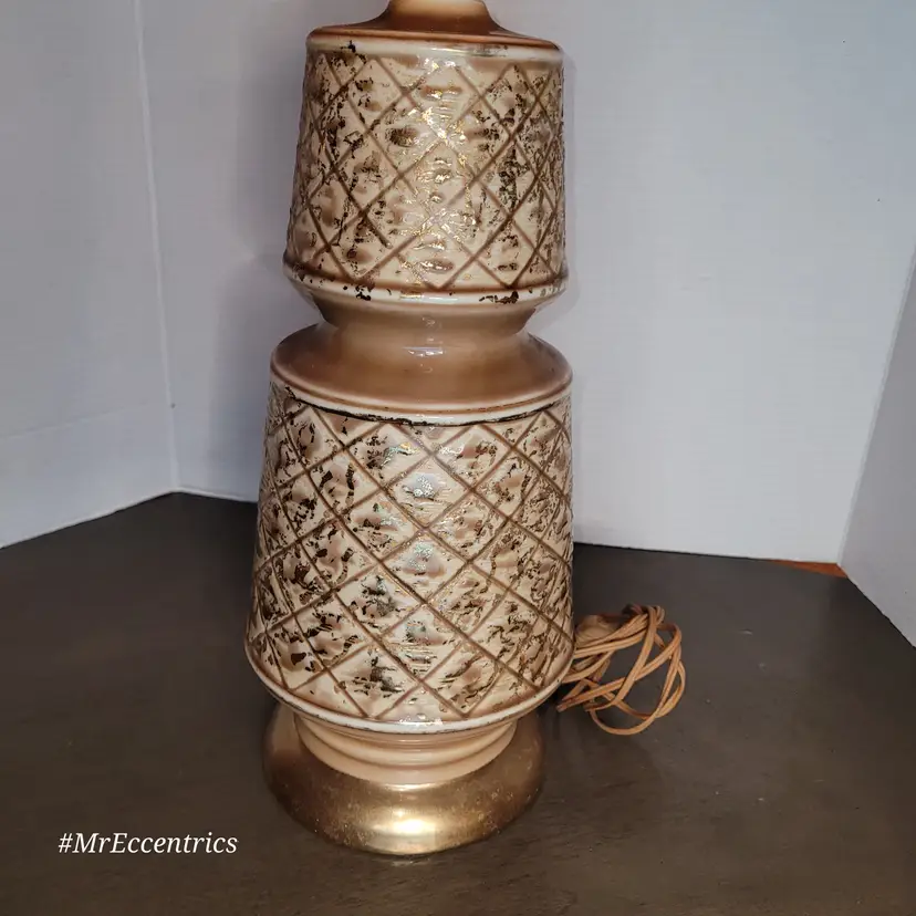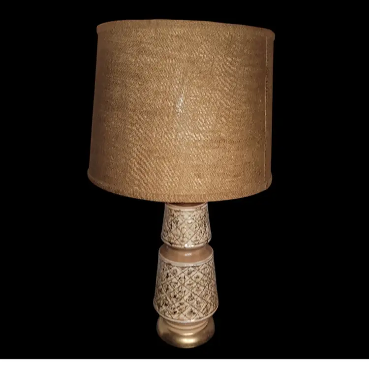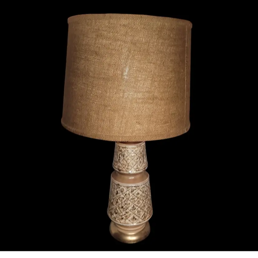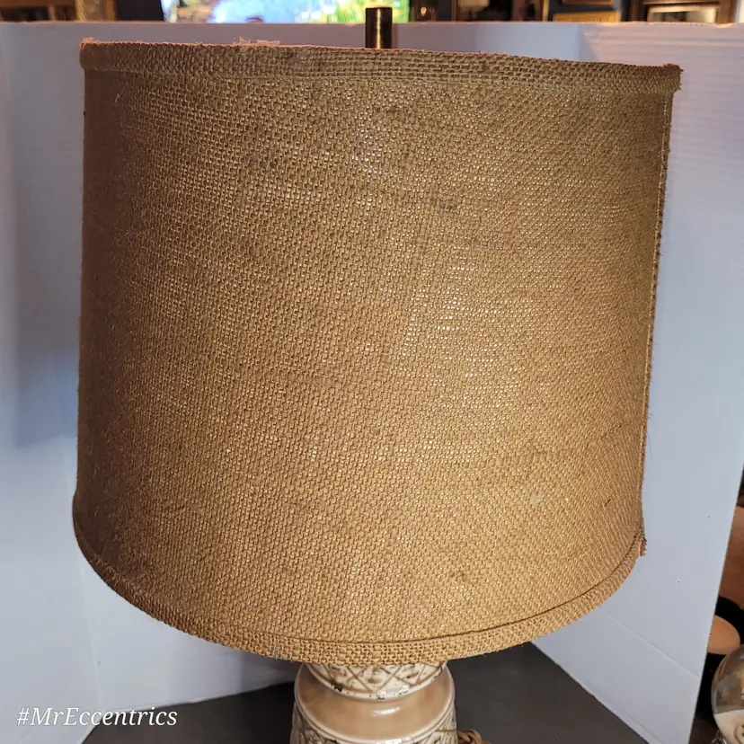 Lamp has no cracks or chips. Measures 27" tall. Includes burlap shade. Lamp is working