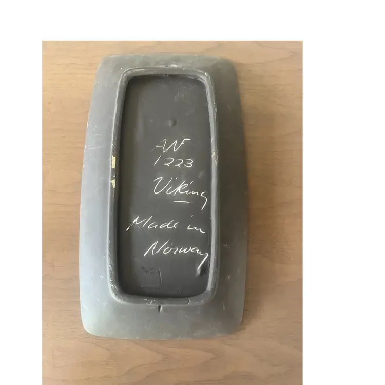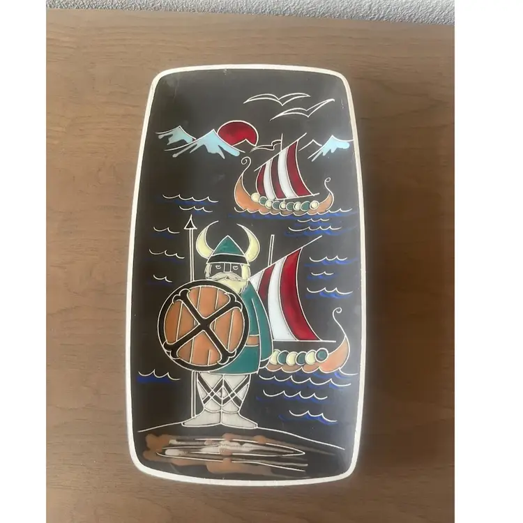 Mid-20th-century ceramic Viking motif wall plaque produced by Arnold Wiigs Fabrikker (AWF) in Norway. Design: Whimsical figural Viking and longships on a black matte background with glossy glazes. Dimensions: Approximately 12 1/2 inches tall by 7 inches wide. Era: Mid-century modern (1950s-1960s).