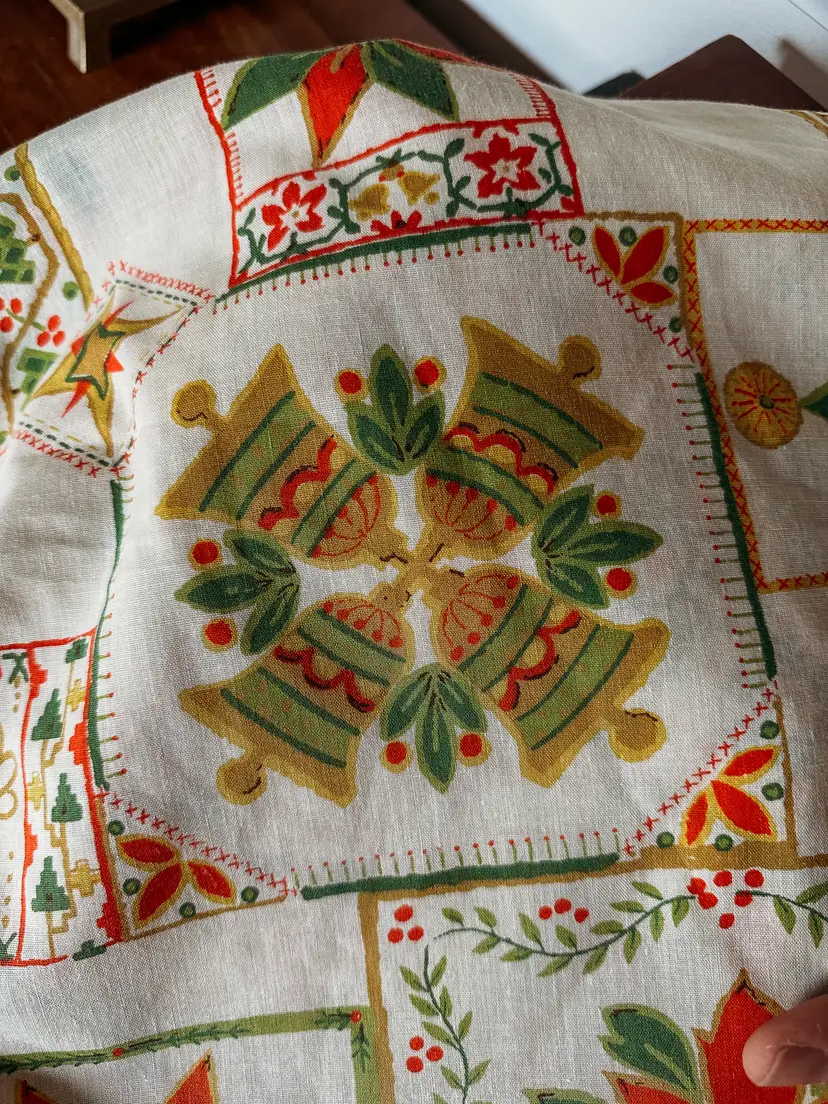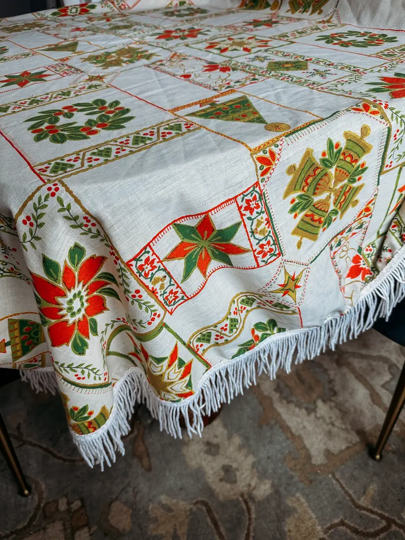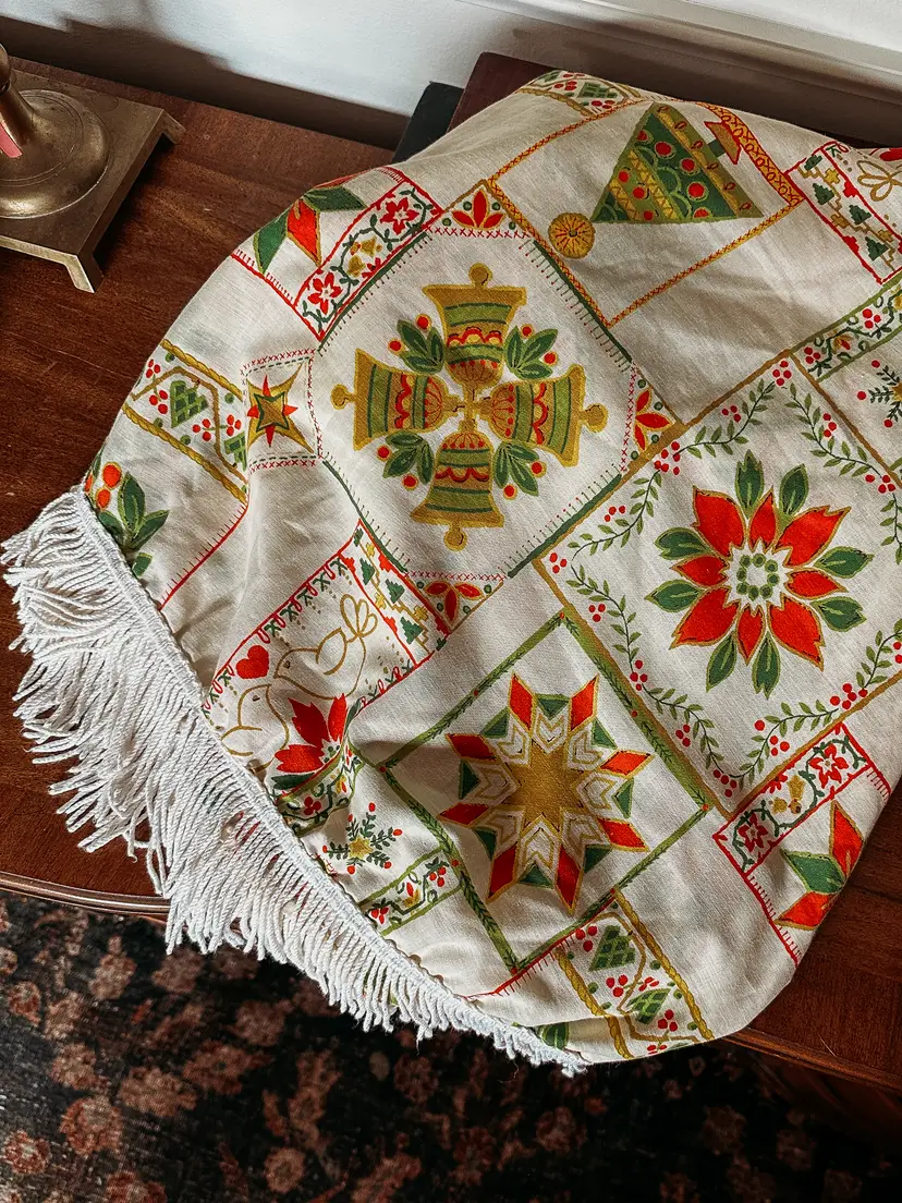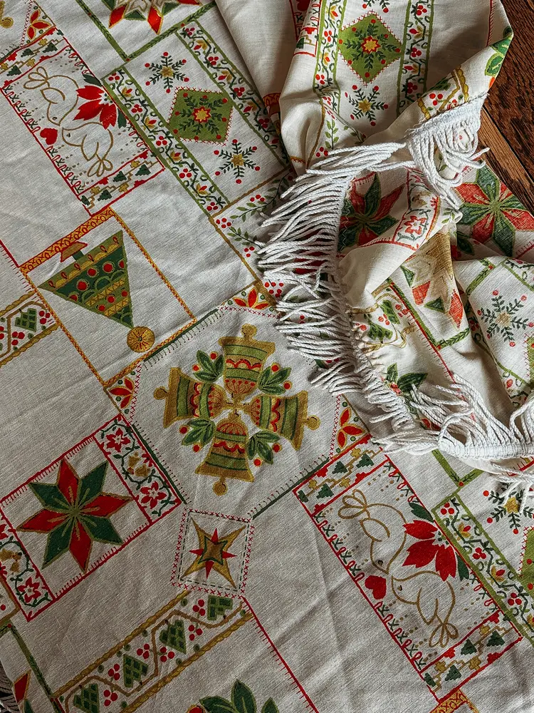 measuring 58" in diameter, this fringed tablecloth feels whimsically retro! Colors include red, yellow, gold, medium green and lime green.