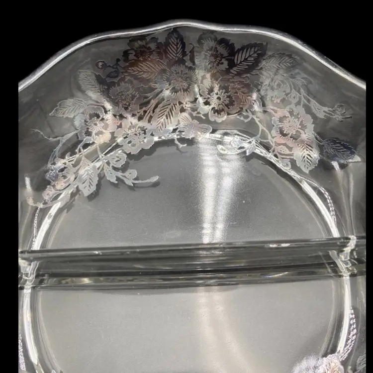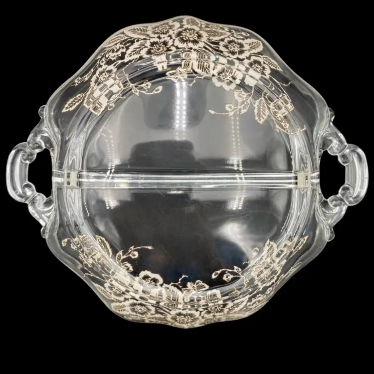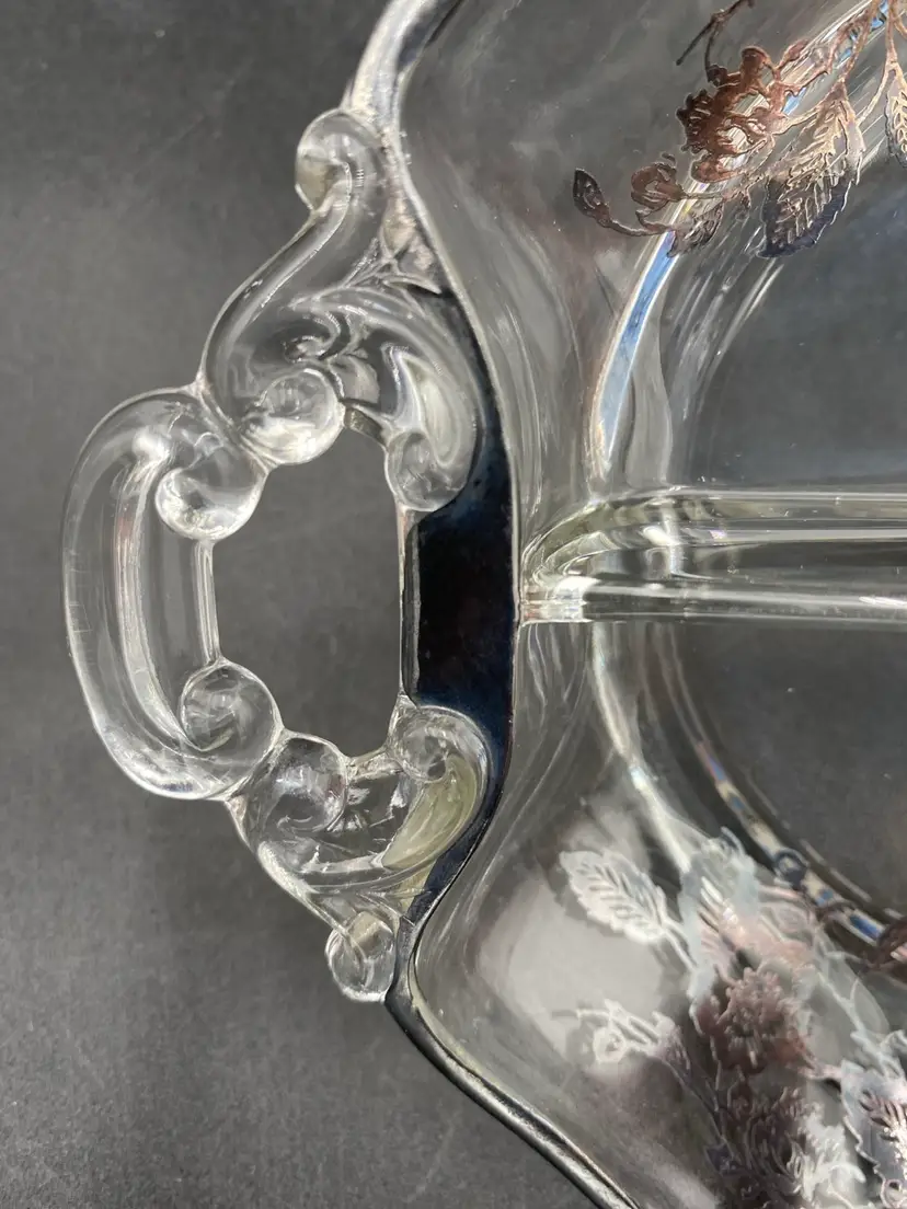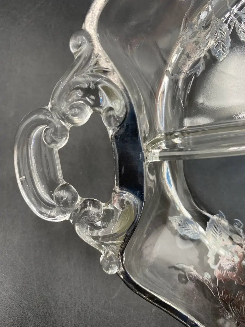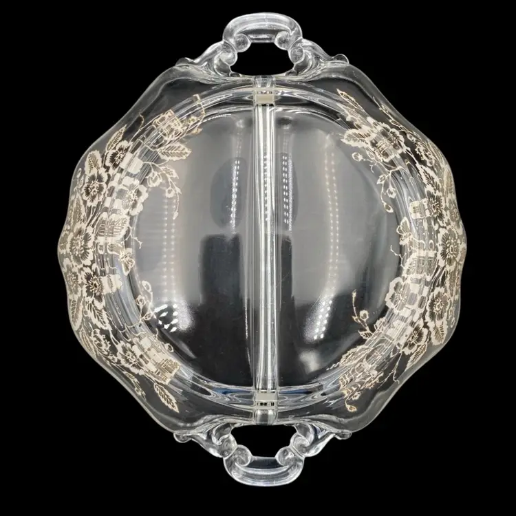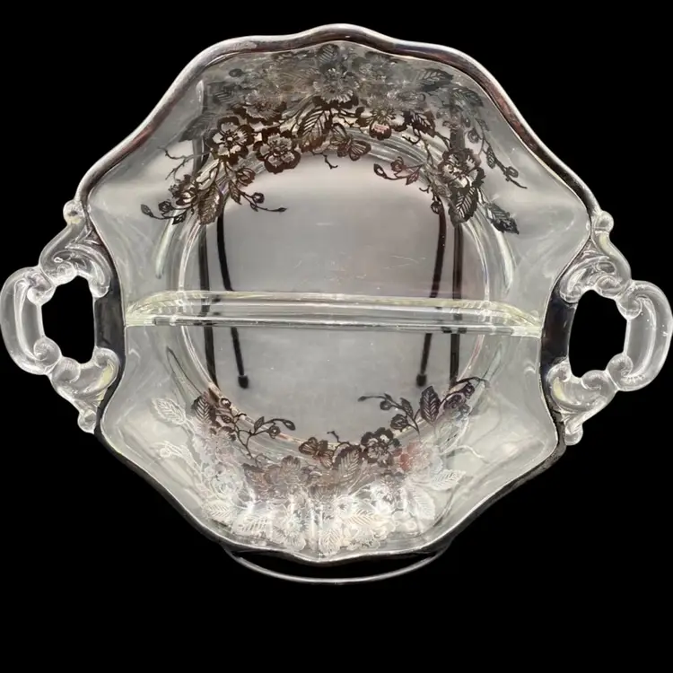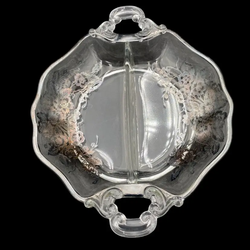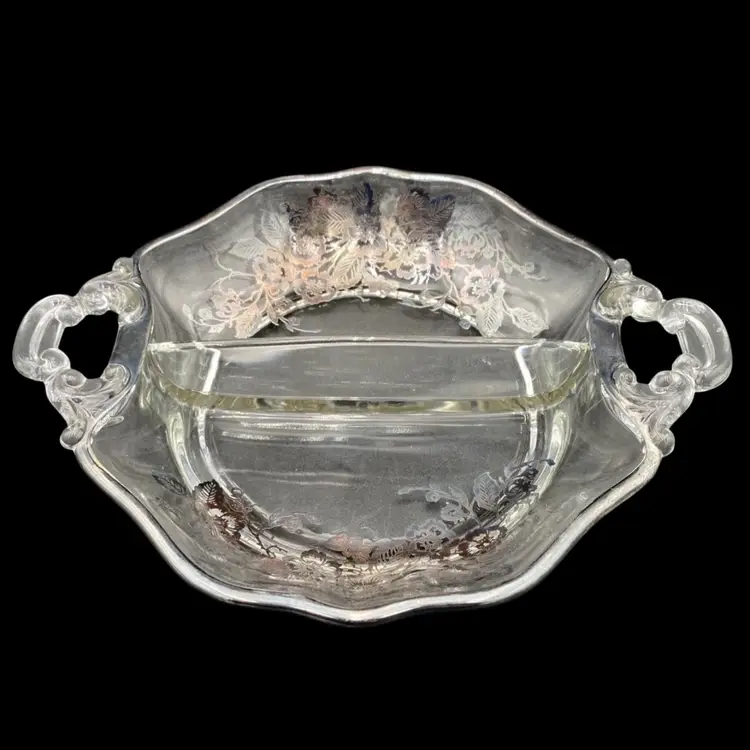 This exquisite divided serving dish is a perfect addition to your Mid Century Modern collection. Crafted with silverplate overlay in a beautiful classic rose pattern, this style dish is ideal for serving your favorite foods. The double scroll handles make it easy to carry and add to its elegance. The dish is perfect for any occasion and its age only adds to its charm.