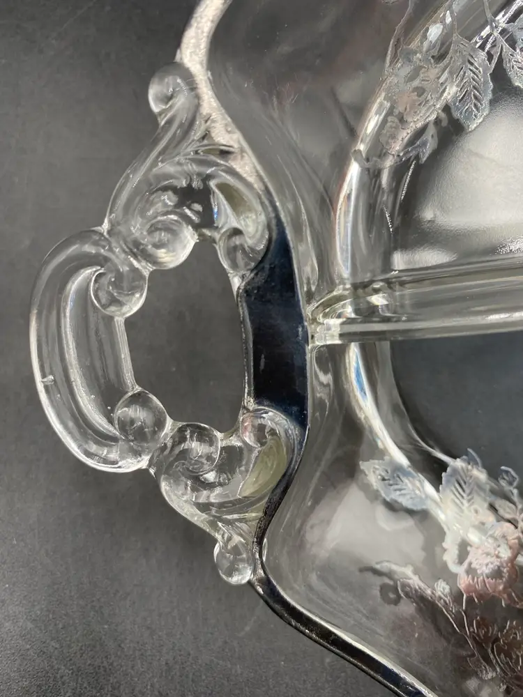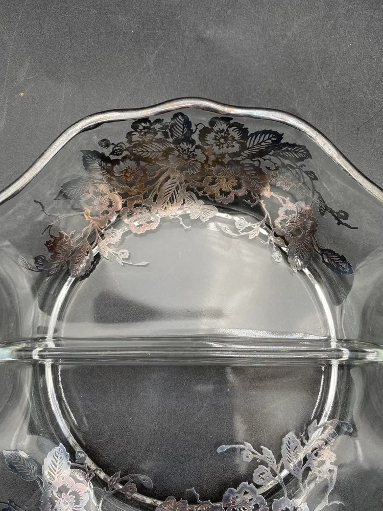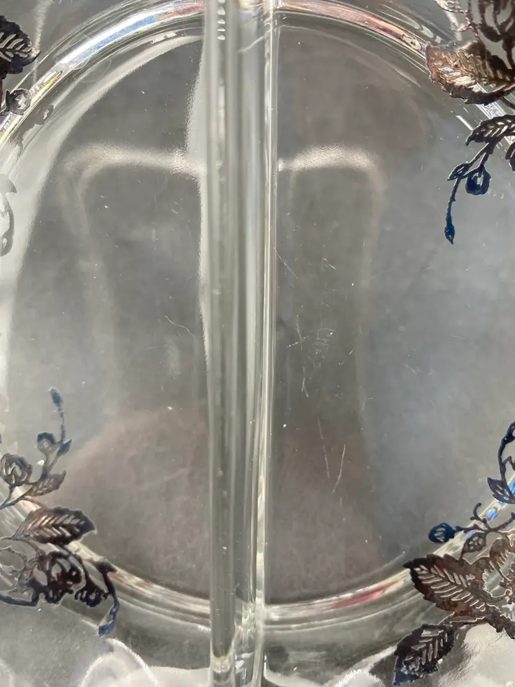 The divided serving dish is in very good used condition. The silver plating is intact. There is some tarnishing and a few spots of wear. There are no chips or cracks; there are some small surface scratches on the underside of the bowl. Please review all pictures for a complete sense of condition. Thank you!