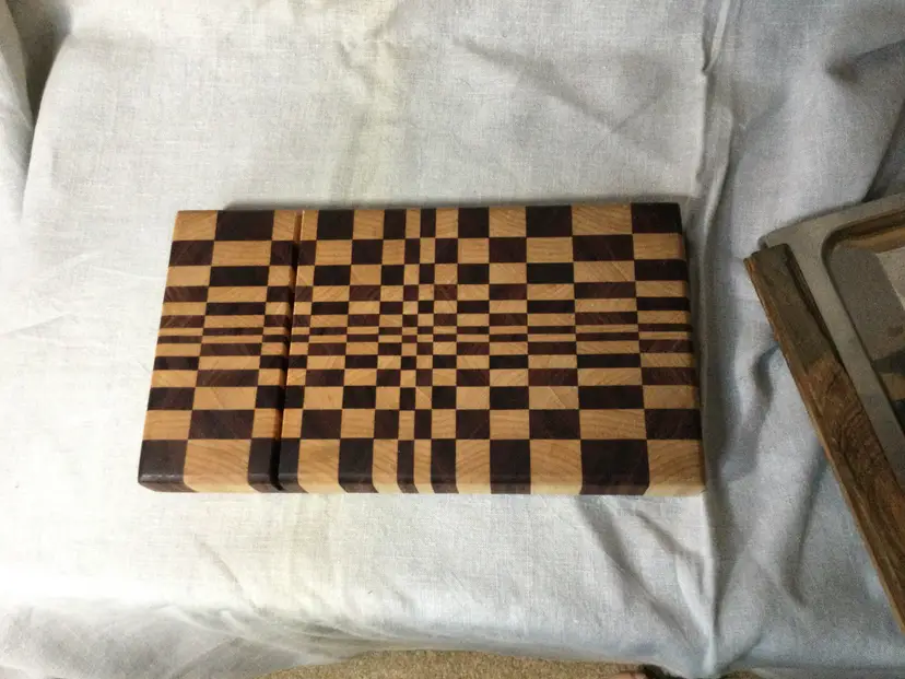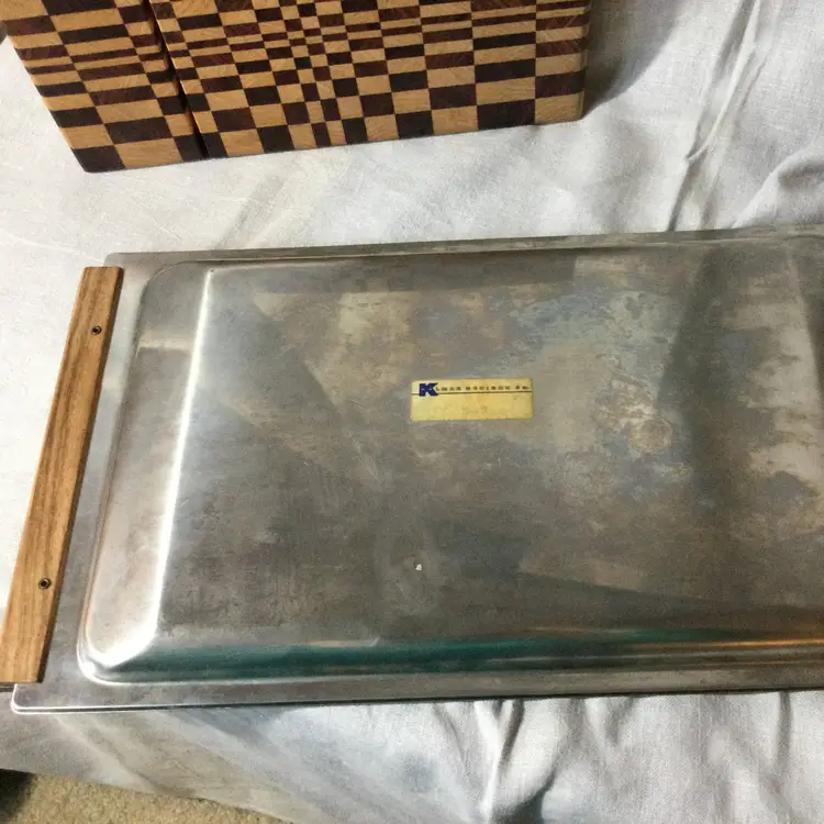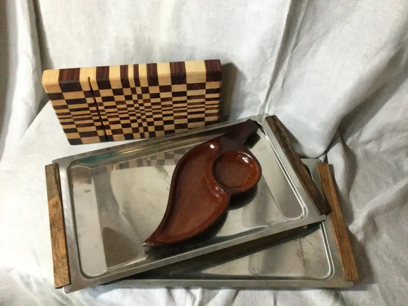 It's a set of pieces for your next dinner party with midcentury modern flair. A pair of stainless steel and teak serving trays, a hardwood butterfly cheese board, and a wooden nut dish from Haiti.