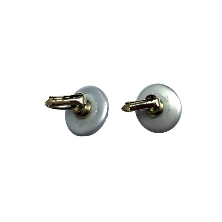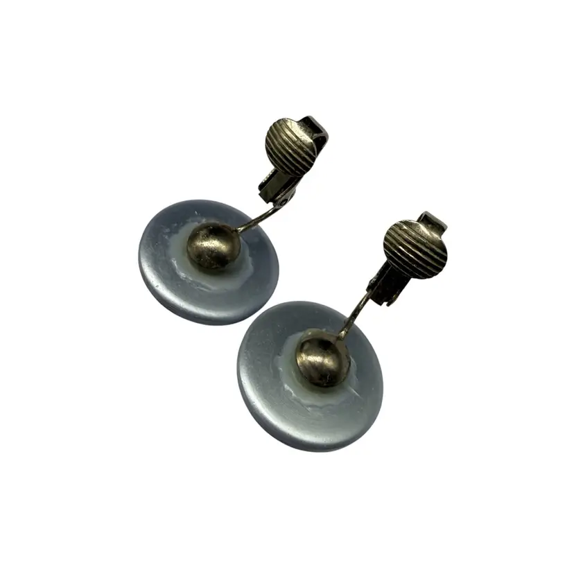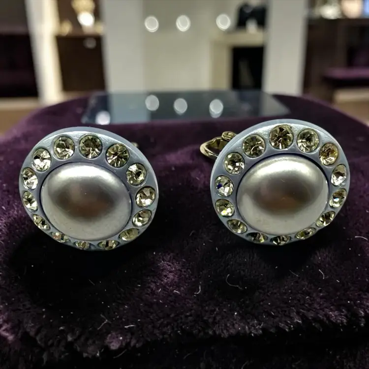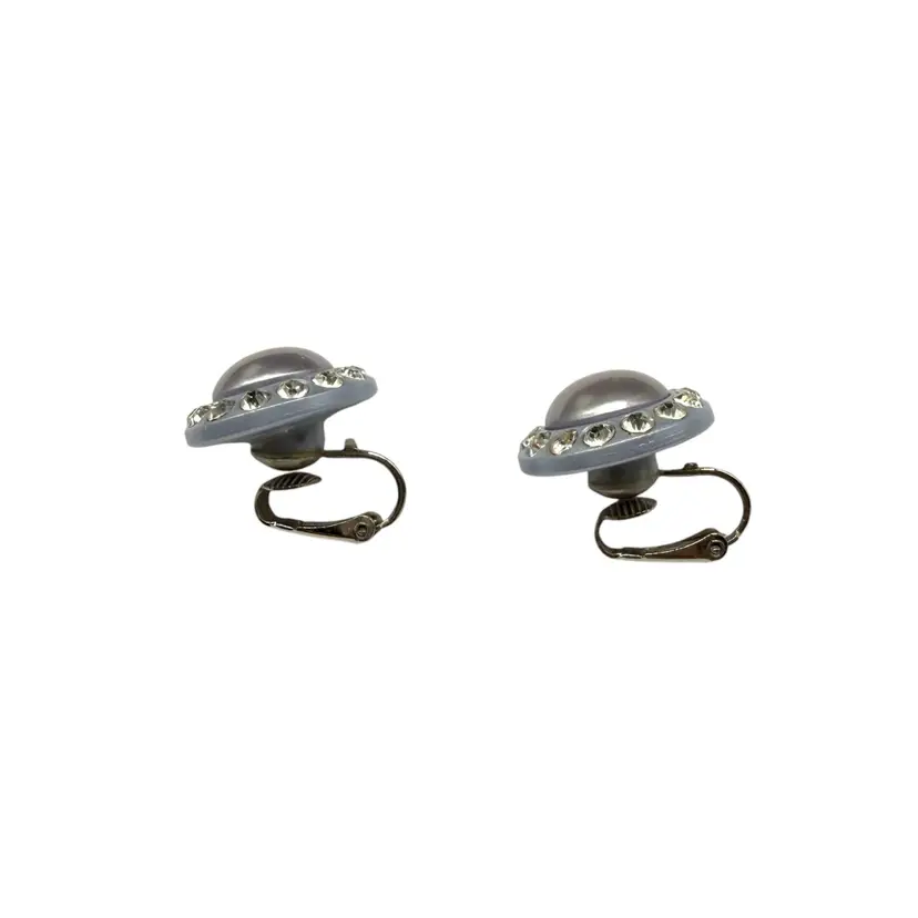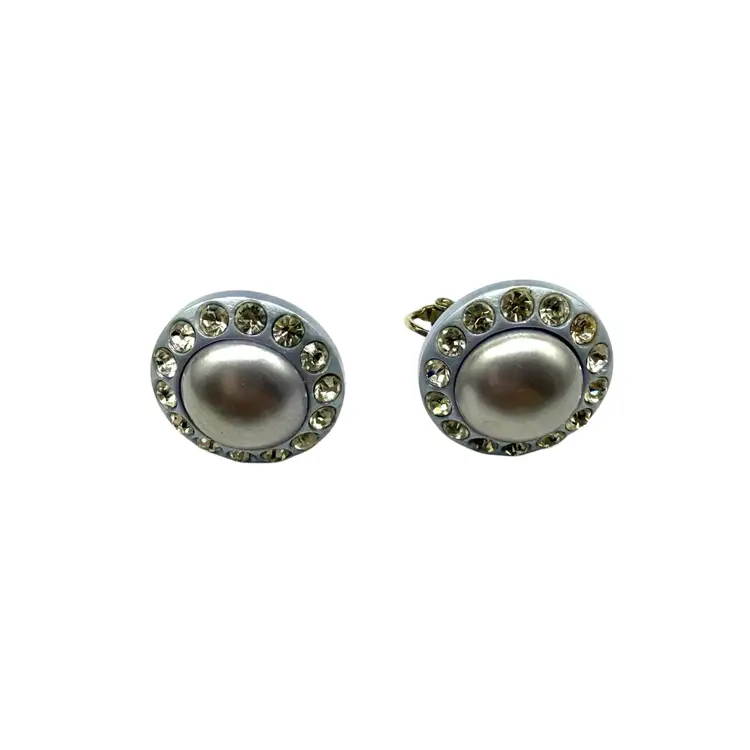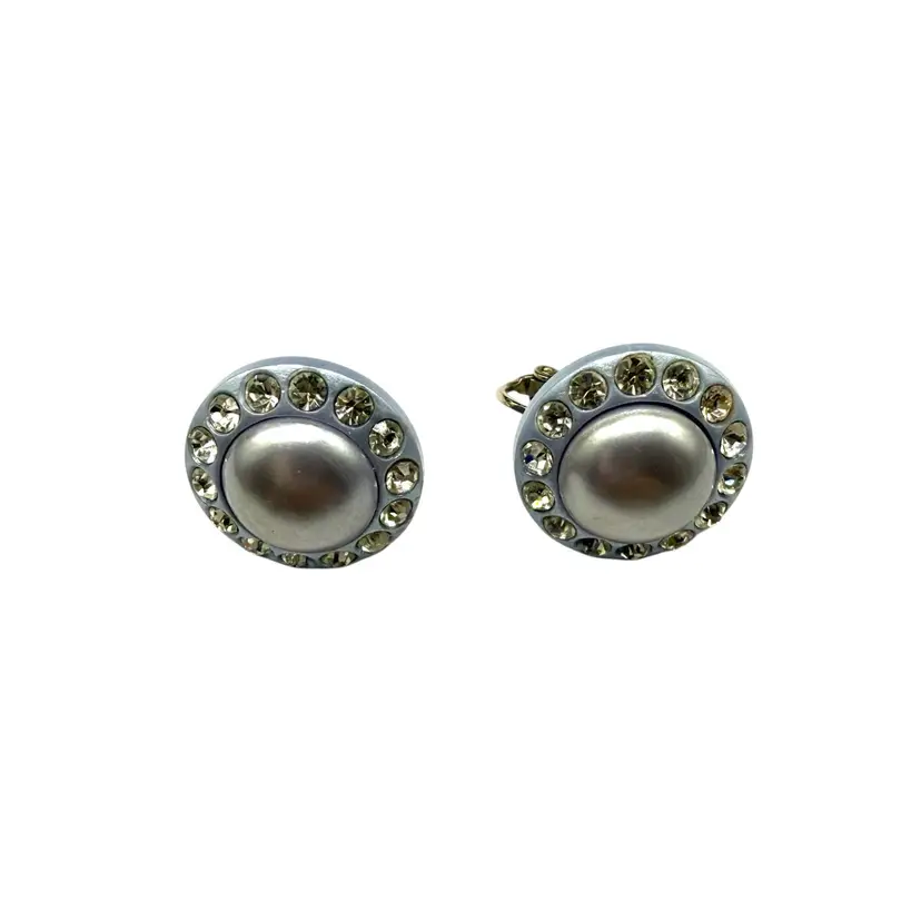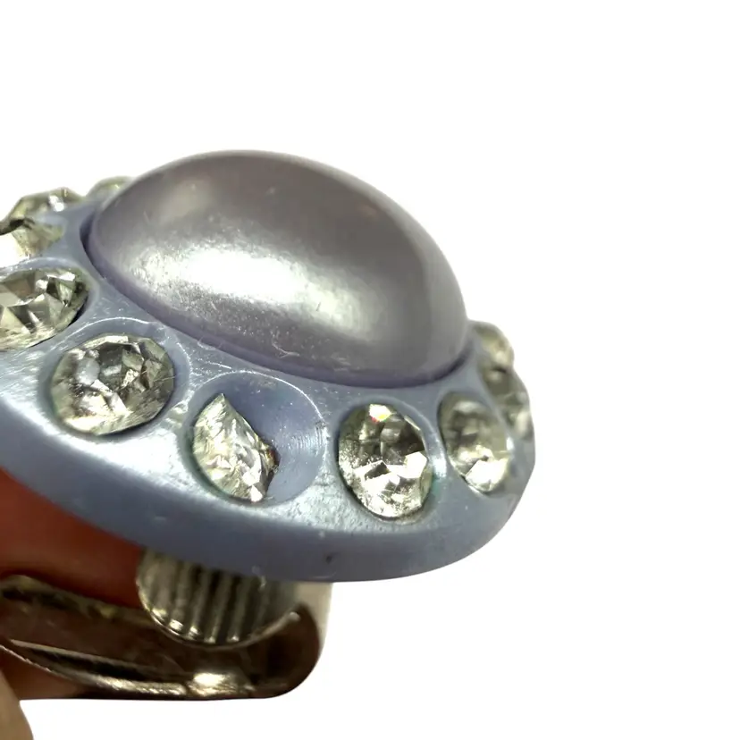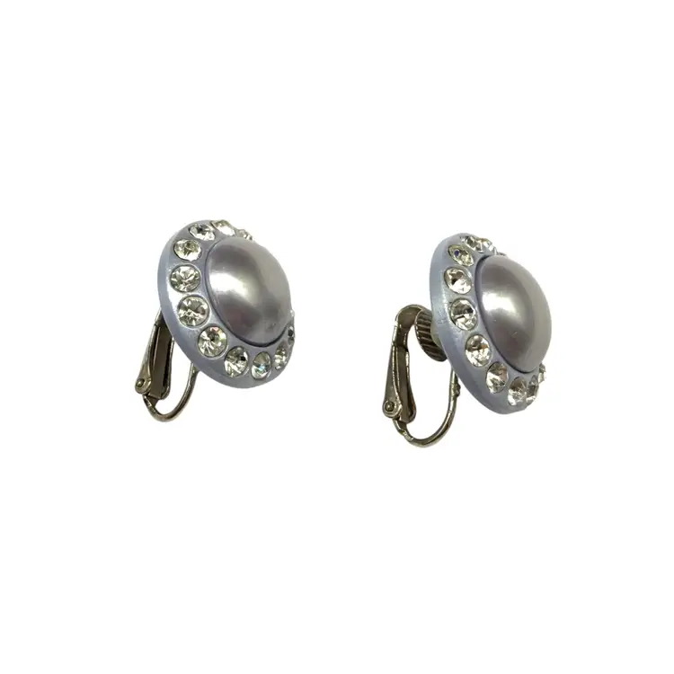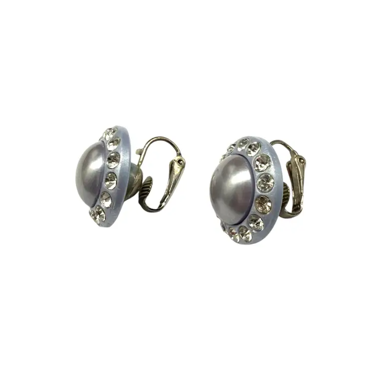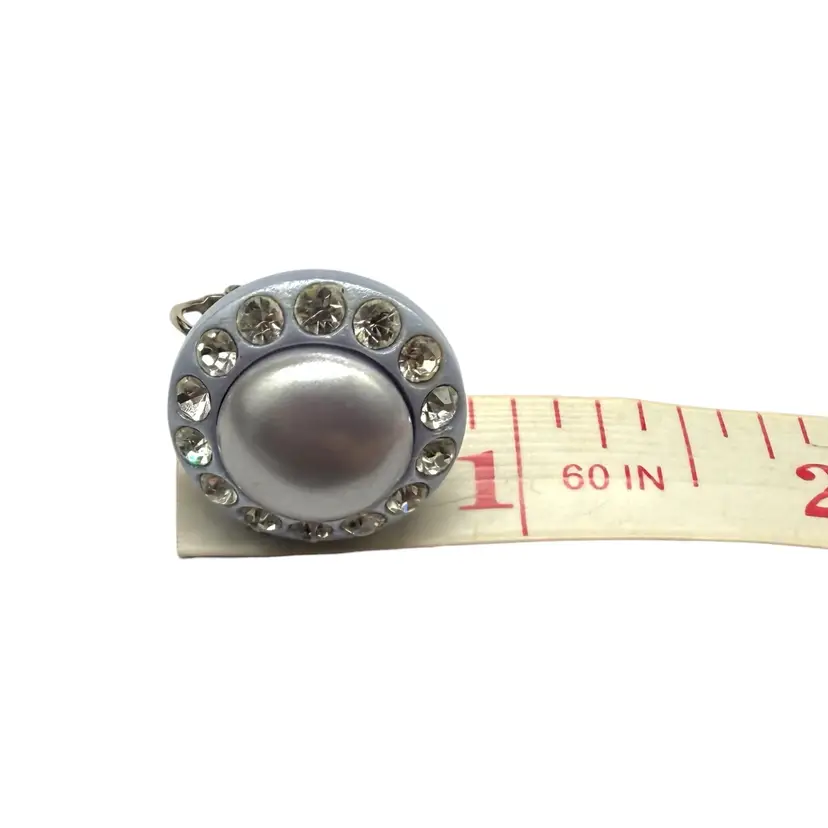 These MCM Faux Pearl Rhinestone Halo Clip On Button Style Earrings are a charming piece of vintage jewelry perfect for something blue. With a round imitation pearl as the main stone and a halo setting style, these earrings exude a feminine and ethereal vibe. The pastel blue color and retro design make them a lovely choice for brides or those looking to add a touch of glamour to their outfit. Made of plastic and rhinestone, these 1-inch earrings are a must-have for fans of vintage and mod style jewelry.