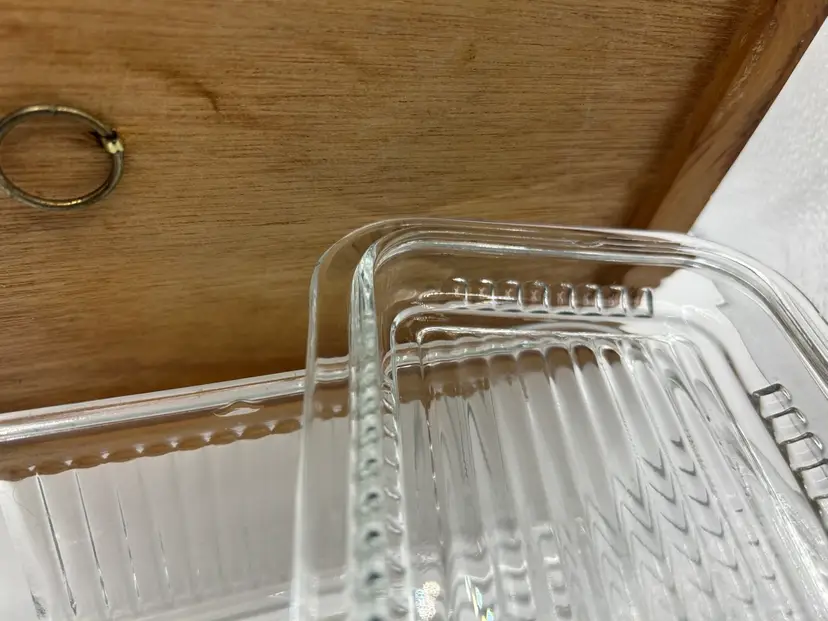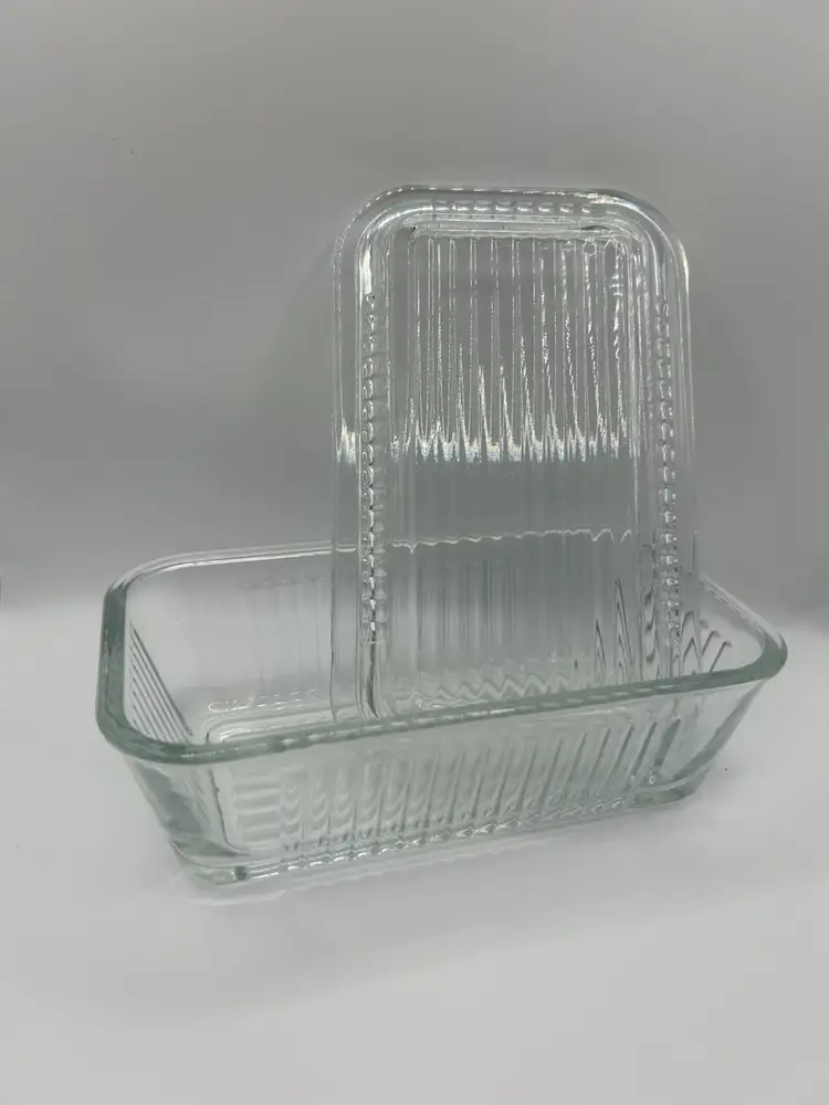 Ribbed clear glass dish with matching lid. Has 2 chips, one where top of dish meets lid and the other where lid meets top of dish at one end. Good condition.