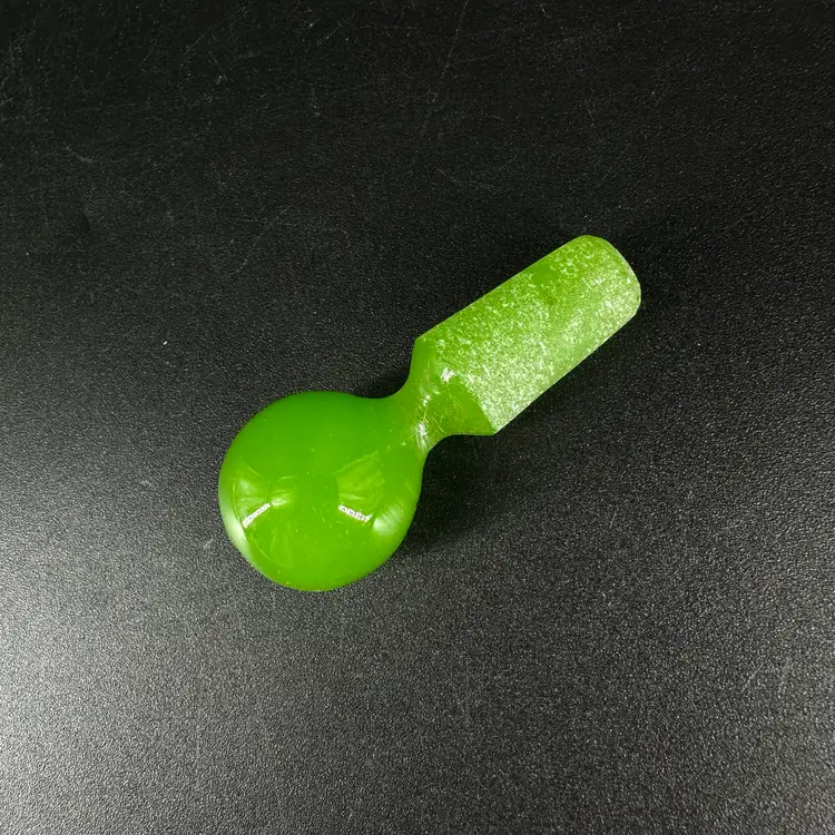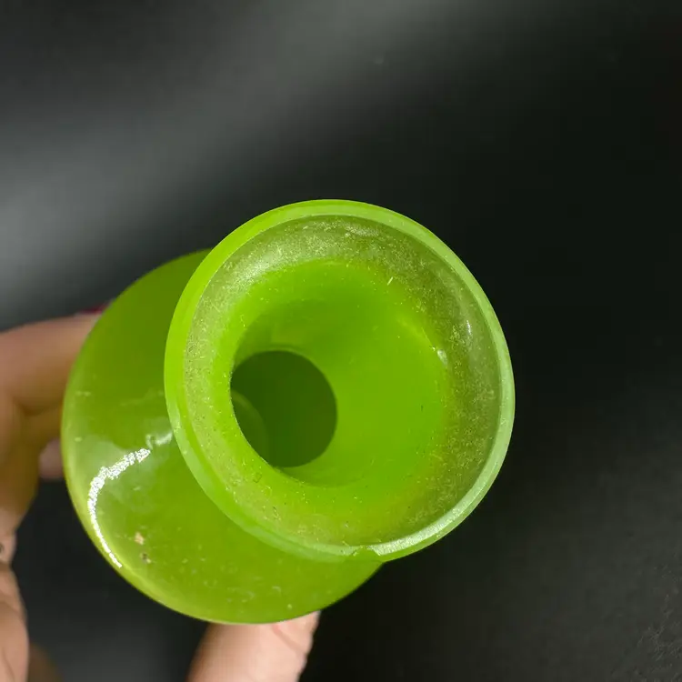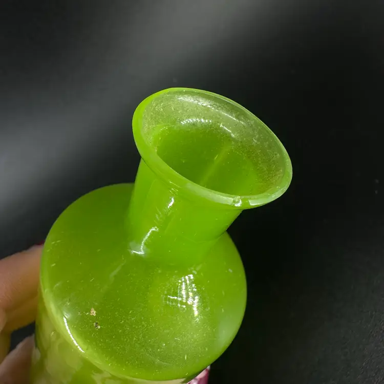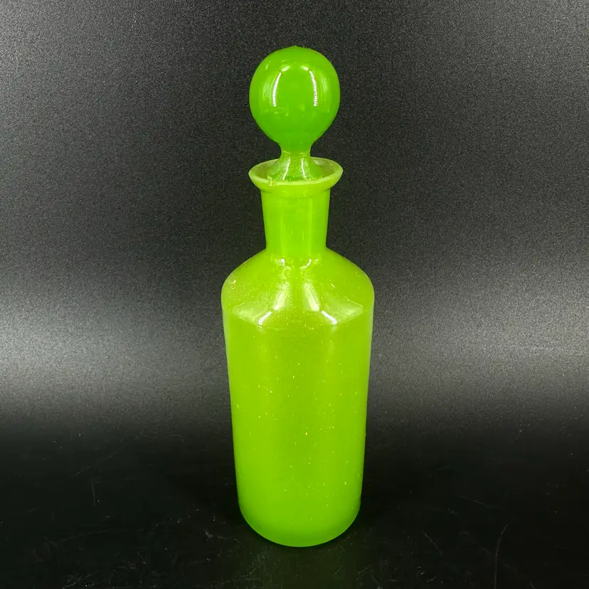 MCM lime green glass perfume bottle with spherical stopper. No cracks. SMALL CHIP on rim of opening--see photos. Bottle with stopper measures approximately 6.5” tall. No markings or signatures.