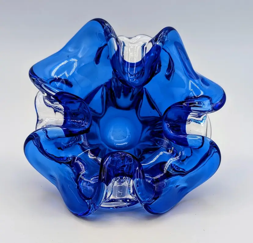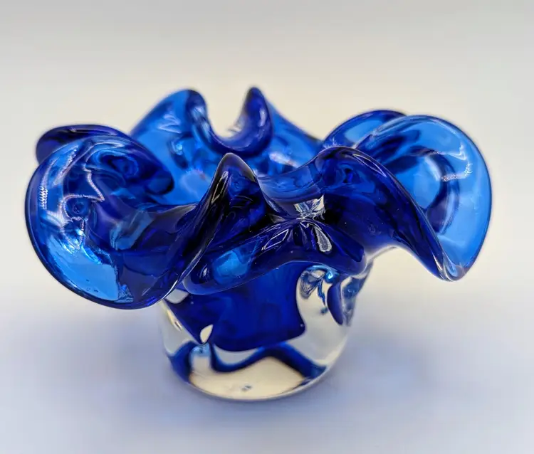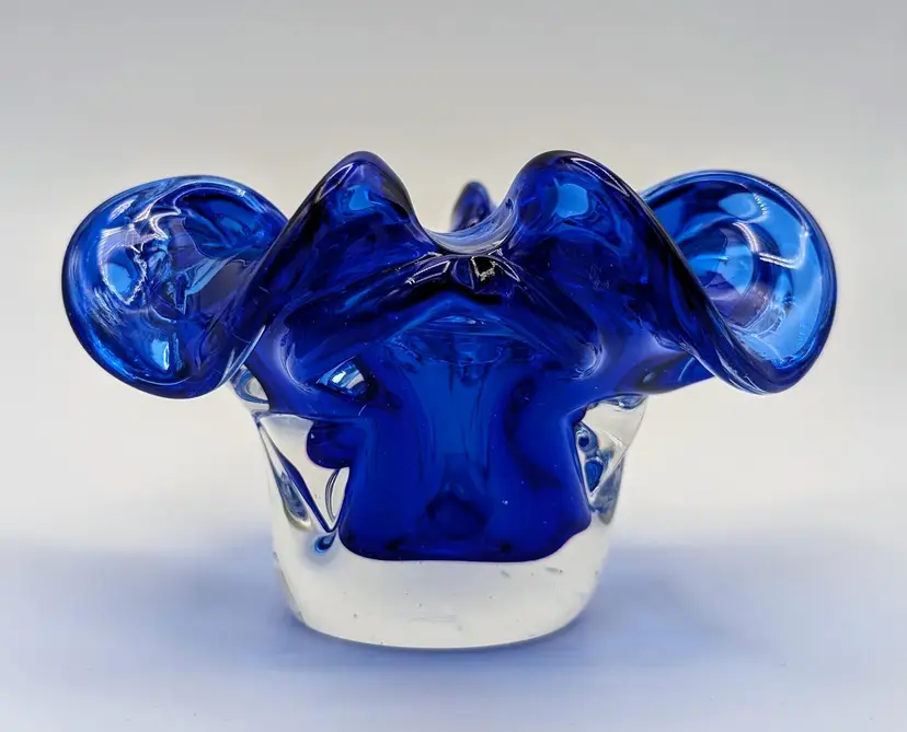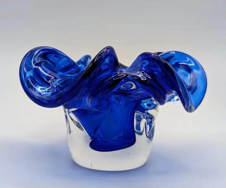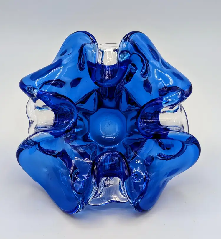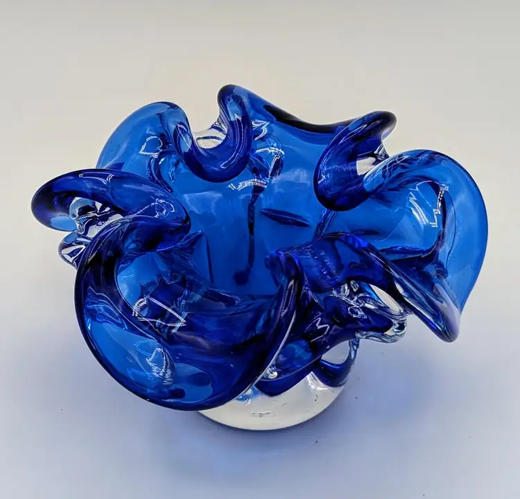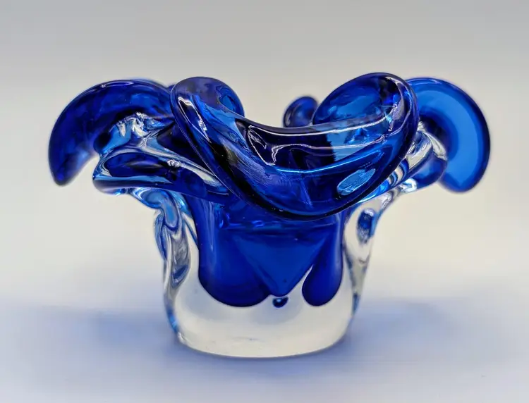 This piece is unmarked but has the quality and characteristics of Murano, Chalet or Lorraine Art Glass. Deep colbalt blue is so vibrant and bright against the clear glass and the light refections are gorgeous. Stunning piece! Excellent Used Condition. Few scratches and small flea bite on underside of base. See pictures for details. Measures approx. 6" wide diameter x 3.75" high.