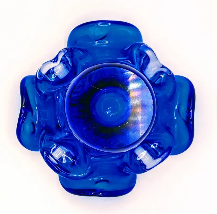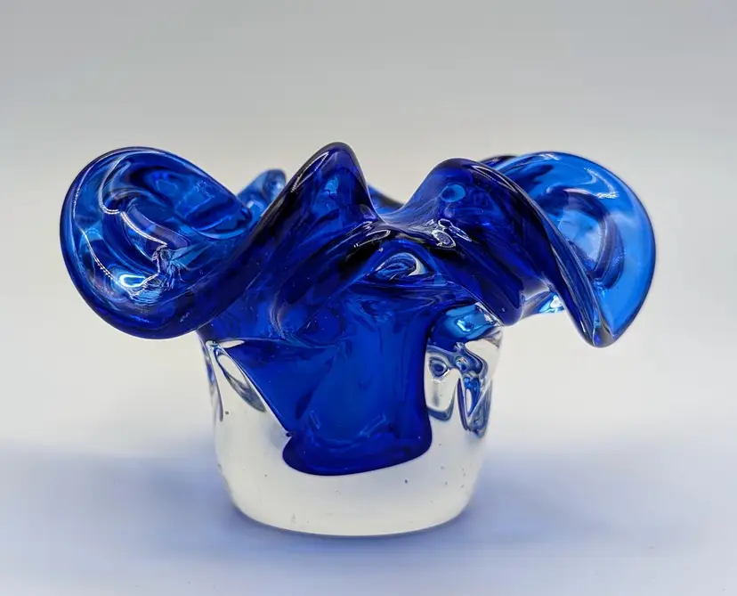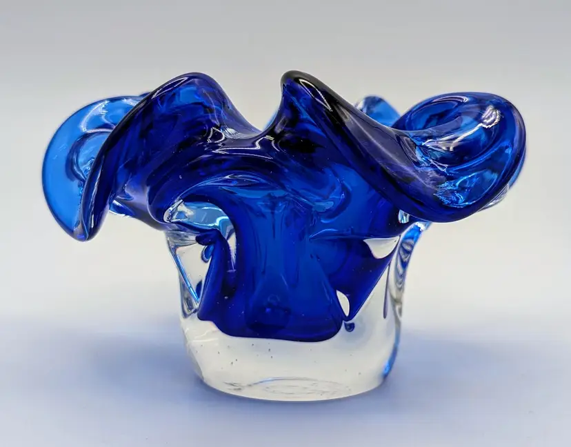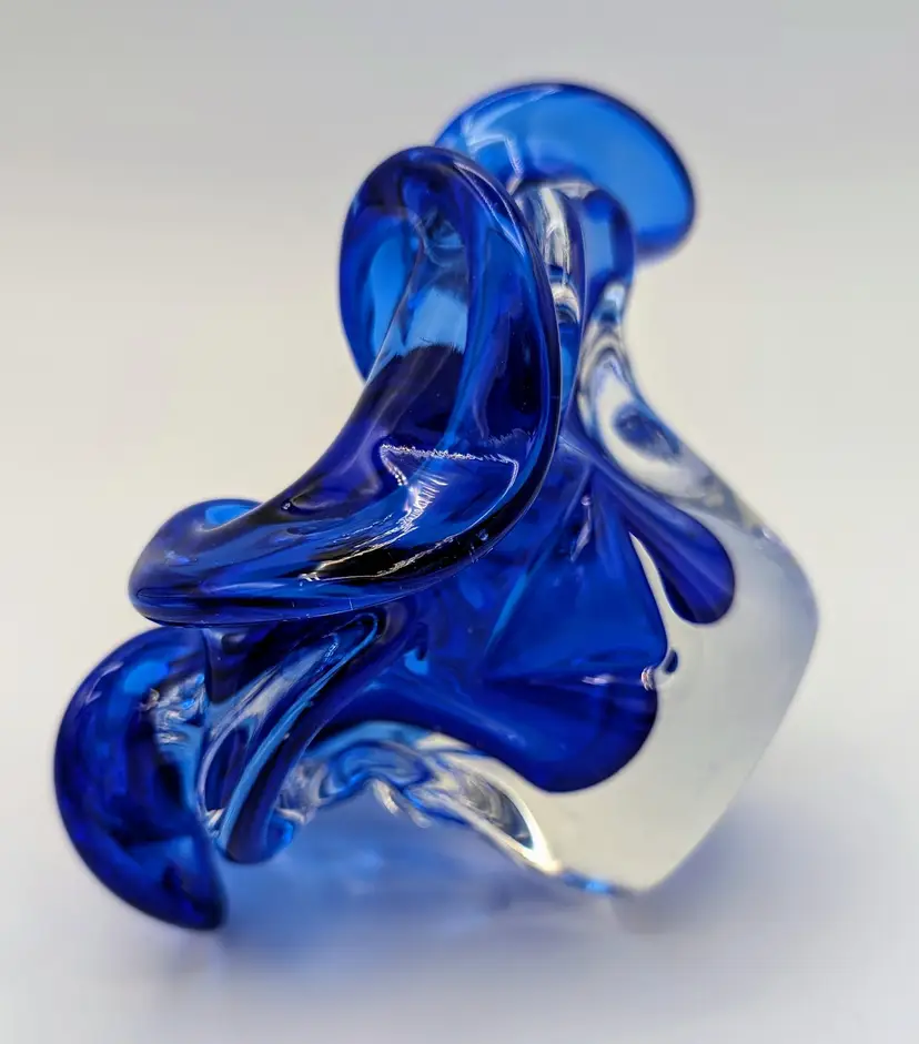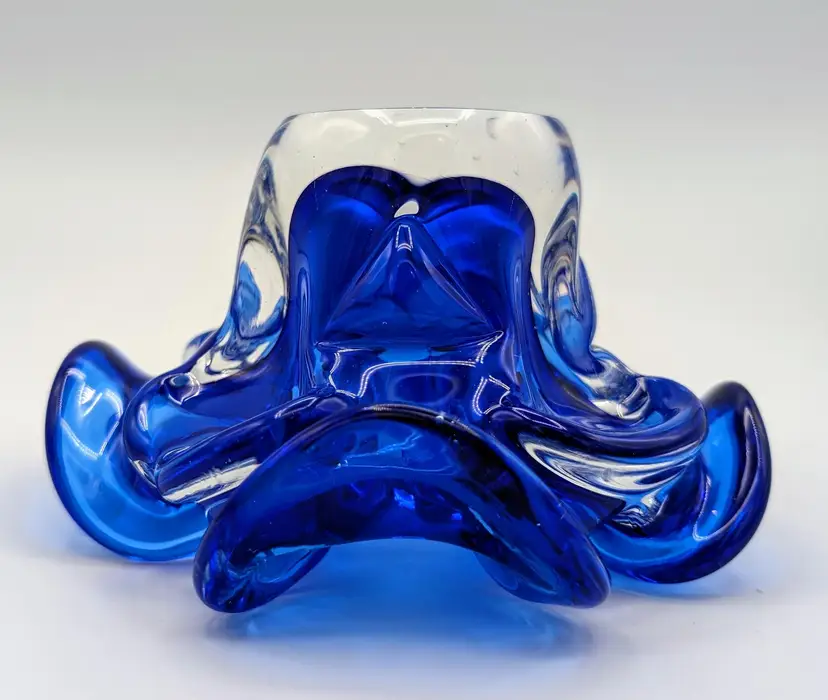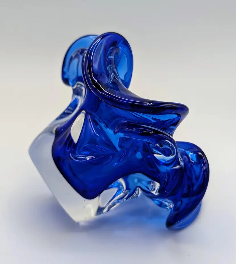 This piece is unmarked but has the quality and characteristics of Murano, Chalet or Lorraine Art Glass. Deep colbalt blue is so vibrant and bright against the clear glass and the light refections are gorgeous. Stunning piece! Excellent Used Condition. Few scratches and small flea bite on underside of base. See pictures for details. Measures approx. 6" wide diameter x 3.75" high.