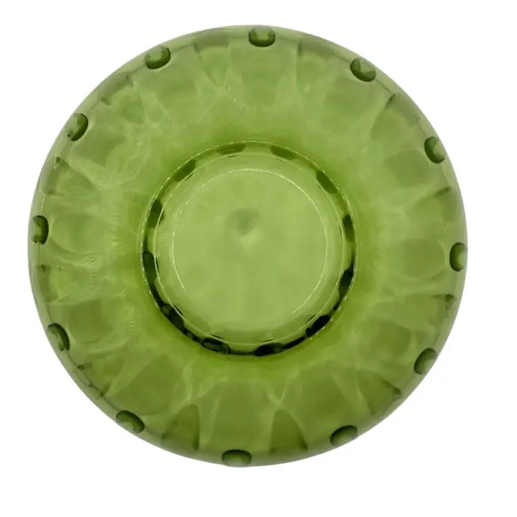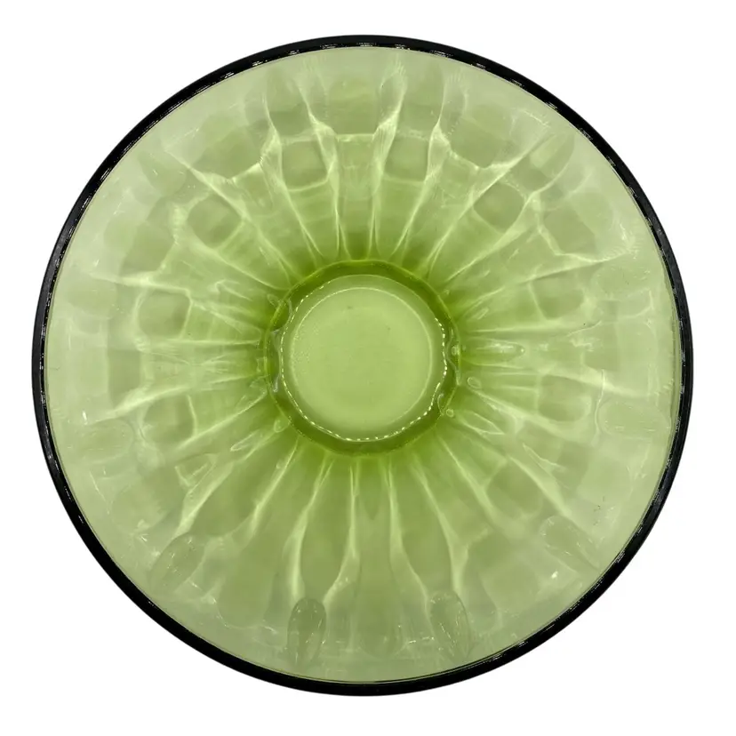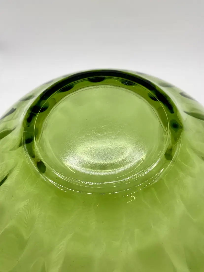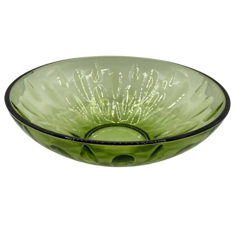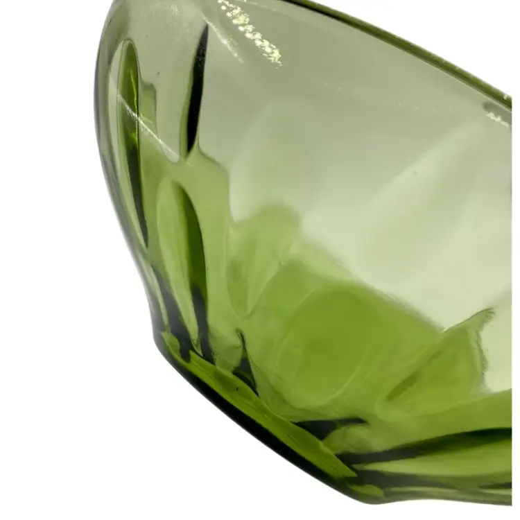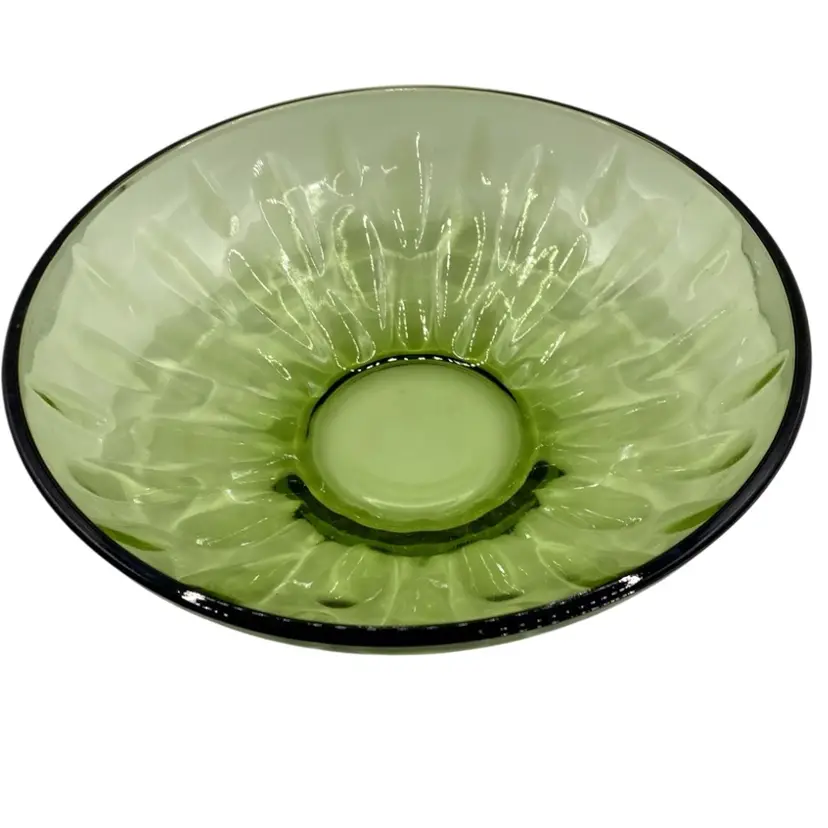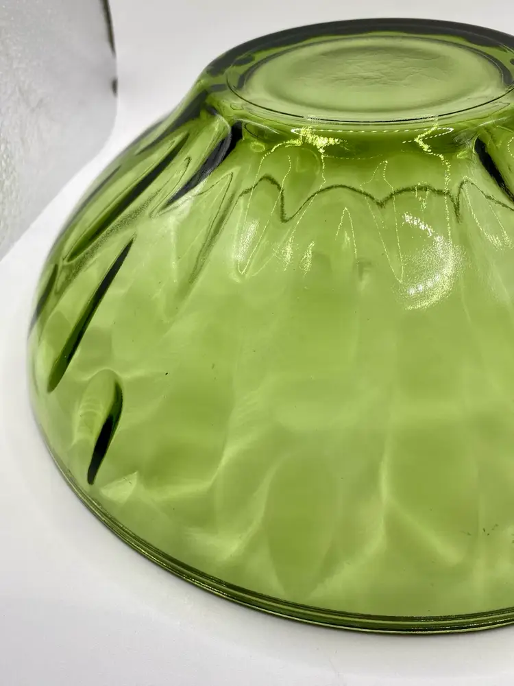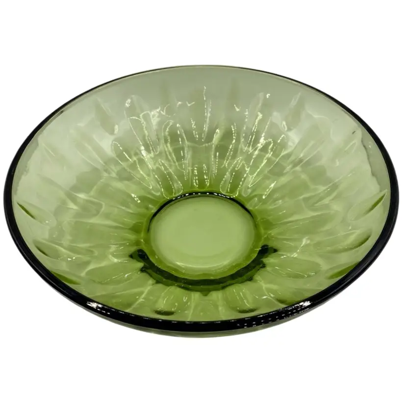 This vintage Hazel Atlas glass bowl, produced in the 1970s, features a lovely avocado green finish with a unique elongated thumbprint pattern. Measuring 9 inches in diameter and 3 inches in height, this mid-century modern piece is both decorative and useful, making it a perfect addition to any home decor or kitchen collection. Crafted using a pressed glass production technique, this original Hazel Atlas bowl is in excellent condition and has been well-maintained over the years. There are no chips, cracks or signs of wear.
